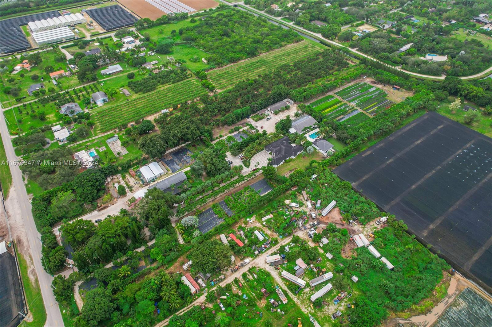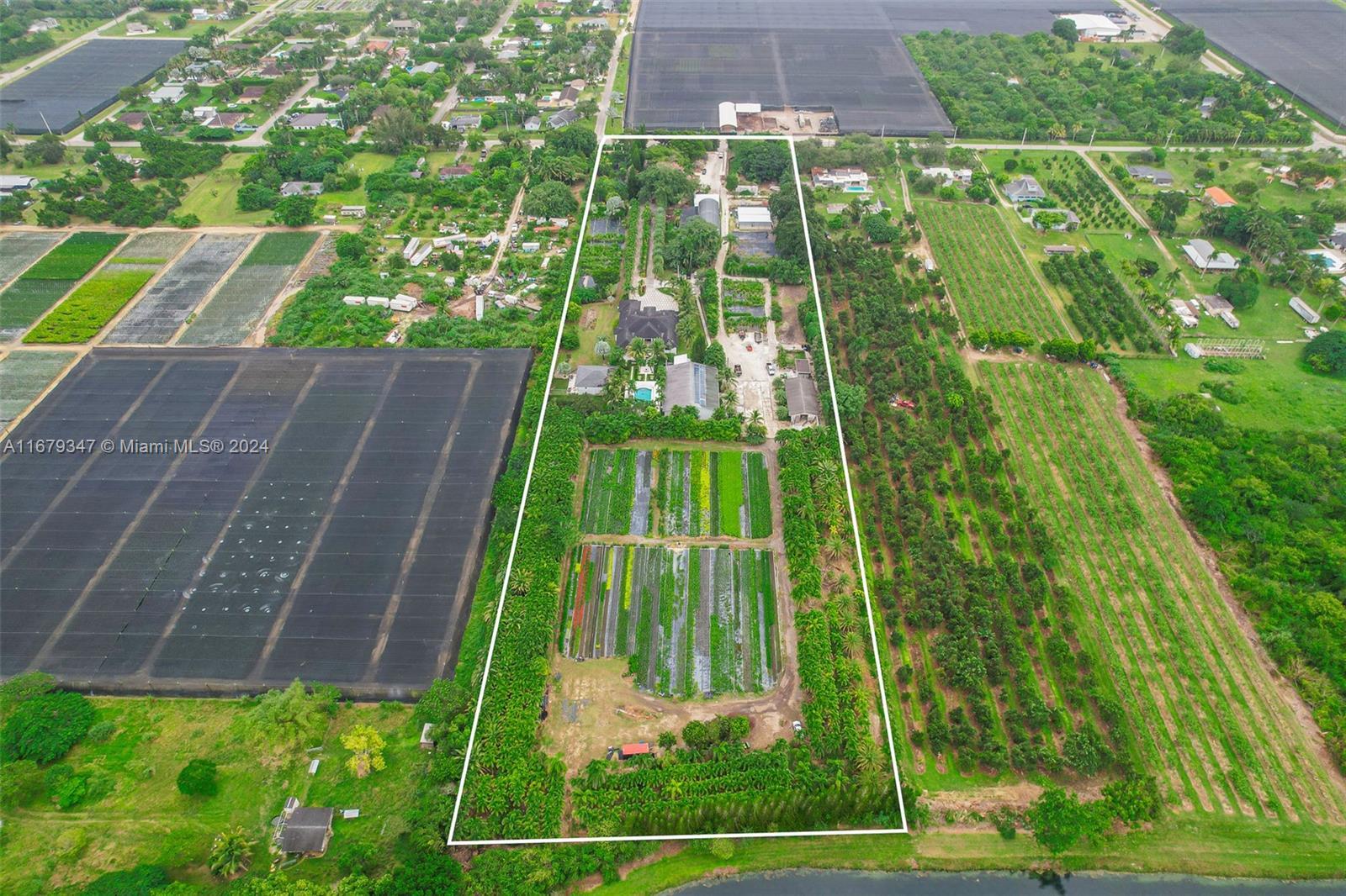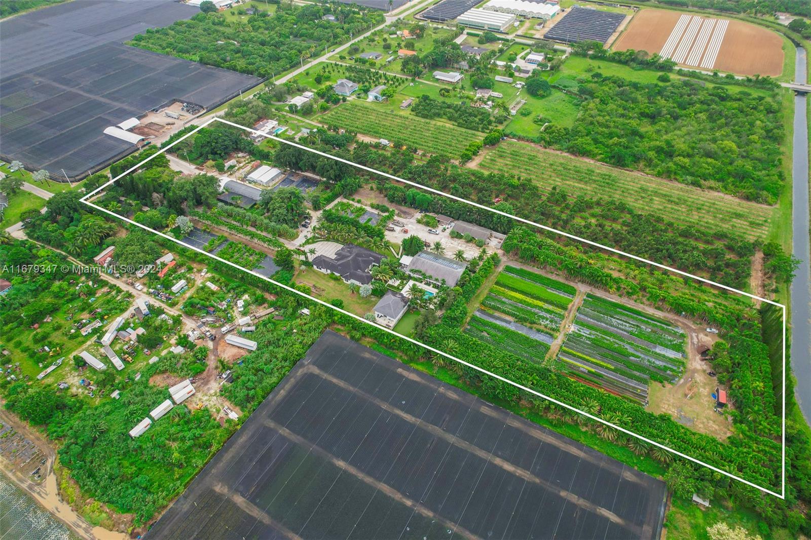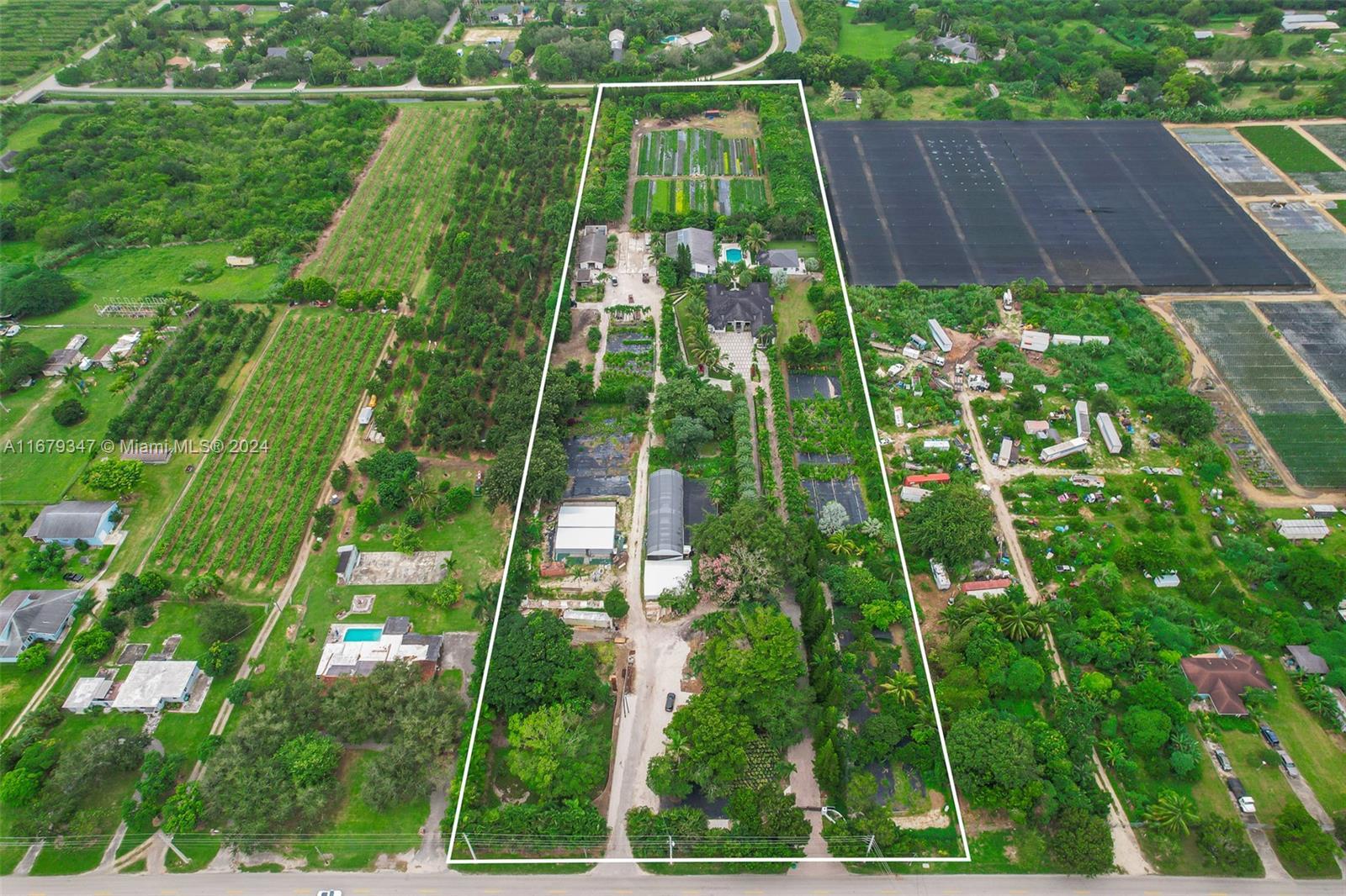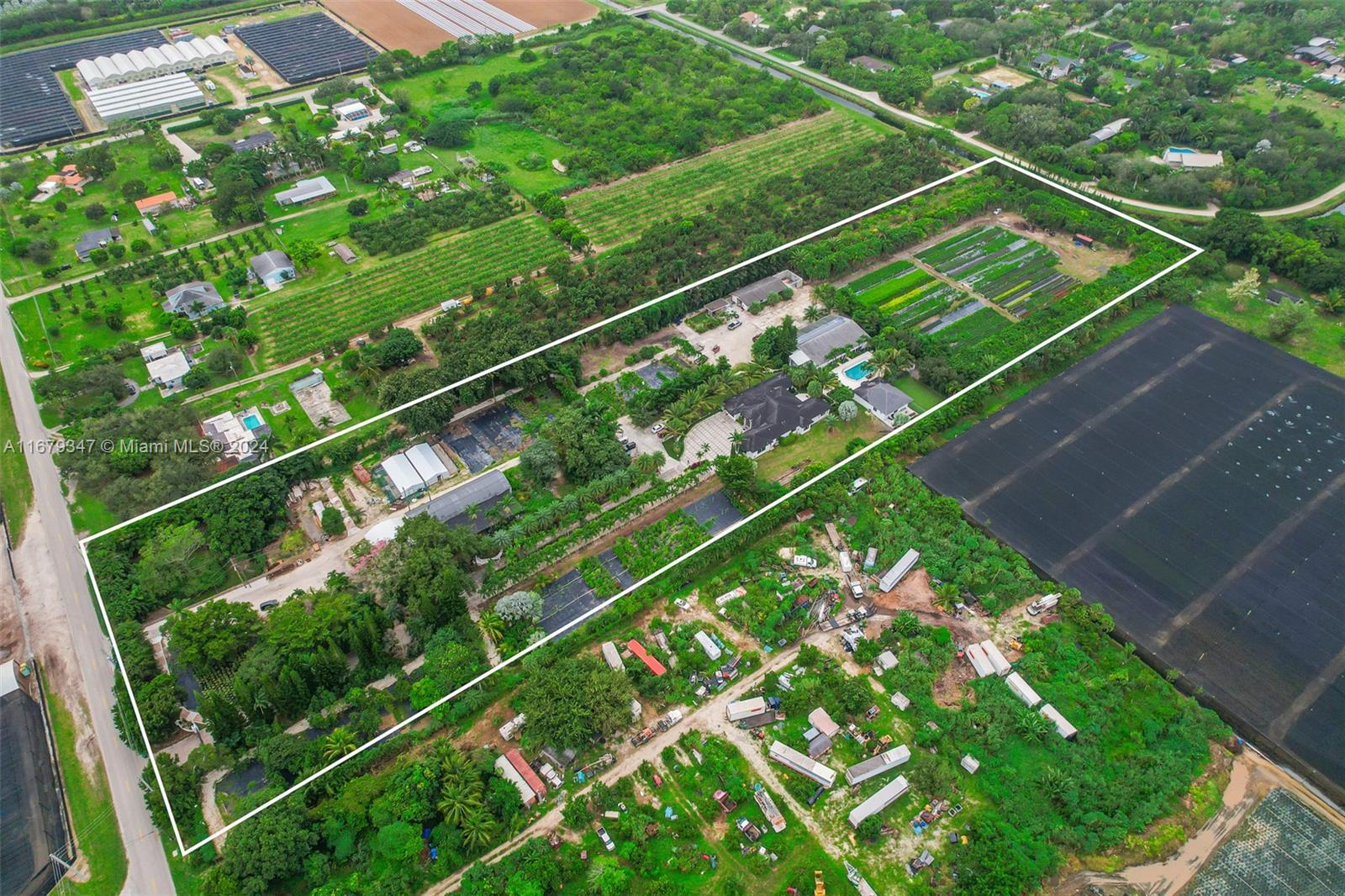This impressive 10-acre Redland estate was meticulously constructed in 2017. It includes a 1,400 sq ft guest house. The primary residence spans over 5,583 sq ft with impact doors & windows. It features 4 bedrooms, 4.5 bathrooms, an office and a 2 car garage. Formal dining and living room has a built-in bar area, offering an elegant space. Each bedroom includes a private bathroom and walk-in closet. The chef's kitchen with solid wood cabinets and exquisite white quartz countertops. The expansive family room leads to an outdoor built-in BBQ and patio area. Travertine patio floors, pool, and fireplace area, ideal for hosting guests. This estate offers the privilege of residing in your own private paradise with a variety of tropical plants that allow you to experience nature at its best.