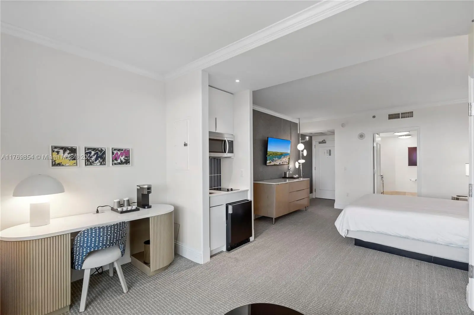 Enjoy unobstructed views of the Indian creek & the city in this beautiful Jr suite at Fontainebleau II. Enjoy full service, vacation-style living in a furnished turnkey unit with 1 king bed, 1 sleeper sofa, double burner kitchenette, microwave, mini refrigerator, walk in closet and additional owners' closet, large marble bathroom with hot tub & more. Option to enroll in hotel rental program & receive income while away! The Fontainebleau resort offers award-winning restaurants, LIV night club, Lapis spa & state-of-the-art fitness center, bakery, shops, full-service salon and more. Maintenance fees include all utilities: AC, internet, cable, electricity, valet + daily free breakfast in owner's lounge.