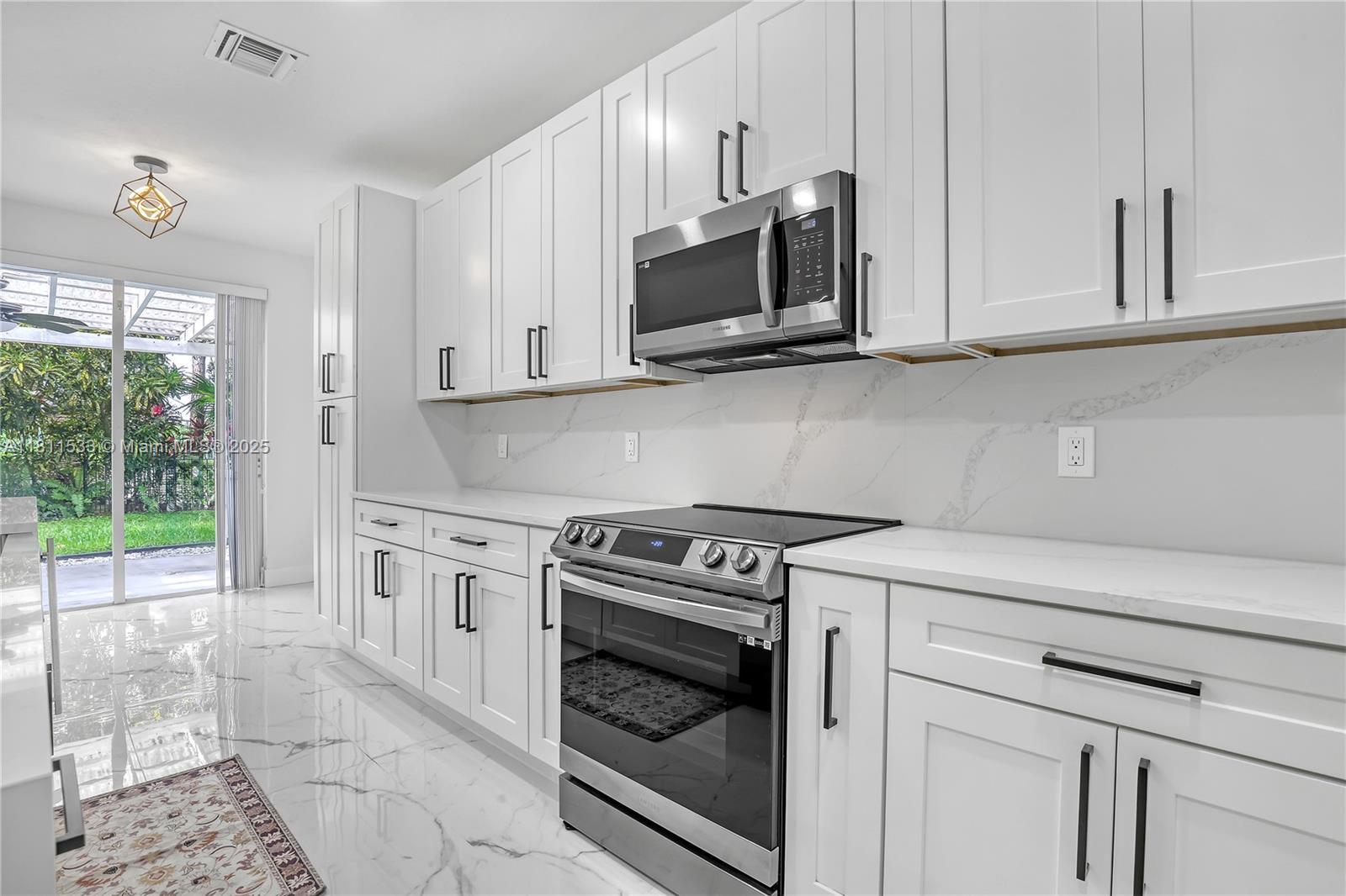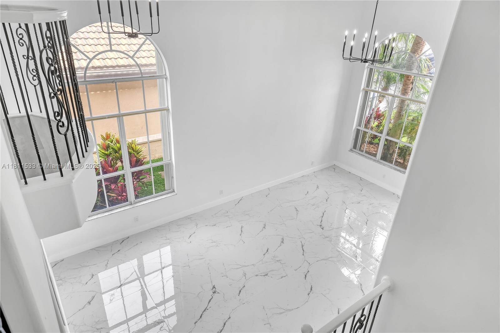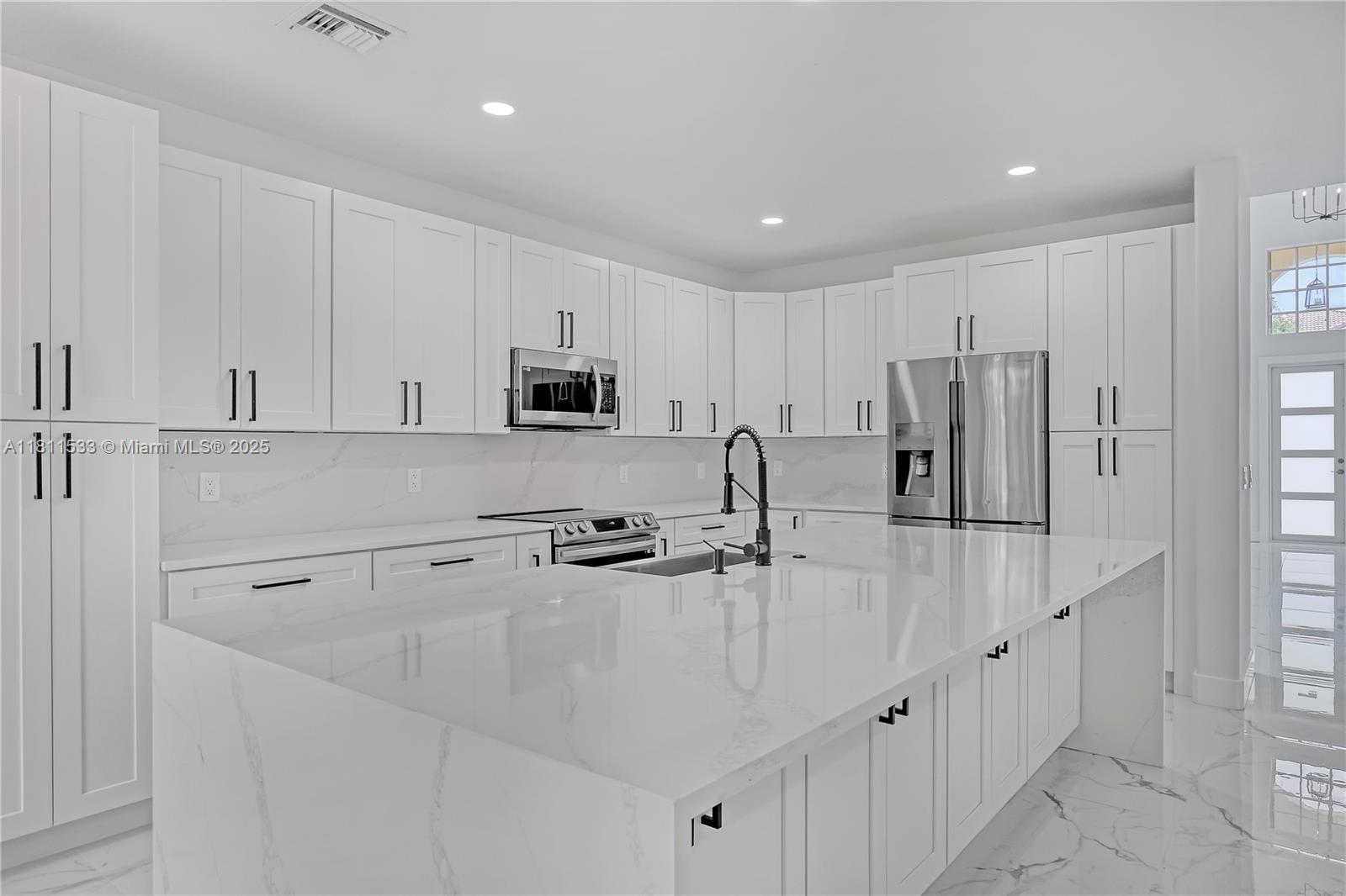 Beautifully updated 5BR/3BA residence in the sought-after gated community of Colony Preserve. This spacious two-story home offers a layout with one bedroom and full bath on the first floor, perfect for guests or extended family. The first level features elegant 24x48 white porcelain tile, soaring ceilings, and an open-concept design ideal for entertaining and everyday living. The fully remodeled kitchen includes a marble island, premium Samsung appliances, built-in oven/microwave, StormWash™ dishwasher, wine and beverage cooler, and smart rotating corner drawers. Upstairs features three bedrooms, a laundry area with Samsung washer/dryer, a Nest thermostat, and a separate A/C unit for efficient zoned cooling. Move-in ready and thoughtfully designed for modern comfort and convenience.