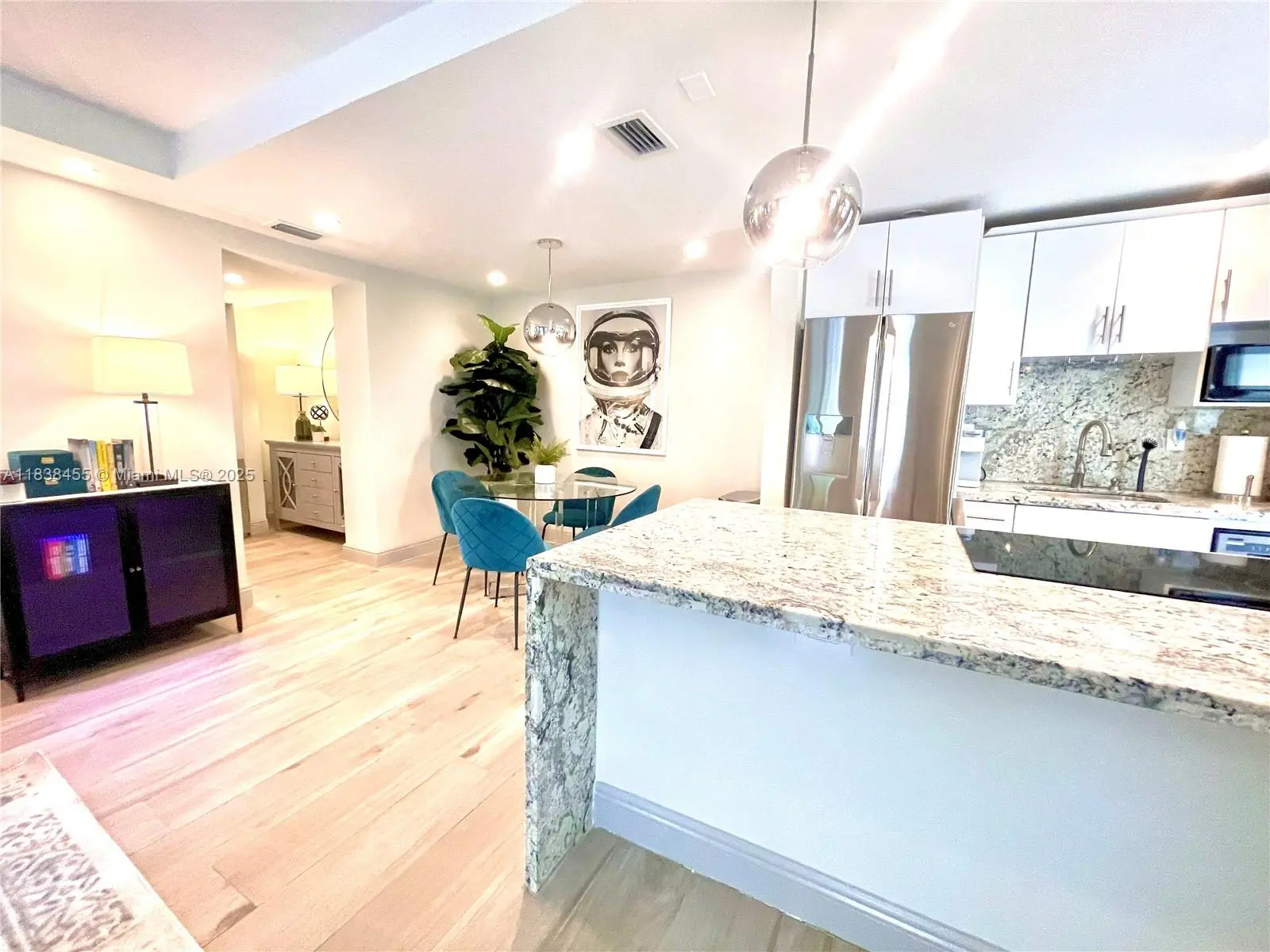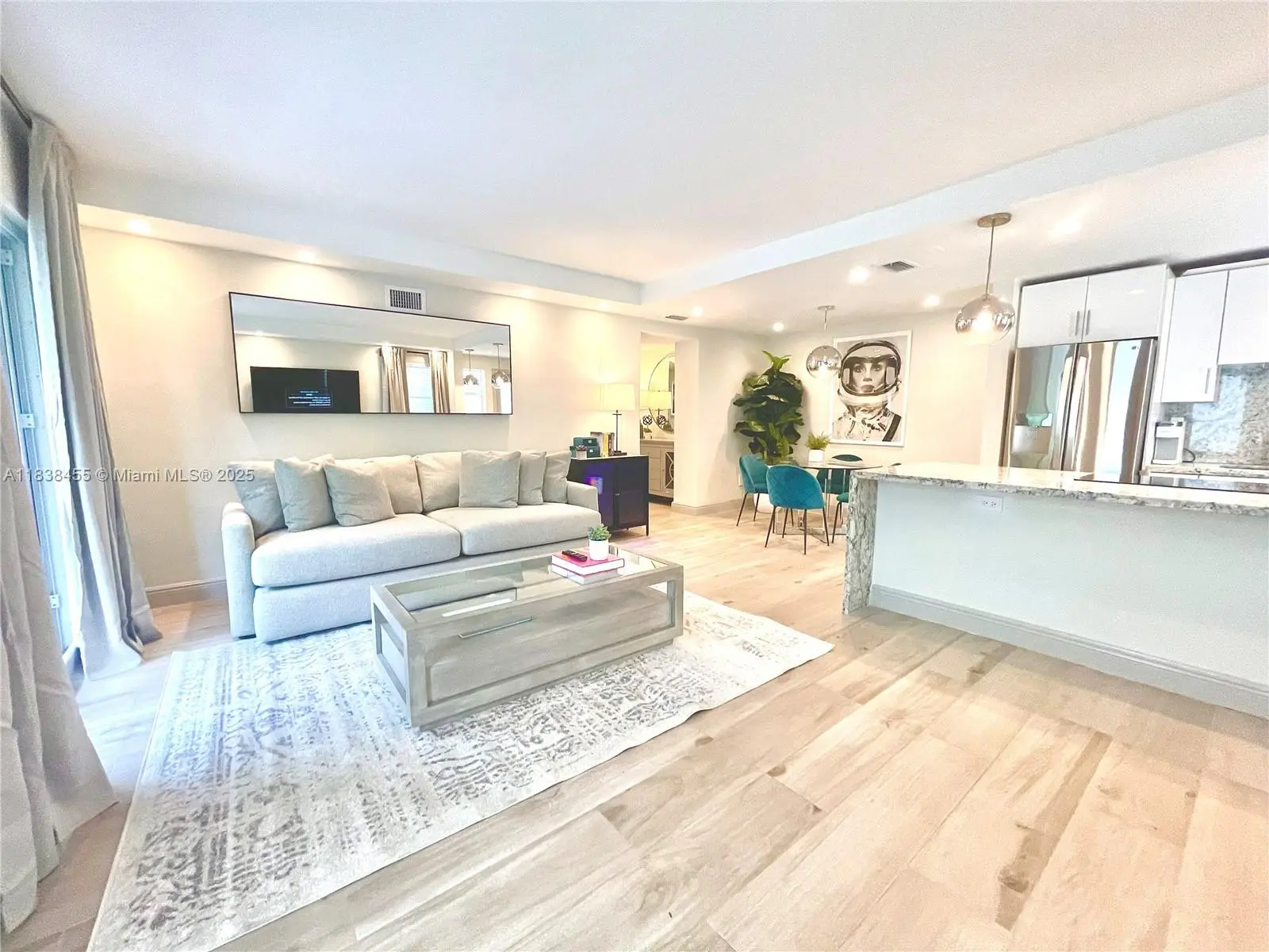 Stylish 780 sq ft Art Deco ground-floor unit with private entrance, giving it a house-like feel. Features a modern open kitchen, spacious balcony with lush greenery, and new flooring that extends outdoors. Recently owner-occupied, it includes new drywall, central A/C, impact windows and doors, and upgraded electrical. Smart home features let you control recessed lighting, thermostat, and locks via phone or voice. Comes with gated parking. Convenient location near markets, dining, dry cleaning, and bike rentals. Rented for $2,850/month. Passed 40-year inspection.