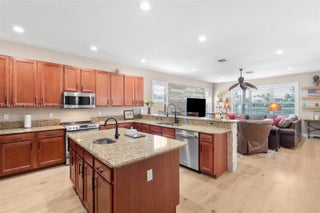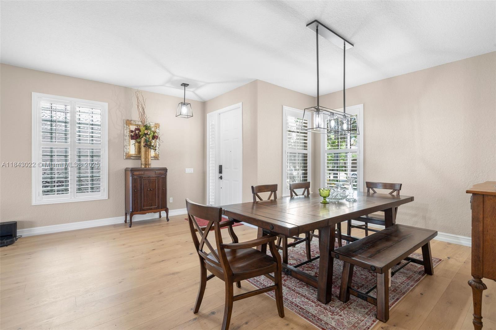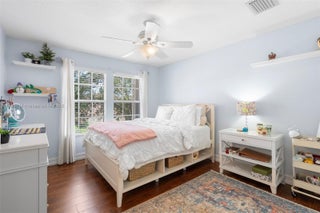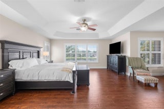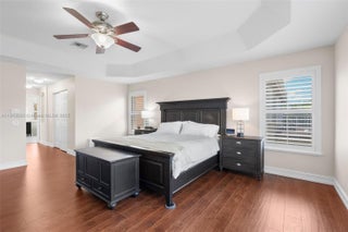 Experience the perfect blend of space, style, and functionality in this beautifully upgraded Topaz model in Canyon Lakes. This 6-bedroom, 4-bathroom home offers generous interior living, featuring wide plank engineered hardwood floors, high hat lighting, and Pottery Barn light fixtures throughout the main level. The oversized primary suite includes a serene sitting area and a newly renovated bathroom and walk in closets. Additional upgrades include new plantation shutters, 2023 kitchen appliances, a new washer and dryer, and dual-zone A/C units (2024 ,2020). Relax outdoors on the screened patio with tranquil lake views. The fully fenced back yard has plenty of space for a pool. Located in a prime gated community with clubhouse, community pool, fitness center, tennis courts and more.