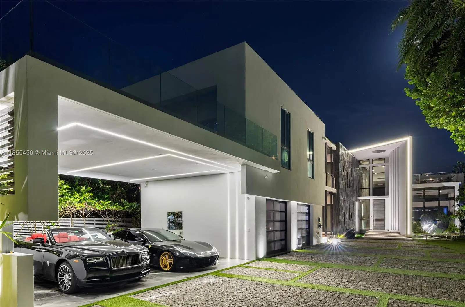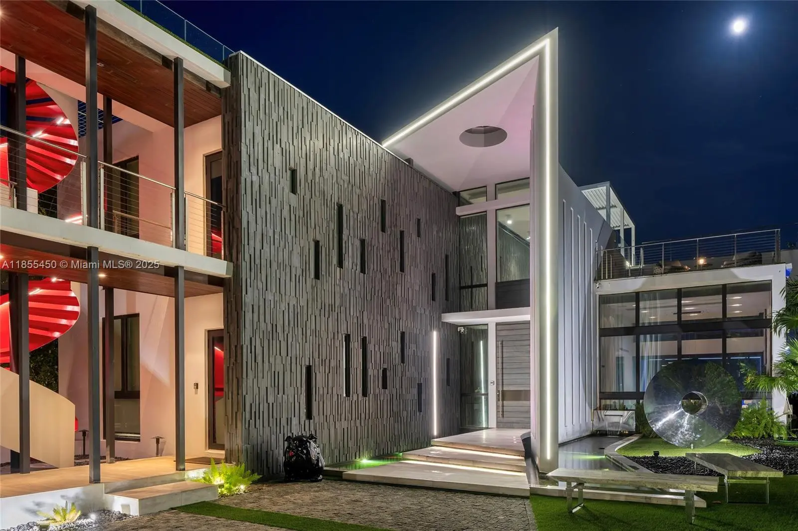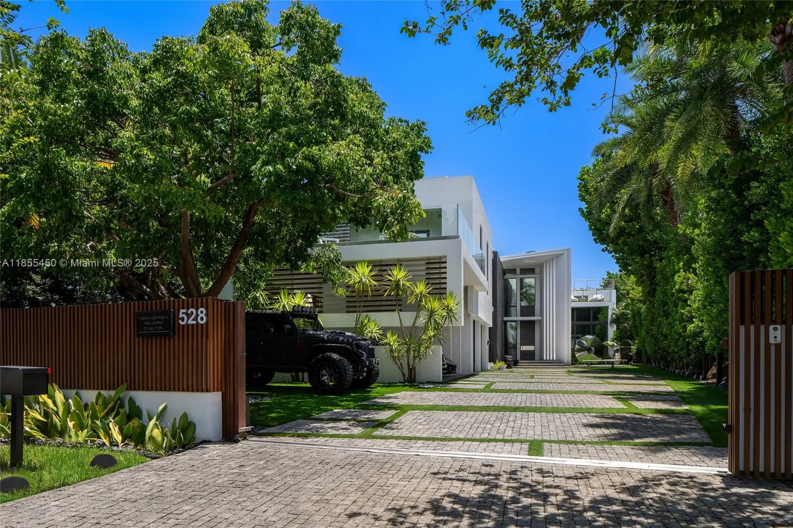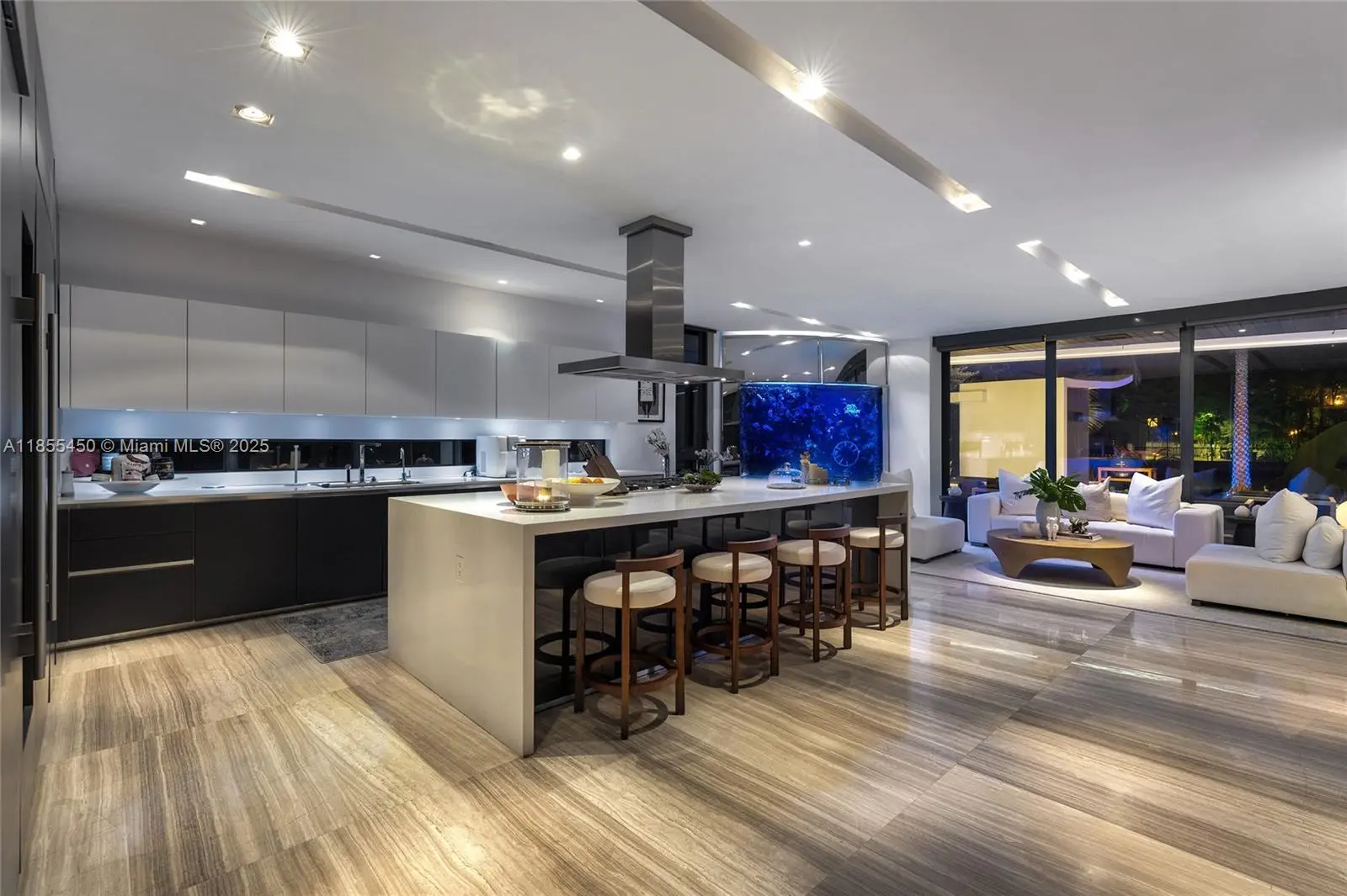 This striking modern tri-level waterfront residence blends bold architecture with refined luxury. Set on a 17,676 SF gated lot w/approx. 90FT of WF, the home offers 9,424 total SF with 5BR/7.5BA, expansive family, dining, & living areas all with water views. Highlights include marble & rich hardwood floors, custom millwork, chef’s kitchen with Wolf and Miele appliances, built-in aquarium, & seamless indoor-outdoor flow. Principal suite features an expansive terrace, spa-style bath, and massive walk-in closet. Additional amenities include a rooftop lounge with firepit & TV, a gym-converted garage, state-of-the-art theater, resort-style pool w/waterfall, summer kitchen, custom bar, 45FT dock, 3 jet ski slips & direct Intracoastal access. This residence epitomizes the Miami lifestyle.