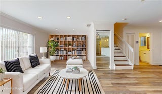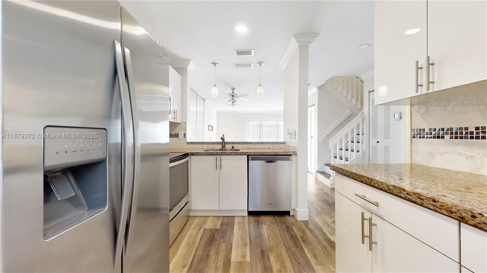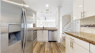Discover modern elegance in this move-in-ready, lakefront townhome in Serena Lakes. Step inside and be greeted by a bright, inviting space featuring rich wood-like flooring and recessed lighting that sets a sophisticated tone. The heart of the home is a beautifully updated kitchen with stainless steel appliances and sleek granite countertops. Enjoy a tranquil escape in your private, fenced yard, perfect for unwinding while overlooking the serene lake. Additional conveniences include two assigned parking spaces and accordion shutters for peace of mind. The community provides an exceptional lifestyle with access to three swimming pools, picnic areas, and biking and jogging trails, all within a secure environment.
