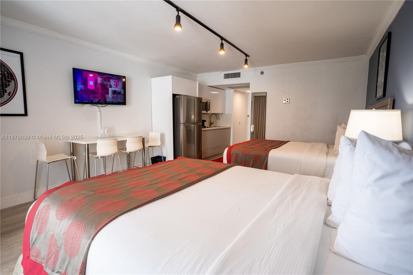 Bright and beautiful oceanfront studio in Sunny Isles Beach! This fully furnished gem, located on the 4th floor, has been recently remodeled and features two queen-sized beds, an Italian-style kitchen, and laminate flooring throughout. Enjoy breathtaking views from your private balcony. This property boasts a lifestyle that perfectly blends relaxation with investment potential. It participates in a hotel program, allowing for personal use while still generating rental income. Close to the world-famous Aventura Mall and within walking distance to many shops and dining options. The maintenance fee includes electricity, water, internet, cable, valet parking, and more