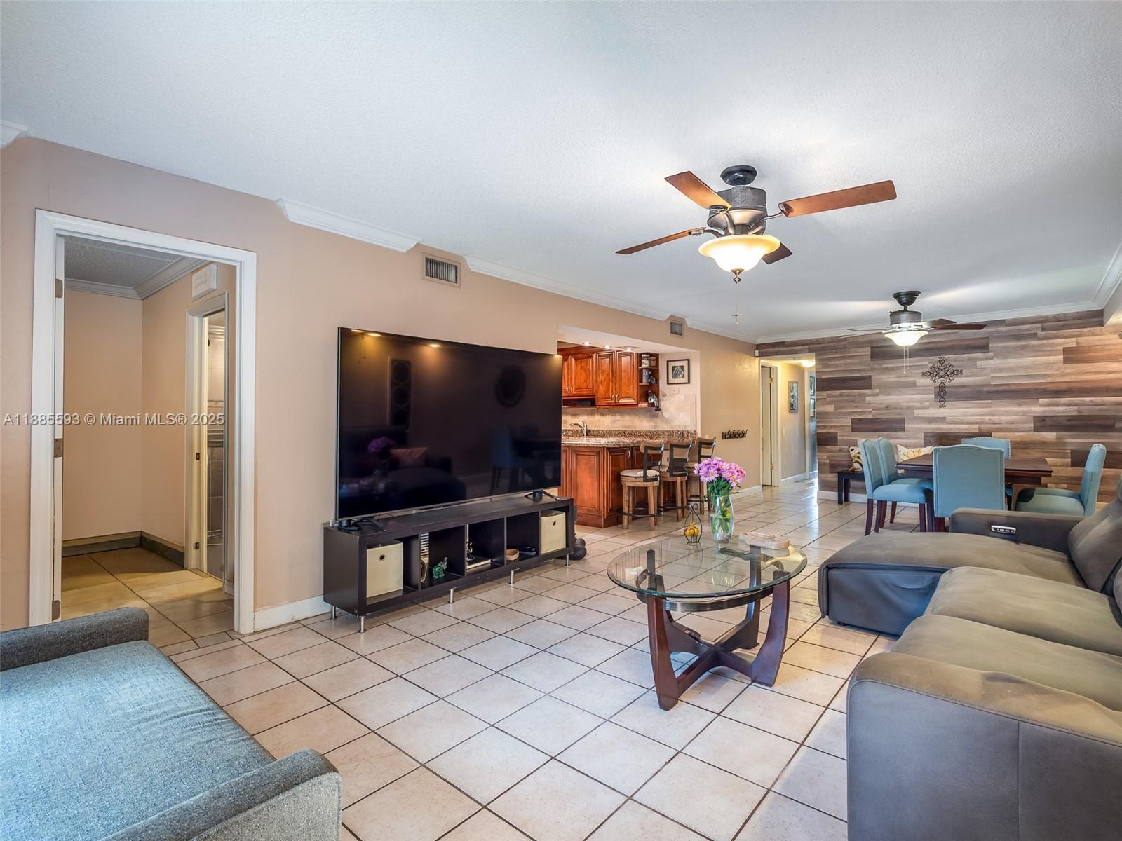 Located in the gated community of Snapper Village, this updated 3-bedroom, 2-bath residence offers a functional layout and 2 large patios, one with direct greenbelt access. The renovated kitchen features stainless steel appliances, granite counters, and wood cabinetry, opening to a spacious tiled living room with crown molding. The primary suite includes a walk-in closet, plantation shutters, and an upgraded bath with new vanity, while both the primary and first bedrooms have patio access. Highlights include brand-new AC, newer water heater, accordion shutters, and single-level living. Community amenities include an Olympic-sized pool, playground, walking paths, tennis courts, lake, and 24-hour guard gate. Association fee covers water, internet, cable, insurance, and amenities.
