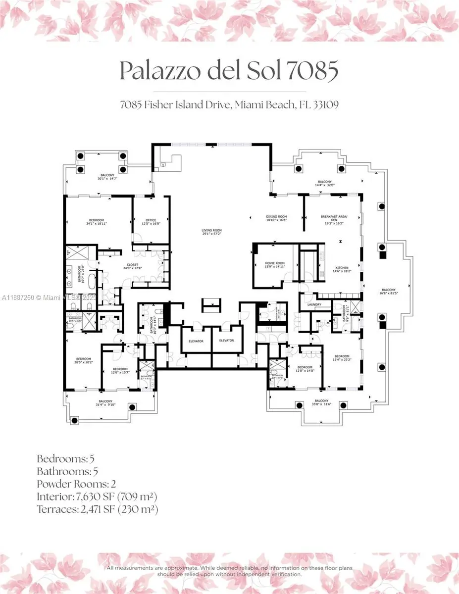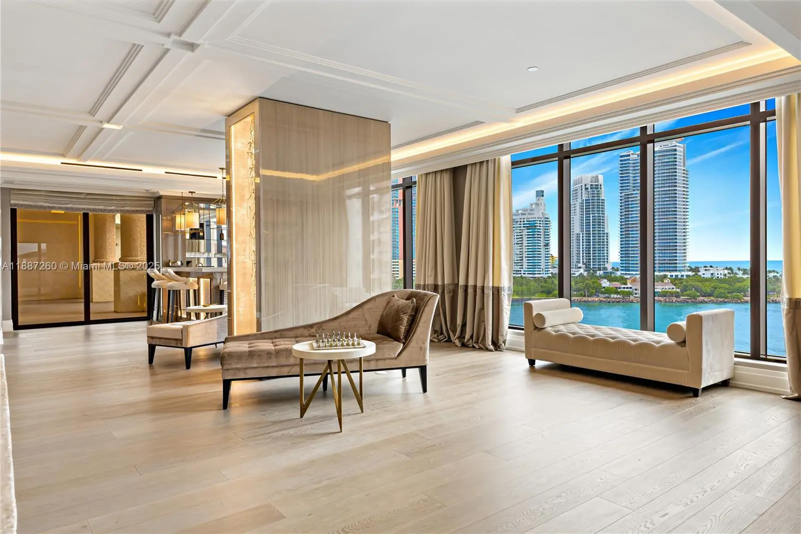 EXPERIENCE THE EPITOME OF LUXURIOUS INTERIOR ARCHITECTURE & DESIGN AT PALAZZO DEL SOL FROM THIS SPRAWLING RESIDENCE BY AWARD-WINNING DÔME INTERIORS OF GENEVA! Unmatched Classic Swiss Elegance from this 5 Bed + 6.5 Bath Residence Spanning 7,630 SF of Living Area. Private Elevator Entry Greets you to an Open Living Area in Gold & Beige Tones with Mother-of-Pearl panels & custom-designed European Furnishings. Panoramic Views Overlooking the Ocean, Bay & Golf Course from 2,471 SF Wraparound Terraces. Custom Entertainment Bar with Lounge Area, Study & Theatre. Coffered Ceilings with Hidden Linear Diffusers. White Oak Flooring. Dining Area with Hand-Painted Panorama Wallpaper & Handmade Chandelier. European Boffi Eat-In Kitchen wrapped in slabs of Onyx & features Sub-Zero + Gagganeau Appliances. Wine Cellar. Primary Bedroom features Hand Painted Wallpaper, Glass Pendants & Sconces by Ochre. Massive Custom Swiss Dressing Room with Backlit Glass Displays. Primary Bath wrapped in Book-Matched White Carrara Marble, Double Vanity Sink, Custom Fisher Island Boffi Soaking Tub & Rain shower. Secondary Bedrooms in Ocean-Inspired Tones. Sultry Powder Room with Leather Walls & Black Galaxy Granite Countertop. 2 Parking Spaces + 1 Golf Cart Space. Building Amenities & Services include Butler-Serviced Aperitivo Bar & Lounge, Theater, Hair & Makeup Salon, Private Massage Rooms, Business Center, Gym & Cardio Room, Kidville Playroom, Concierge, Valet, Zero-Edge Pool & Spa with Attendant.