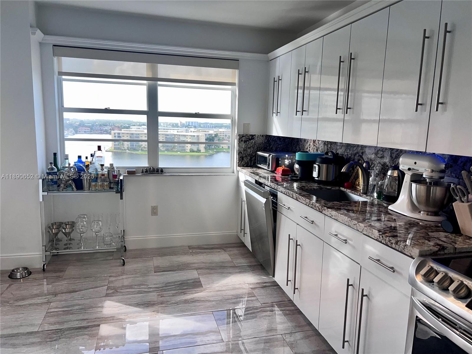 Experience breathtaking panoramic water views from every window in this beautifully remodeled 2-bedroom + den, 2-bathroom apartment at Admirals Port. Enjoy the serene beauty of Little Maule Lake from your expansive wraparound balcony, offering a sought-after direct southern exposure. This spacious and light-filled residence features a modern upgraded kitchen with sleek cabinets, granite countertops and backsplash, and elegant porcelain tile flooring throughout. Additional highlights include hurricane shutters, custom blinds, and enhanced overhead lighting. Admirals Port offers resort-style amenities including pools, tennis, fitness center, 24-hour security, and more. Located near restaurants, Aventura Mall, and houses of worship, this apartment offers convenience and lifestyle.