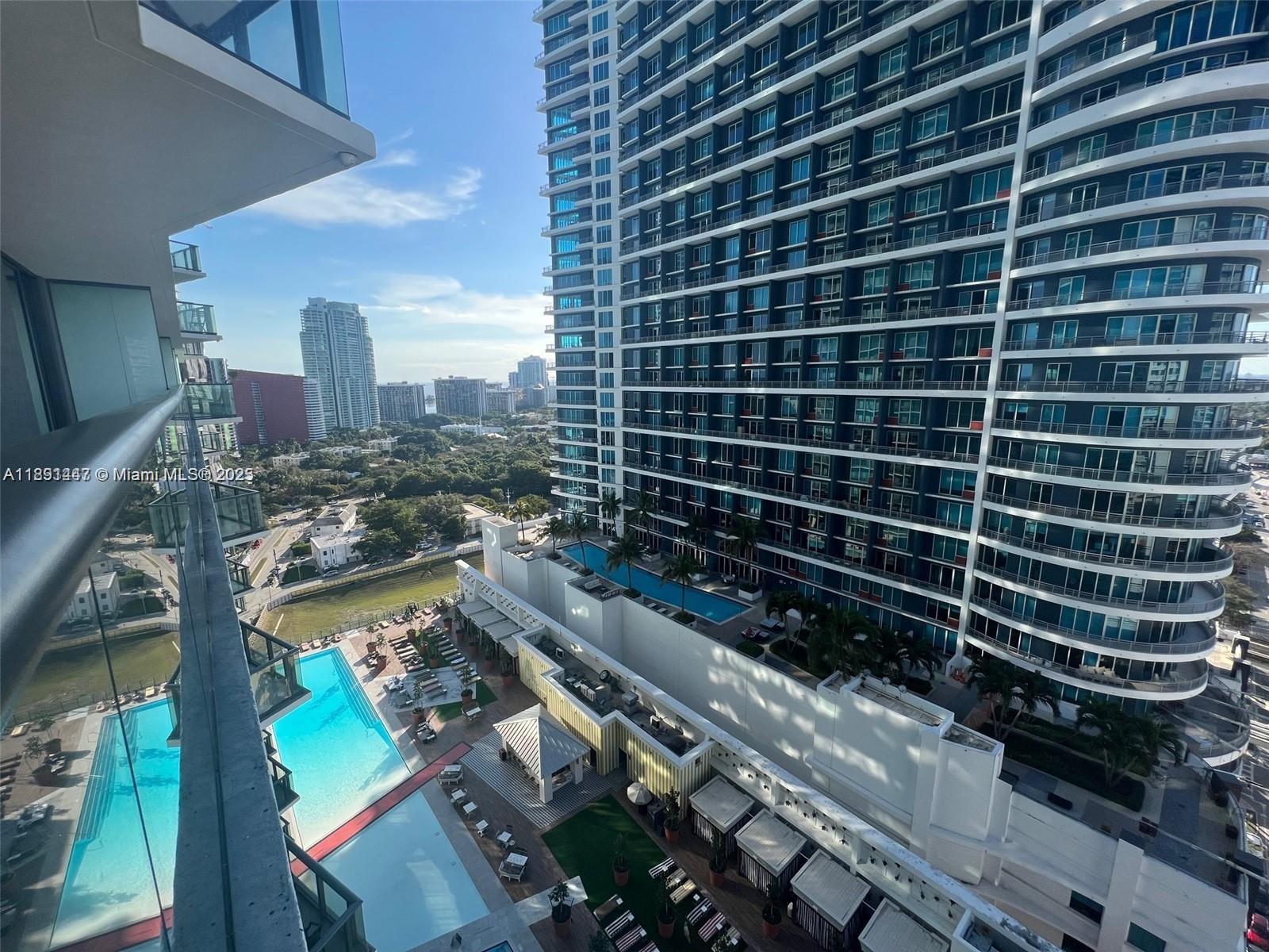 Welcome to Dua Miami, formerly the SLS Residences, featuring one of the most desirable corner lines in the bdlg. This stunning 2BR, 2BA +den residence is flooded w/ natural light through floor-to-ceiling windows wrapping around the entire unit. The expansive wraparound balcony offers beautiful city and pool views, plus an extra bump-out area for added outdoor space, perfect for lounging or entertaining. Inside, the den provides a versatile space ideal for a home office or cozy sitting area. Residents enjoy hotel-style amenities, including a bar ,restaurant at the main pool, a private rooftop pool with breathtaking panoramic views of Miami.All of this in the heart of Brickell, steps from Brickell City Centre, the MetroRail, Mover stations, placing the best of Miami right at your doorstep.