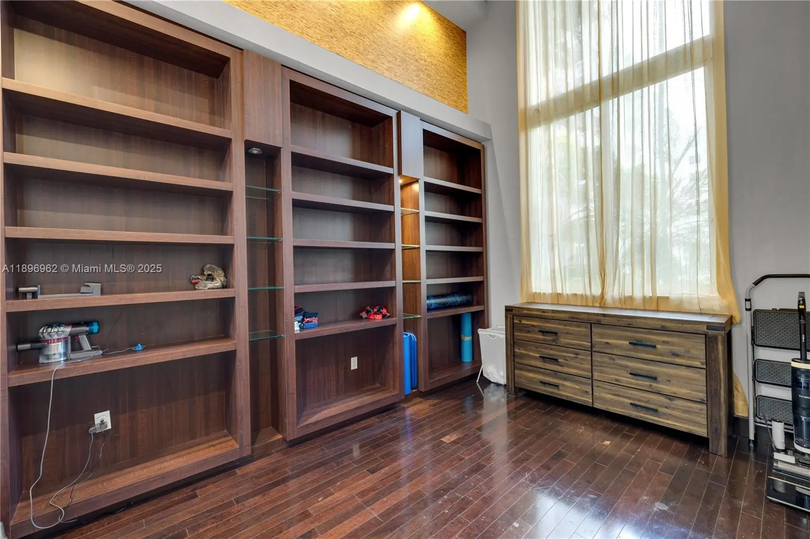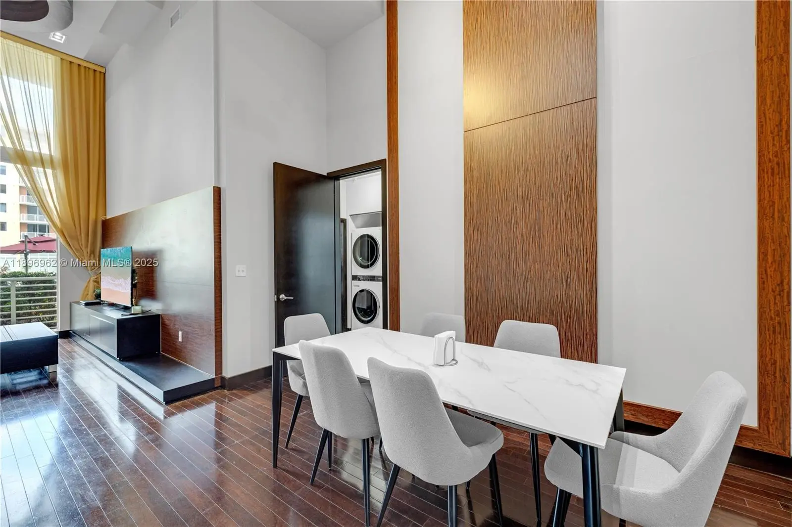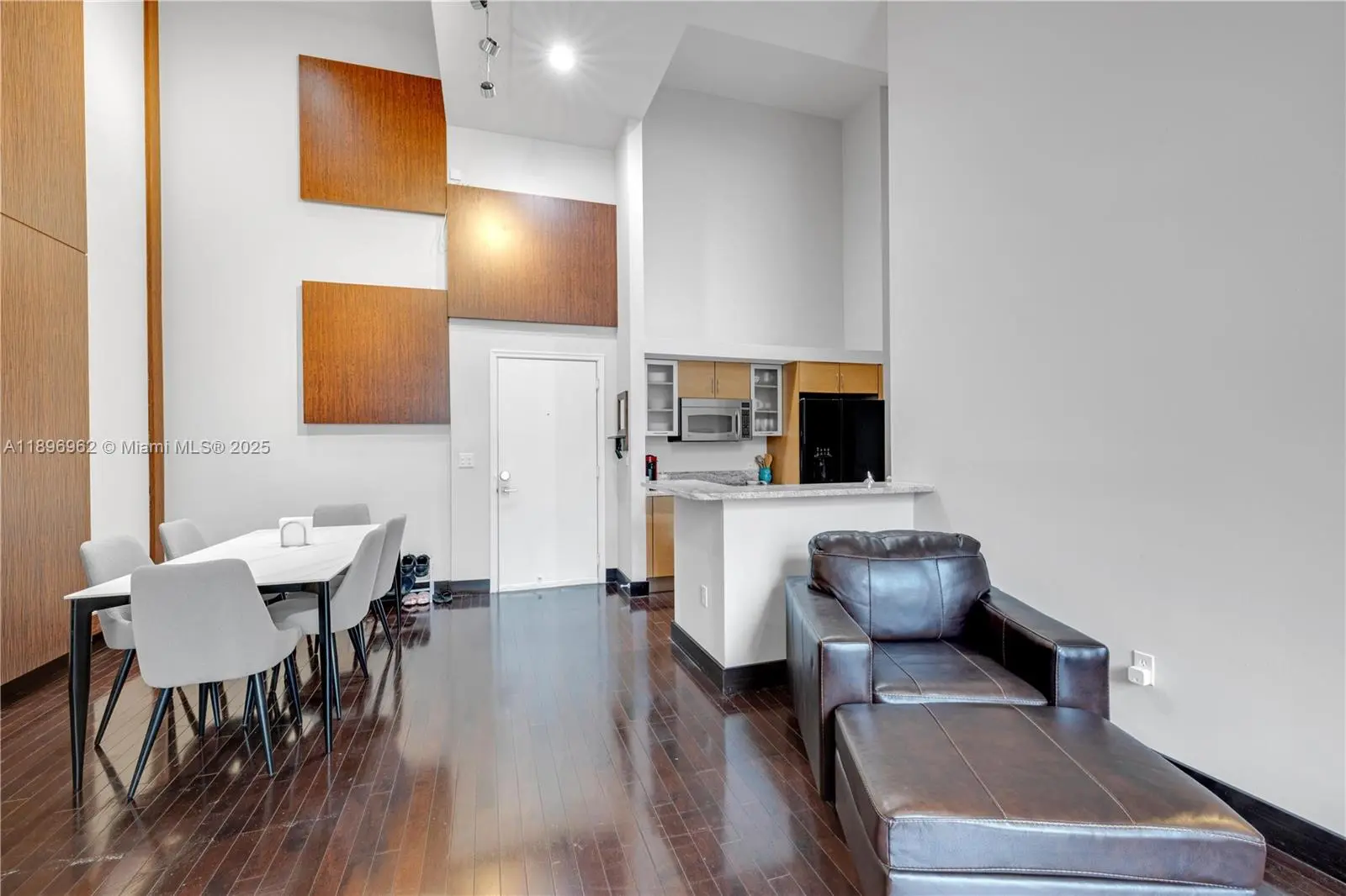 Elegant soaring 16-1/2’ ceilings, 1st floor, serene pool & garden view. 1+den or office/1.5 easy to convert back to 2/2. Open kitchen, custom closets/lighting, hardwood floors & details. New LG laundry, smart thermostat & lock; ceiling fan. Includes 2 garage spaces steps from apt.–no elevator needed, like living in a house! Rare storage (2) included. Fab schools Aventura Charter or Waterways K-8 & Krop. 24/7 security & valet, lovely attended lobby soon to be renovated, pools, business center, movie theatre, gym, sauna, hot tub, party room with pool table & TV. Maintenance includes basic cable, Wi-Fi, water, reserves+. Pet friendly. As-is, inspections welcome. In vibrant Aventura Town Center–walk to shopping, dining, gyms, theatre, Aventura Mall. Near beach-Bal Harbour-Gulfstream-airports