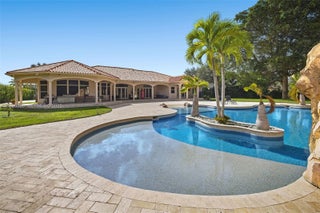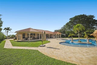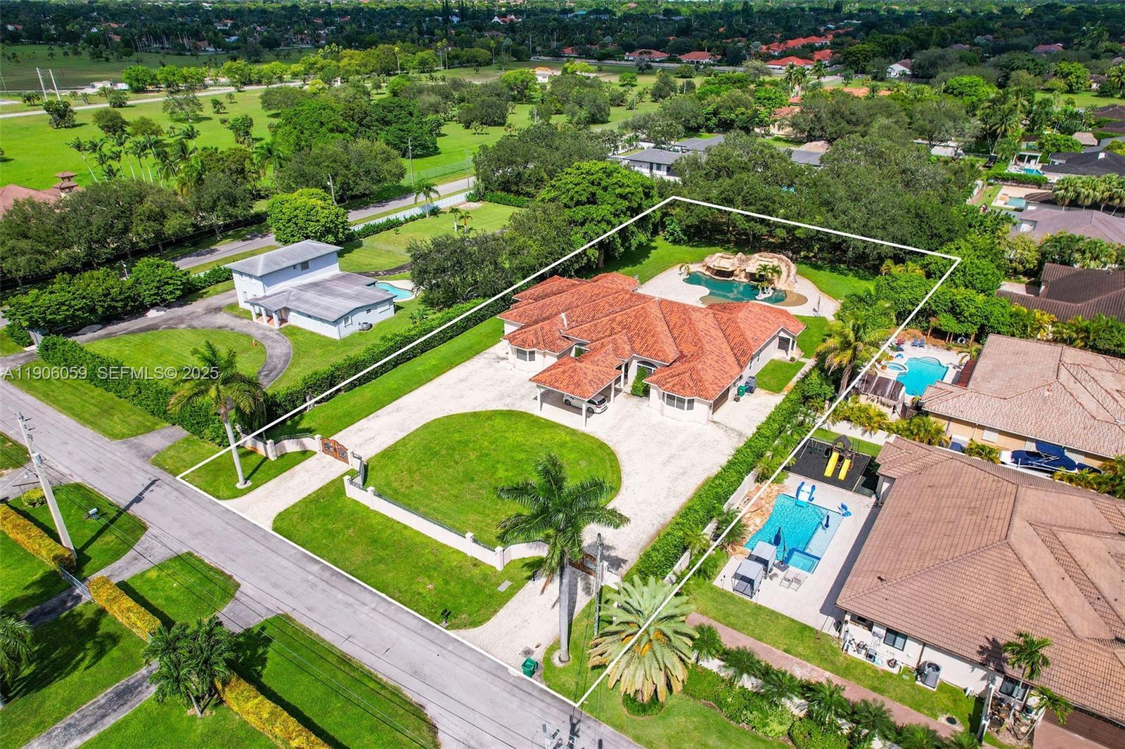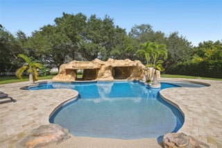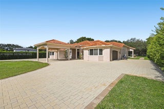 Elegant 5-bedroom, 4.5-bath home on over an acre in Miami’s Horse Country. Single-story layout with marble floors, open living spaces, and walls of windows overlooking a resort-style pool with slide and water features. Custom finishes include trey ceilings, crown molding, and columns. The primary suite features double walk-in closets and a spacious bath with jacuzzi, shower, and bidet. Includes a large kitchen with walk-in pantry, formal living room, family room, laundry room, circular driveway, and two-car garage. Convenient to top schools, hospitals, and the Turnpike.