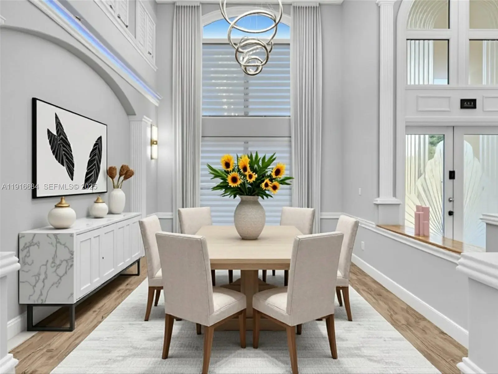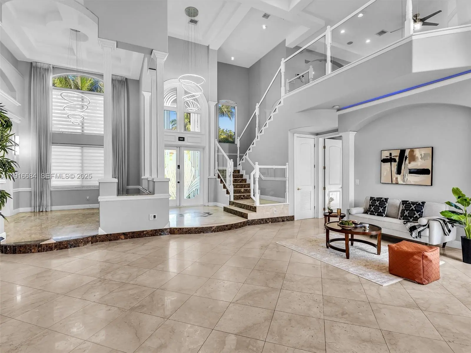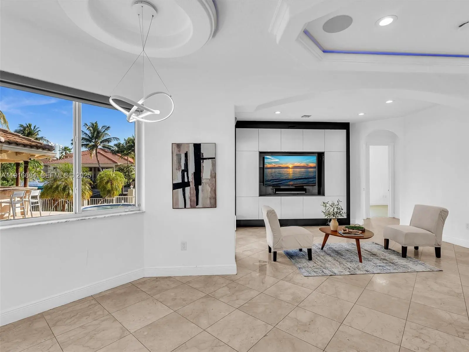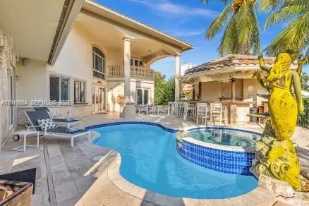 Elegant 5 BD /4.5 BA Mediterranean Villa, featuring a sophisticated triple-split floor plan, soaring ceilings, and marble floors through out. The refined Italian Kitchen includes premium high-end appliances. All bedrooms are on the main level, complemented by entire- home surround sound and automatic Somfy shades. A fireplace with a custom mantle enhances the naturally lit living space, with an upstairs loft overlooking the great room ideal for a media lounge, gym or game room. Outdoors, enjoy a resort-style pool, a Covered outdoor bar complete with a spacious countertop - stool seating, an additional cabana bath and outdoor shower - an entertainer's dream for hosting, offering resort living at it's finest. Enjoying 86 ft of tranquil waterfront, and a private dock. This home is waiting for you- and your boat and jet skis - for true South Florida living. Exceptionally located close to pristine beaches, acclaimed dining, and major highways-this residence delivers timeless luxury and unmatched convenience.