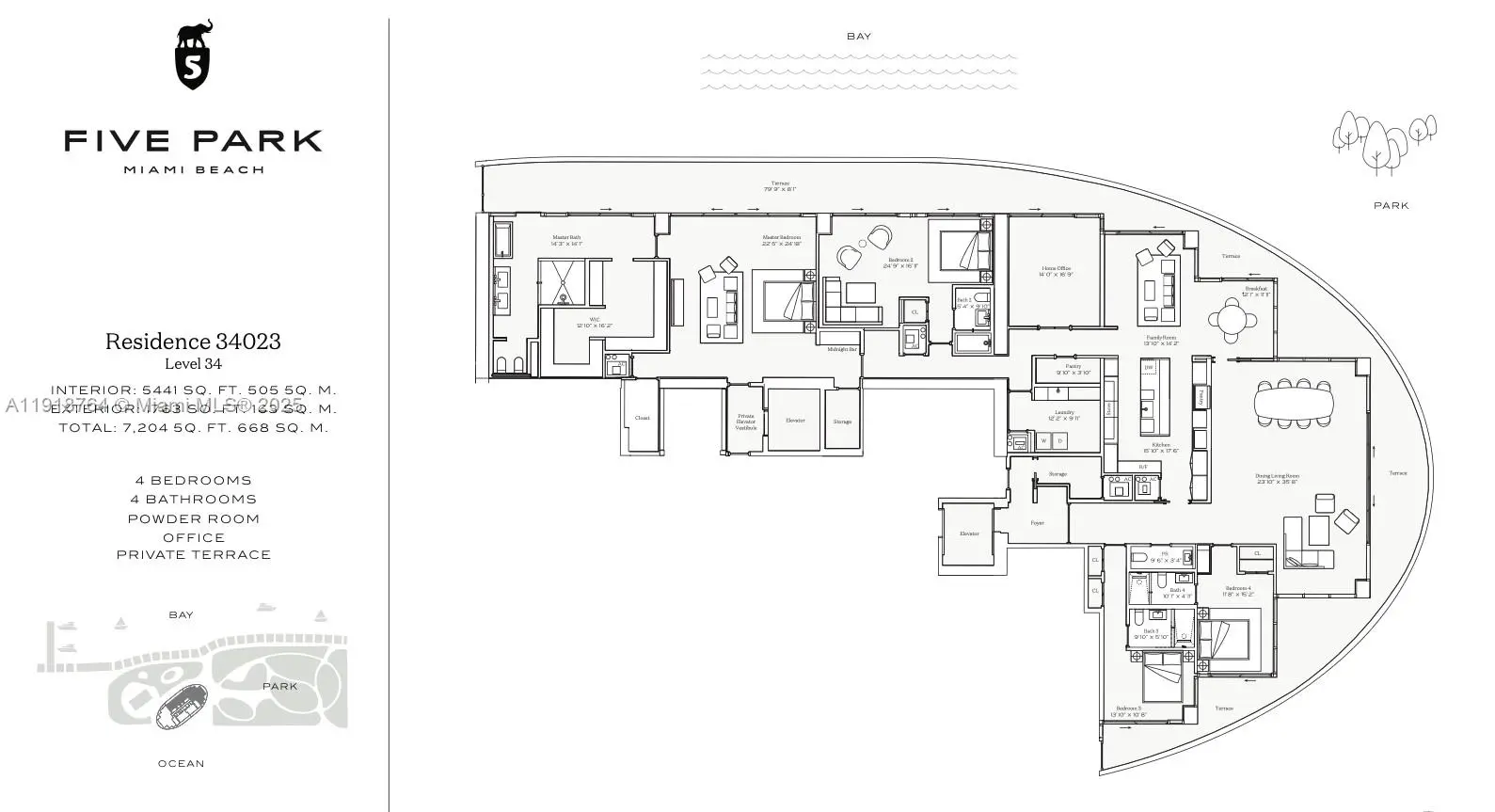 Brand-new developer COMBO UNIT — truly one-of-a-kind — featuring 4 bedrooms + media room at the Canopy Residences in Five Park Miami Beach, professionally staged by Artefacto. Enjoy resort-style living with 50,000+ sq ft of amenities including the exclusive Canopy Club with owners lounge, a 6th-floor terrace with adult and family pools, cabanas, sunset lounge and restaurant. Residents also have access to a private Beach Club in South of Fifth with umbrella and towel service, plus the 3-acre Canopy Park. Additional amenities include a fully equipped gym and yoga studio, spa with treatment rooms and sauna, business lounge/co-working spaces, screening room, children’s learning lab and teen club. Services feature 24-hr concierge and butler, valet, bike storage, EV Moke shuttle to the beach, and high-speed fiber-optic internet.
