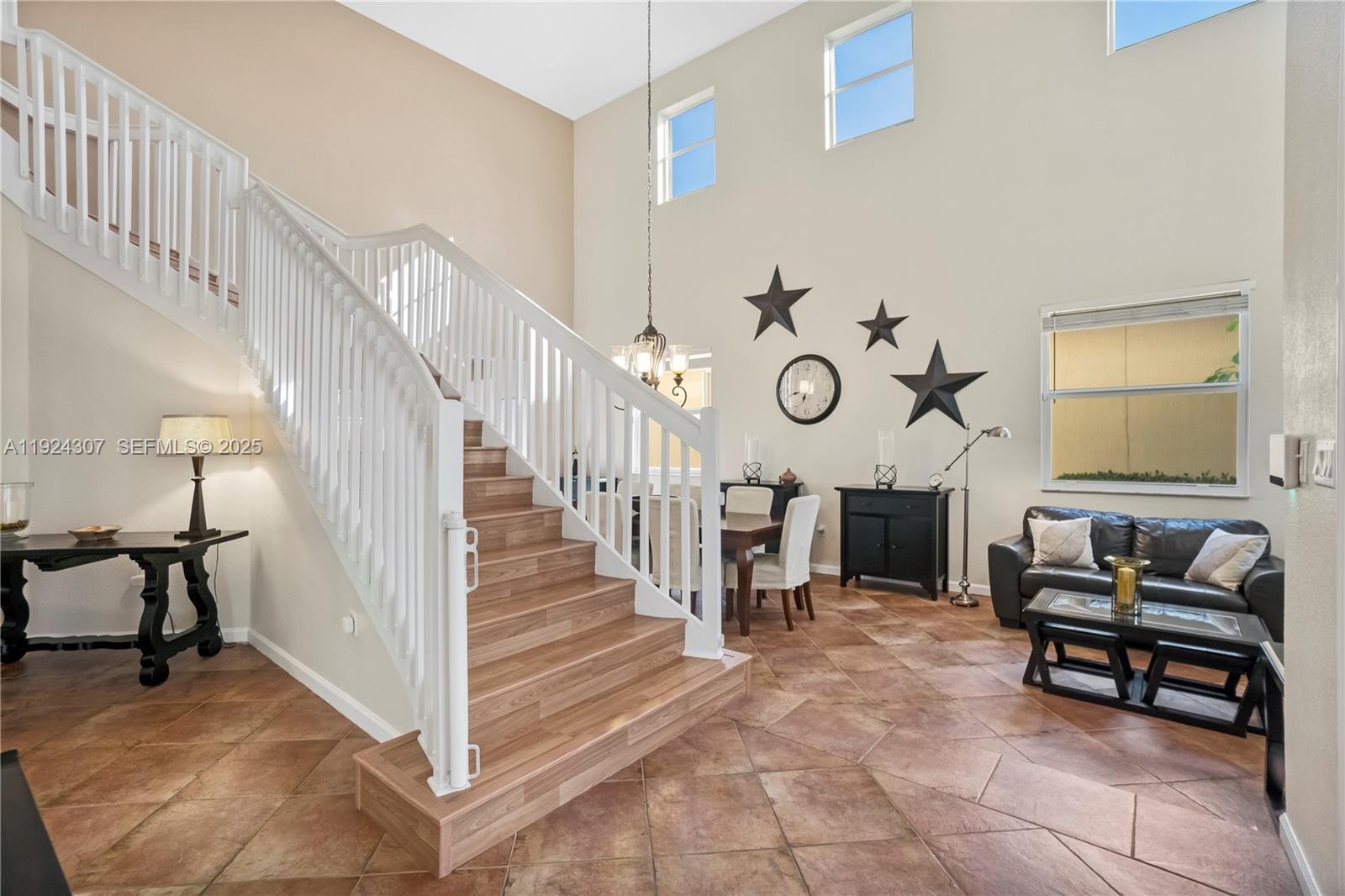 Discover this beautifully maintained 4-bedroom, 3-bath home perfectly situated on a tranquil lakefront lot. This home features a convenient first-floor bedroom and full bath, as well as three bedrooms and two baths upstairs. The home also features solar panels that significantly enhance energy efficiency, along with impact windows on the first floor and accordion shutters on the second. Inside, the main living areas are finished with tile flooring, while the upstairs bedrooms offer carpeting for added comfort. The kitchen is equipped with stainless steel appliances and ample cabinetry, a large island, and a walk-in pantry. The primary suite is complemented by beautiful lake views and two closets for extra space. Step outside to the backyard overlooking a lake, an inviting setting for outdoor dining, gatherings, or simply enjoying the peaceful scenery. The spacious 3-car garage offers ample storage and convenience, accommodating multiple vehicles or hobby space