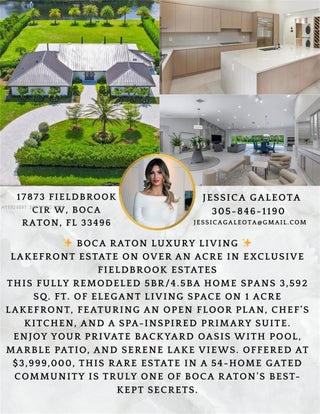 Completely remodeled lakefront estate in the prestigious Fieldbrook Estates—one of only 54 homes in this private, gated, and secured community. Nestled in the heart of Boca Raton, Fieldbrook Estates is a hidden gem known for its oversized lots, low HOA, and unmatched privacy. This elegantly updated residence offers 5 bedrooms and 4.5 bathrooms, featuring a modern open floor plan, a brand-new chef’s kitchen, new flooring, spa-inspired bathrooms, and smart lighting and security systems throughout. 5th bedroom is currently being used as an office and has plenty of space to build a closet. A beautifully finished marble-paved driveway and patio elevate the property’s curb appeal. Step outside to your private backyard oasis overlooking the lake—perfect for serene everyday living or unforgettable entertaining. Set on one full acre, this home provides the rare blend of luxury, space, and tranquility. Additional upgrades include two new AC units and a new roof installed less than one year ago, offering style, comfort, and peace of mind.