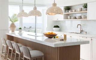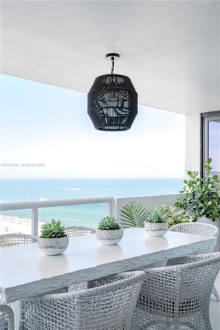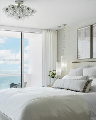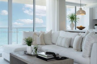 Live steps from the shoreline in this designer-furnished 3-bedroom, 3.5-bath corner residence curated by DLT Interiors and offering panoramic ocean views from every room and three private balconies with direct east and northwest exposures. Floor-to-ceiling impact windows, marble flooring, and custom built-ins create a serene and sophisticated living experience. The spacious primary suite features its own oceanfront balcony, two custom walk-in closets, a sitting area, and a spa-style bath with a rain shower and double sinks. The upgraded kitchen includes marble countertops, a glass cooktop, wine cooler, slow-close drawers, and abundant storage. Additional features include a full laundry room, Nest thermostat, smart lighting, linear A/C ducts, recessed lighting, and European interior doors with concealed hinges and magnetic hardware. Two additional bedrooms also enjoy ocean views, with the second bedroom opening directly to a balcony. Thoughtful details throughout the home enhance both comfort and design, including generous storage, elegant wall treatments, and gold-accented finishes. L’Excellence offers 24-hour security, valet parking, beach service with chairs and umbrellas, two gyms, a clubhouse, billiards room, resident lounge, library, sauna, hot tub, and multiple quiet seating areas.