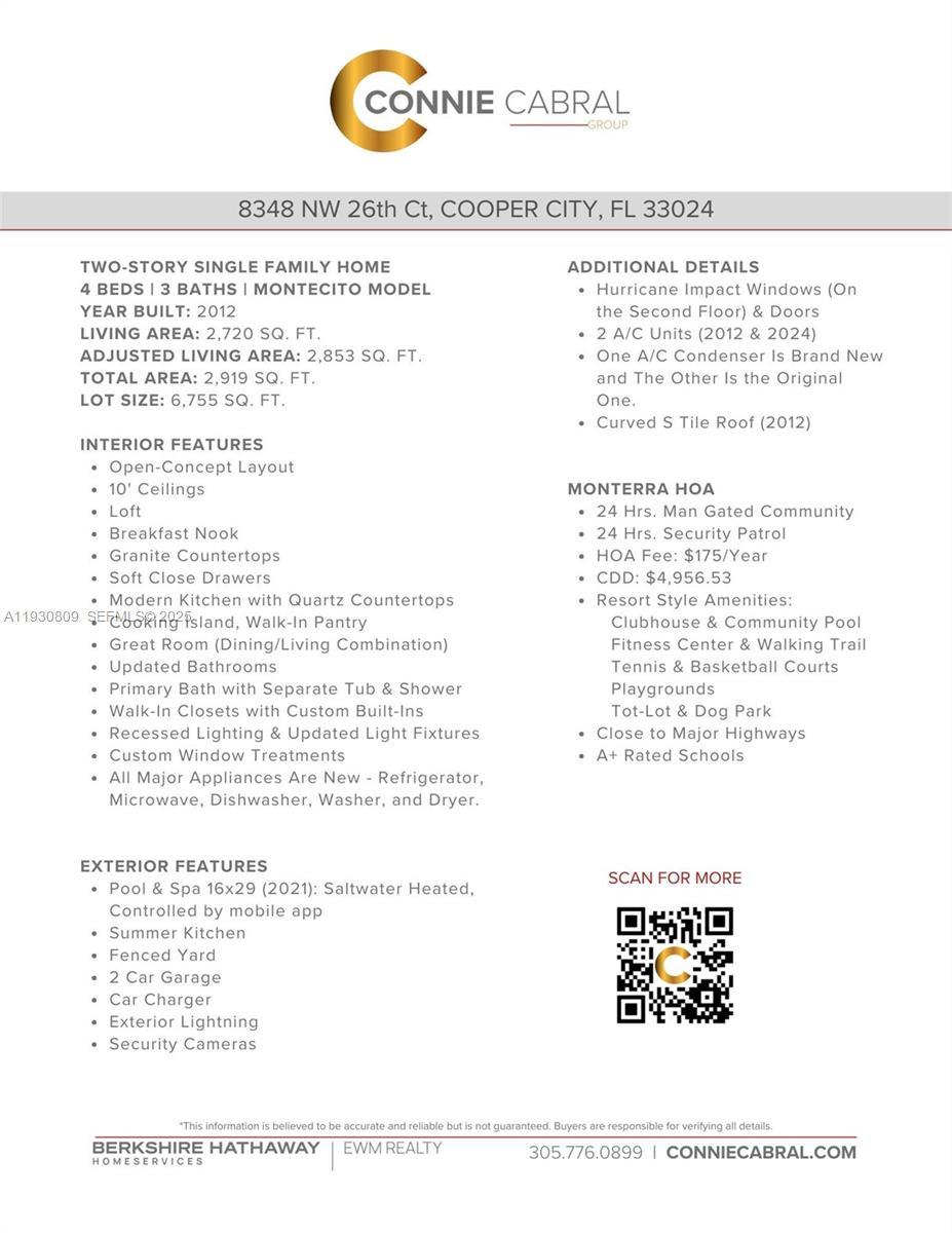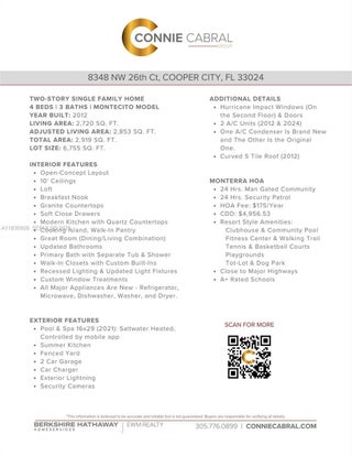 WELCOME TO MONTERRA, ONE OF COOPER CITY’S MOST SOUGHT-AFTER GATED COMMUNITIES. THIS STUNNING MONTECITO MODEL OFFERS FOUR BEDROOMS AND THREE FULL BATHROOMS AND HAS BEEN COMPLETELY RENOVATED, PRESENTING A TRUE TURNKEY OPPORTUNITY READY FOR IMMEDIATE OCCUPANCY. THE HOME FEATURES A FLAWLESSLY APPOINTED KITCHEN DESIGNED FOR BOTH EVERYDAY LIVING AND ENTERTAINING. ONE BEDROOM IS CONVENIENTLY LOCATED ON THE GROUND LEVEL—IDEAL FOR GUESTS OR A PRIVATE HOME OFFICE—WHILE THE SECOND FLOOR OFFERS THREE ADDITIONAL BEDROOMS, A DEDICATED LAUNDRY ROOM, AND A LUXURIOUS PRIMARY SUITE. THE EXPANSIVE PRIMARY RETREAT BOASTS A SPACIOUS WALK-IN CLOSET AND A SPA-INSPIRED BATHROOM WITH DUAL VANITIES, A SOAKING TUB, A SEPARATE SHOWER, AND A PRIVATE WATER CLOSET. STEP OUTSIDE TO A SERENE AND EXCEPTIONALLY PRIVATE OUTDOOR OASIS, ENHANCED BY PROFESSIONAL LANDSCAPING AND A HEATED SWIMMING POOL WITH JACUZZI—PERFECT FOR YEAR-ROUND RELAXATION AND ENTERTAINING. MONTERRA IS RENOWNED FOR ITS RESORT-STYLE AMENITIES, INCLUDING TENNIS AND BASKETBALL COURTS, TWO DOG PARKS, TOT LOTS, A FULLY STAFFED STATE-OF-THE-ART FITNESS CENTER OPEN SEVEN DAYS A WEEK, AND 24-HOUR SECURITY. IDEALLY LOCATED IN COOPER CITY, THIS HOME OFFERS CENTRAL ACCESS BETWEEN MIAMI AND FORT LAUDERDALE AND IS JUST MINUTES FROM TOP-RATED PUBLIC AND PRIVATE SCHOOLS, PREMIER DINING, AND SHOPPING.