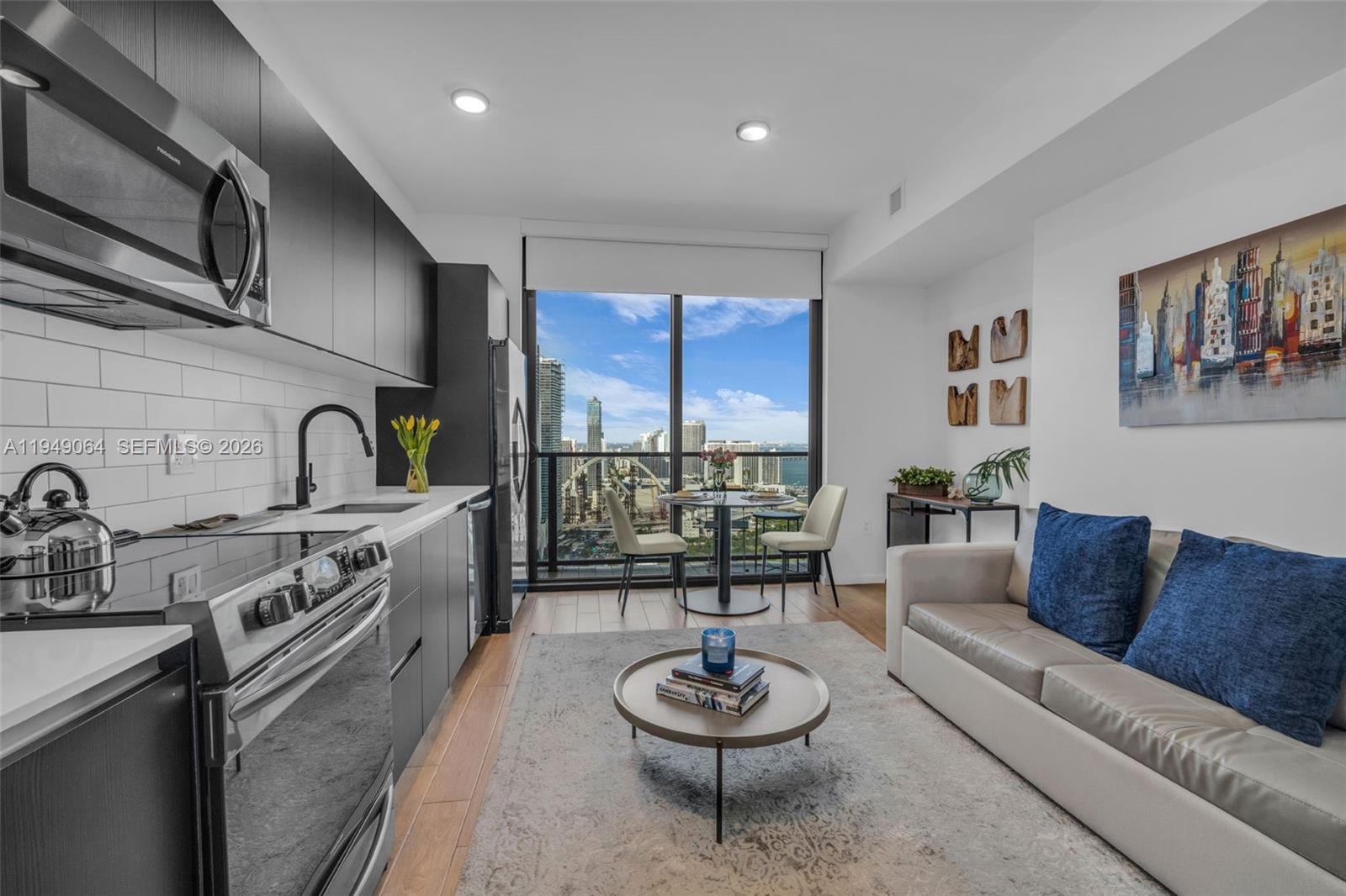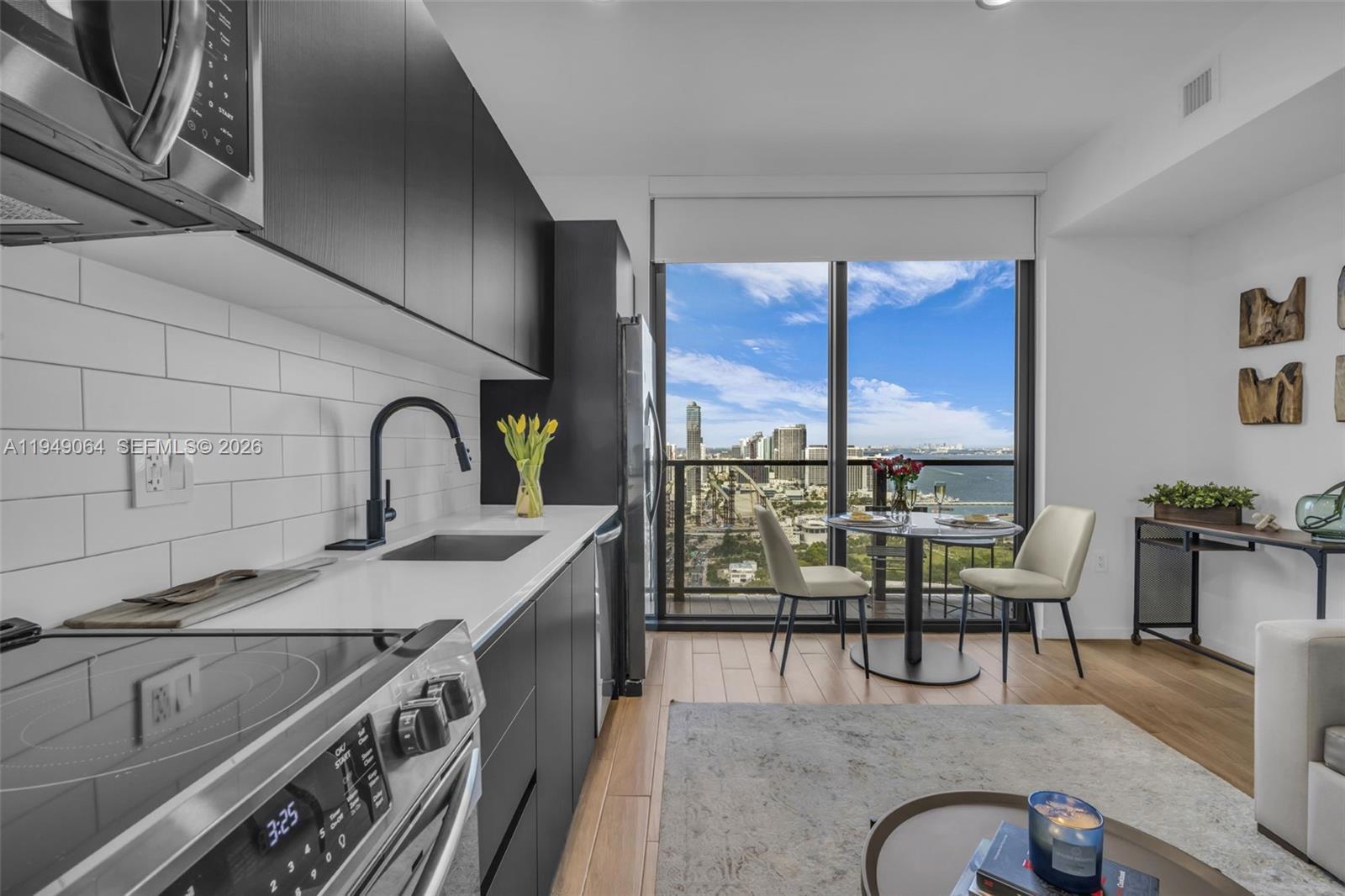 High-floor, fully furnished studio at The Elser Hotel & Residences showcasing panoramic skyline and Biscayne Bay views. Sleek open layout with wood-look porcelain flooring, floor-to-ceiling glass, and a private balcony. Turnkey and rental-ready with daily rentals permitted and no minimum lease—ideal for income-producing ownership or flexible luxury living. Full-service condo-hotel offering a 24/7 front desk, resort-style amenities, and a prime Downtown Miami location near Miami Worldcenter, dining, and entertainment.