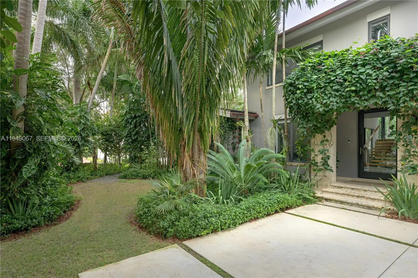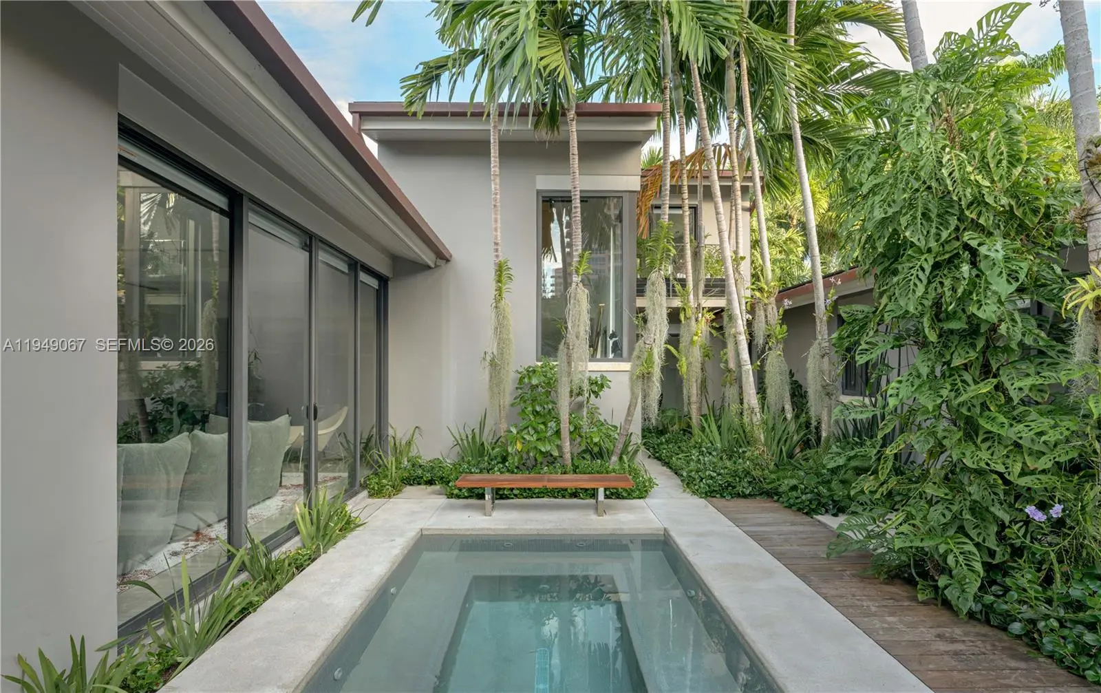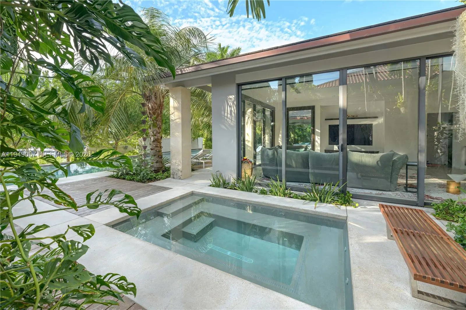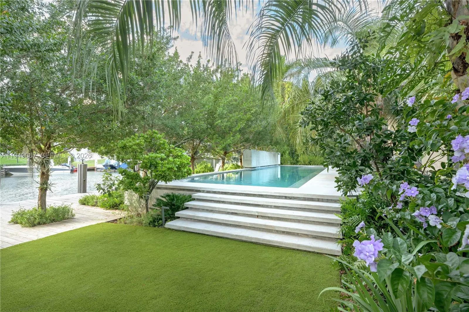 Located within guard-gated Sunrise Harbour, this exceptional waterfront residence offers 100 feet of seawall and a 60-foot dock, delivering direct, no-bridge access to Biscayne Bay for effortless cruising and quick ocean access. Designed with the boating lifestyle in mind, the property features upgraded dockage complete with pedestal and boat lift, providing ideal accommodations for day boats and watercraft. The grounds are a true work of art, showcasing custom landscape architecture by renowned Raymond Jungles, where sculptural tropical plantings create a private, serene oasis and frame each outdoor space with intention and beauty, while the pool and hot tub are seamlessly integrated into the landscape. The home offers 4 bedrooms plus a playroom, which can be converted to a fifth bedroom, and 4.5 bathrooms, all thoughtfully designed for effortless indoor-outdoor living. A prime opportunity to own a meticulously resort-style waterfront estate in a premier gated community of Coral Gables.