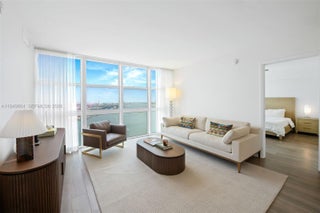 Refined Downtown Miami living awaits from this expansive 39th-floor 2 Bed + Den / 2 Bath residence at iconic 50 Biscayne, offered fully furnished for a truly turnkey opportunity. This large east-facing home is filled with natural light and framed by floor-to-ceiling impact glass showcasing sweeping views of Biscayne Bay, Bayfront Park and the Miami Beach skyline. The open-concept living and dining areas offer a seamless setting for entertaining, complemented by a sleek kitchen with black stone countertops, stainless steel appliances, and generous storage. A spacious den provides flexibility for a private home office, media lounge, or guest space, while the desirable split-bedroom layout enhances privacy and livability. The oversized primary suite features ample closet space and a spa-inspired bath with dual vanities, soaking tub, and glass-enclosed shower. Contemporary flooring, in-unit washer/dryer, and a clean neutral palette complete this move-in ready residence. 50 Biscayne offers full-service, resort-style amenities including a grand pool deck with cabanas and BBQ area, modern fitness center, sauna, steam and massage rooms, locker rooms, two resident lounges, business center, valet, 24-hour security, and concierge services. Ideally positioned just ssecondsfrom Bayfront Park, Bayside, Whole Foods, Kaseya Center, the Metromover, and minutes to Brickell City Centre with world-class dining, shopping, and nightlife.