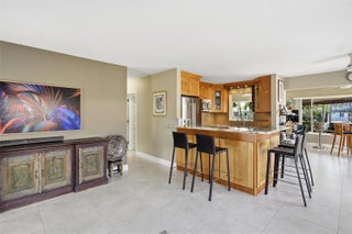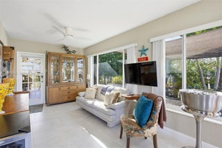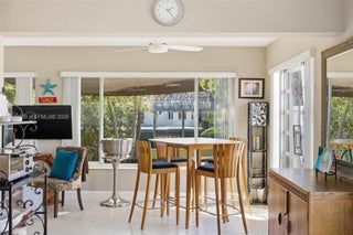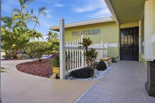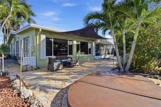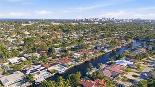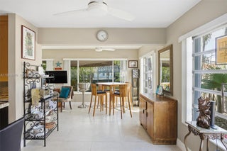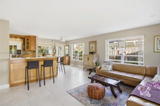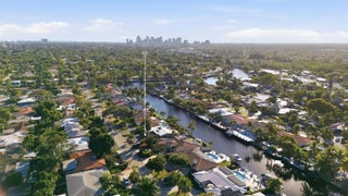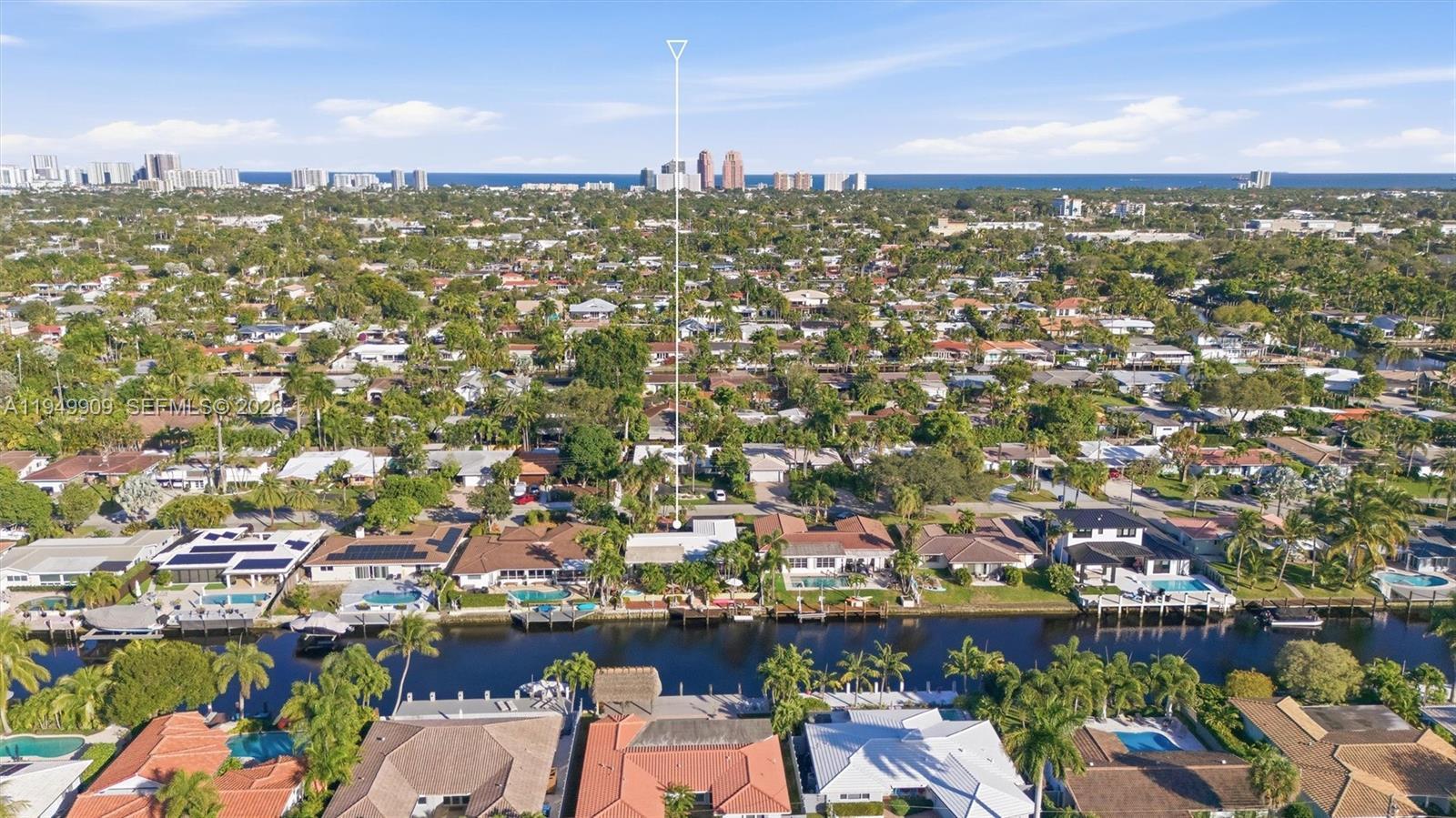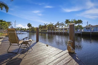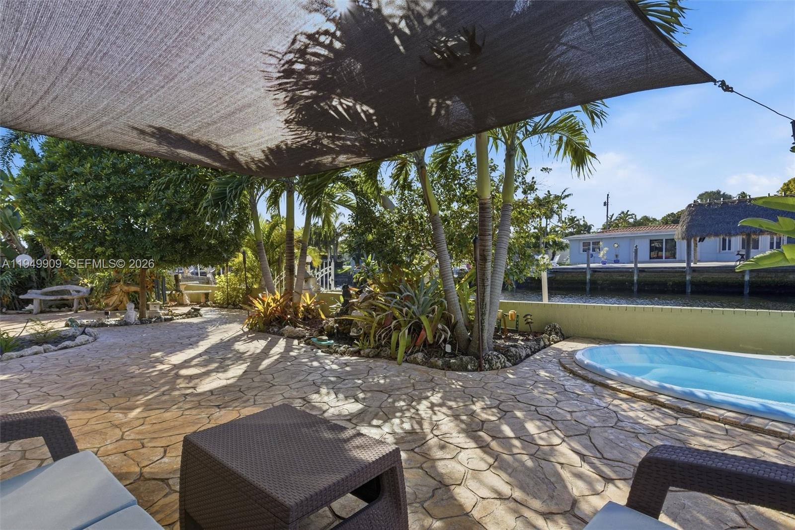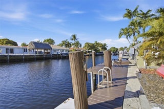 Impeccable and charming Wilton Manors waterfront retreat with ocean access. This 3 bedroom 2 bath residence features an elegant transitional style open concept kitchen with honey toned wood cabinets, glass fronted upper cabinet sections, matched granite countertops, mosaic tile backsplash, stainless steel appliances and under cabinet lighting. The primary bath has a bright, coastal inspired design with a fresh blue-and-white color scheme with a frameless glass enclosure shower. The spacious primary suite has abundant natural light. The secondary bath offers a large frameless glass enclosure shower finished in large format travertine tiles, and a mosaic tile shower floor. Porcelain tile throughout the living areas, wood floors in the bedrooms, smooth ceilings and recessed LED lighting throughout. No detail has been overlooked. Have peace of mind knowing that the roof was replaced in 2018, cast iron pipes replaced with PVC and electrical updated in 2014, new a/c, ductwork and insulation in 2024. Experience the best of South Florida living with an oasis inspired patio with natural stone pavers and a large in-ground freeform hot tub. From there you are a few steps away from your dock where you can experience waterfront lifestyle with access to davits with a 4,000 lb capacity and a floating dock, perfect for launching your watercraft.