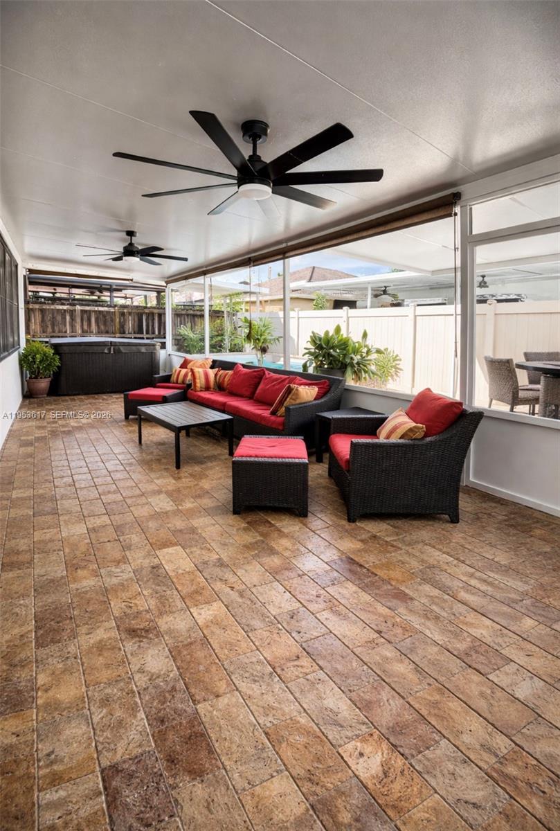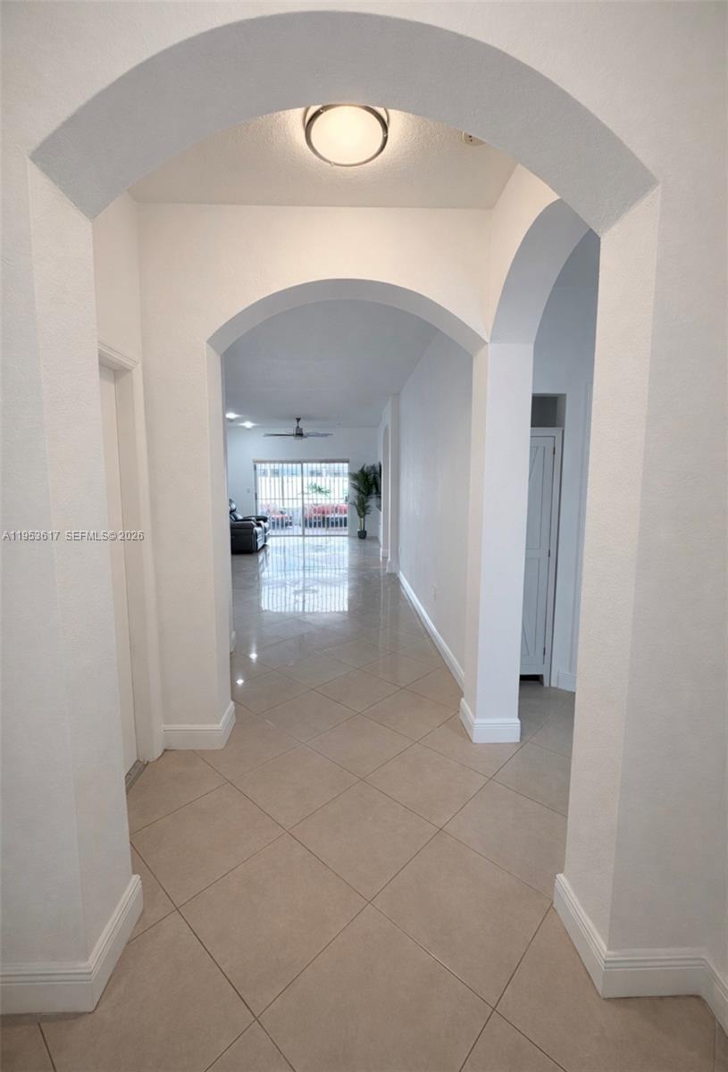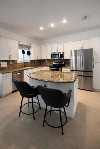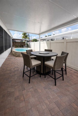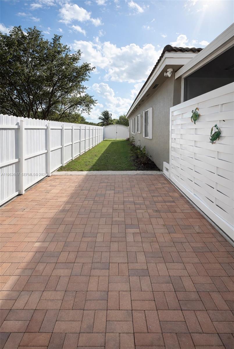 Beautiful 3-bedroom, 2-bath corner home offering tile flooring throughout and plantation blinds that enhance both style and functionality. The well-appointed kitchen features a center island, stainless steel appliances, and granite countertops, seamlessly connecting to the main living areas. The spacious primary bedroom offers a comfortable retreat and includes a main bathroom with a stand-up shower and dual sinks, along with a custom walk-in closet. This well-maintained residence also features two spacious terraces, perfect for outdoor entertaining and relaxing. The fully paved backyard offers low-maintenance living while enhancing the outdoor space. Enjoy resort-style living with a custom saltwater heated pool and jacuzzi, ideal for year-round enjoyment. The corner lot provides added privacy and curb appeal. No HOA, offering added flexibility and freedom for homeowners. A place to call home, where memories are made and every day feels like a getaway.