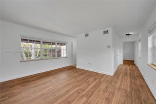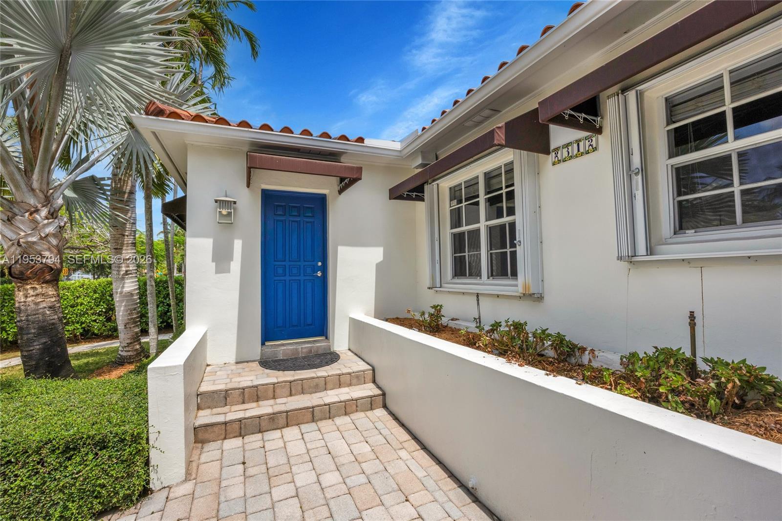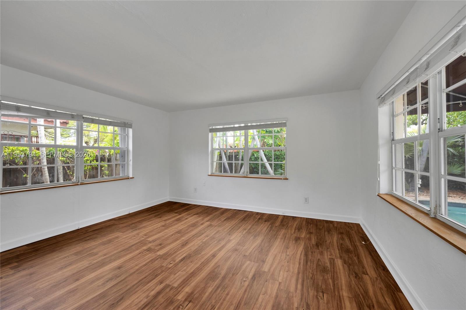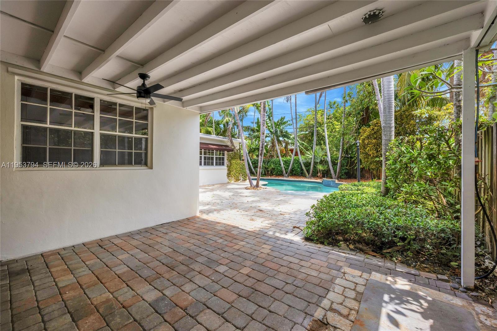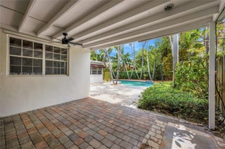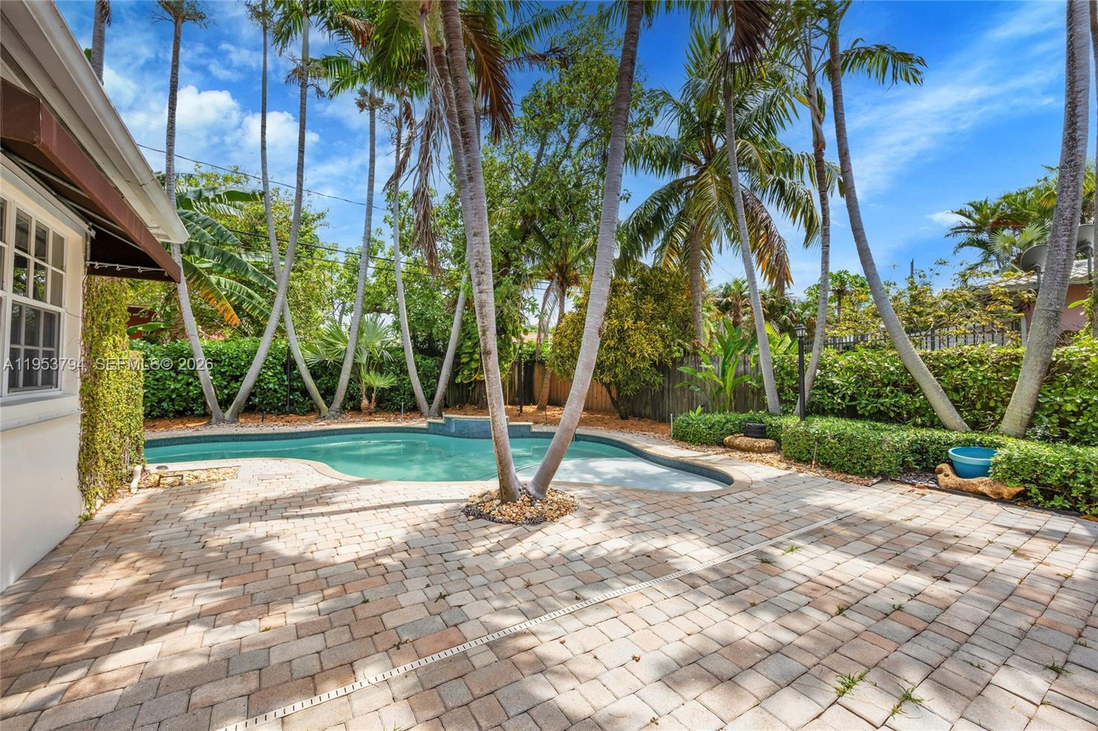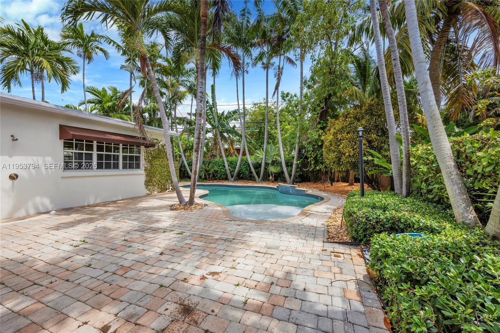 Silver Bluff pool home with timeless mid-century modern charm. This three-bedroom, two-bath residence is set on a quiet, tree-lined street and filled with natural light throughout. The kitchen features a spacious dining area, gas cooktop, wine cooler, and ample storage, perfect for everyday living and entertaining. Separate laundry area for added convenience. The primary suite is uniquely situated and accessed through the third bedroom, offering flexibility for use as a home office, nursery, or sitting room. Travertine bathrooms with two walk-in showers (no tub). Enjoy a private, fenced backyard with a saline pool featuring beach entry—ideal for relaxing or entertaining. Parking includes a one-car garage, one-car carport, and circular driveway. Prime location just minutes from Coconut Grove, Coral Gables, Brickell, Downtown Miami, Key Biscayne, and major expressways. Rent includes lawn and pool maintenance. Tenant responsible for water/sewer, electricity, gas, and internet/cable.