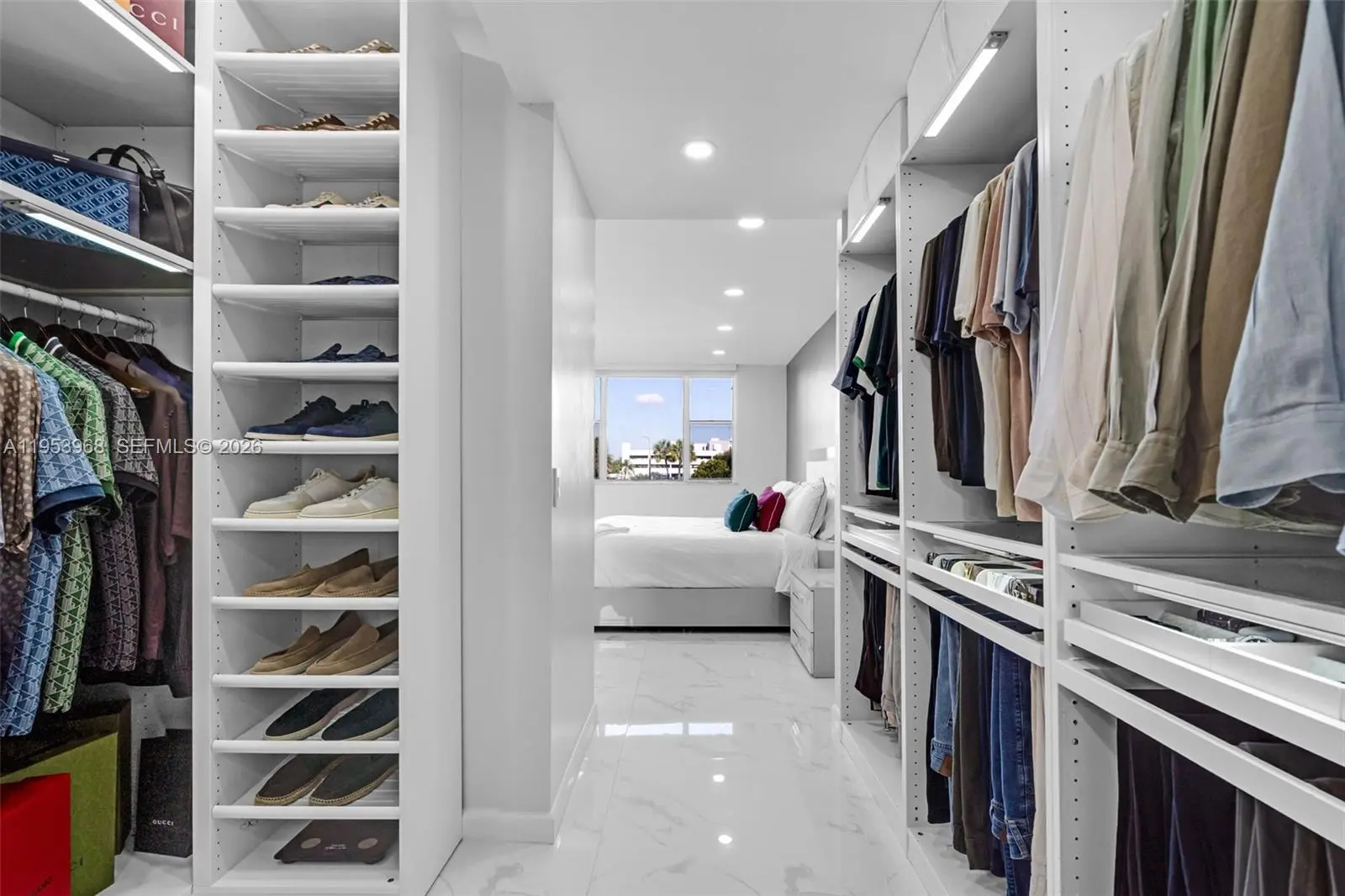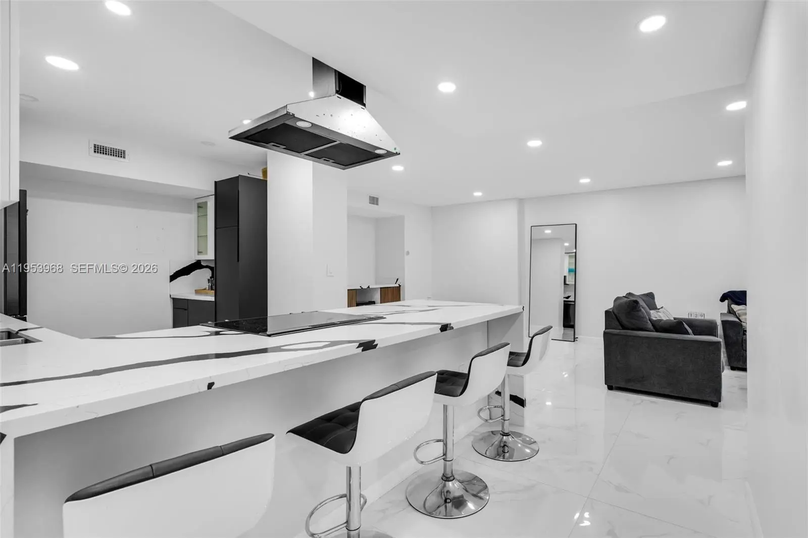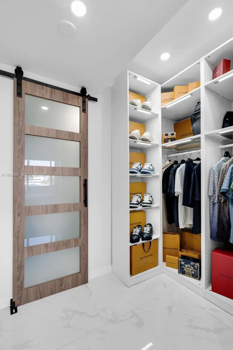 Step into a refined modern residence defined by clean lines, elevated finishes, and effortless sophistication. Expansive open living spaces are wrapped in sleek porcelain flooring, creating a bright, gallery like atmosphere ideal for both entertaining and everyday living. The custom chef’s kitchen anchors the space with striking waterfall countertops, contemporary cabinetry, premium appliances, and a dramatic island designed for both function and statement. The primary suite is a true retreat, featuring generous proportions and a custom walk-in closet designed like a private boutique-complete with built-in shelving, drawer systems, and dedicated space for curated wardrobes and accessories. A spa-inspired bath completes the experience with modern finishes and a glass-enclosed shower. Every detail has been thoughtfully curated to deliver a turn-key, luxury lifestyle with timeless appeal.