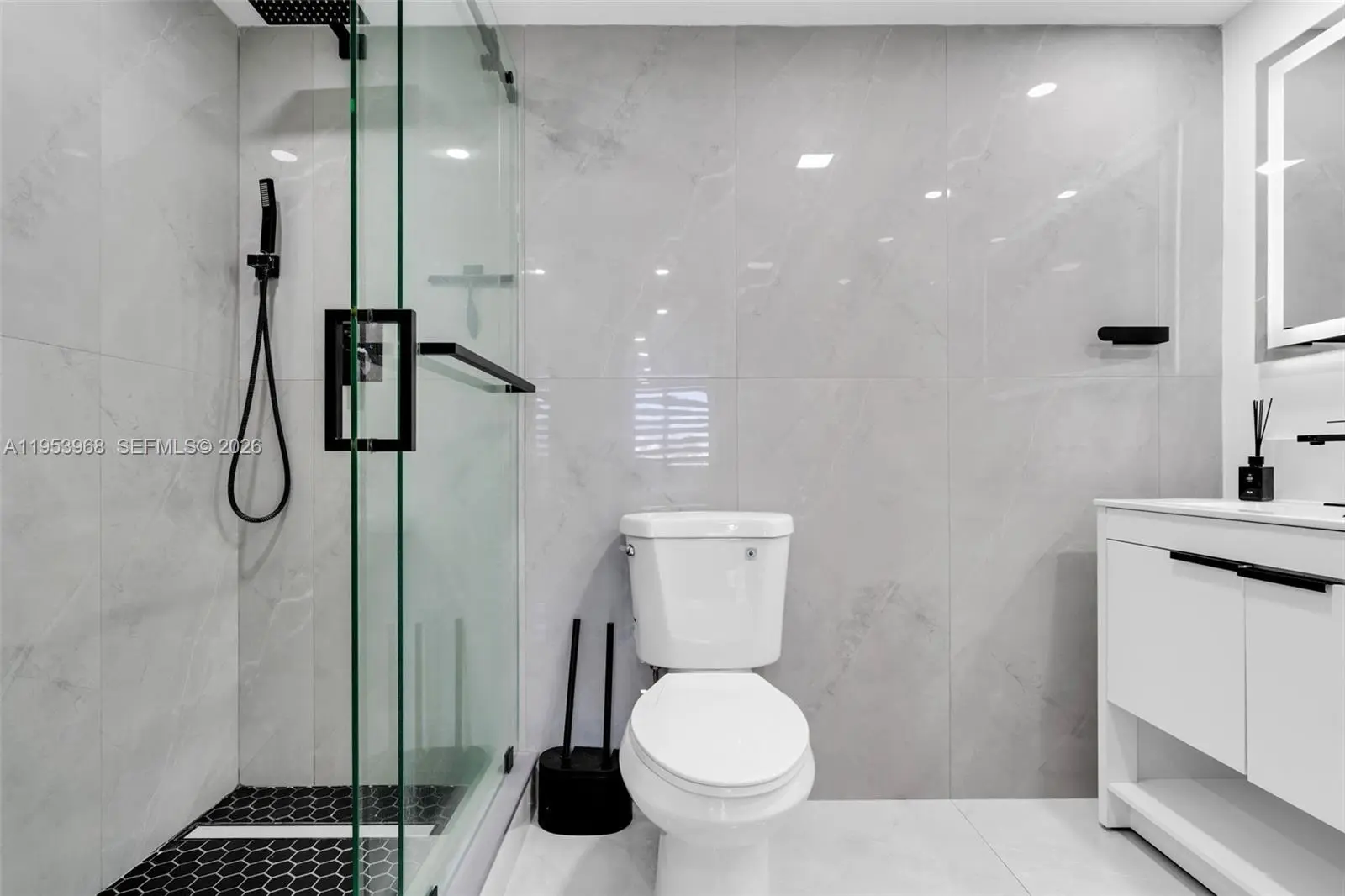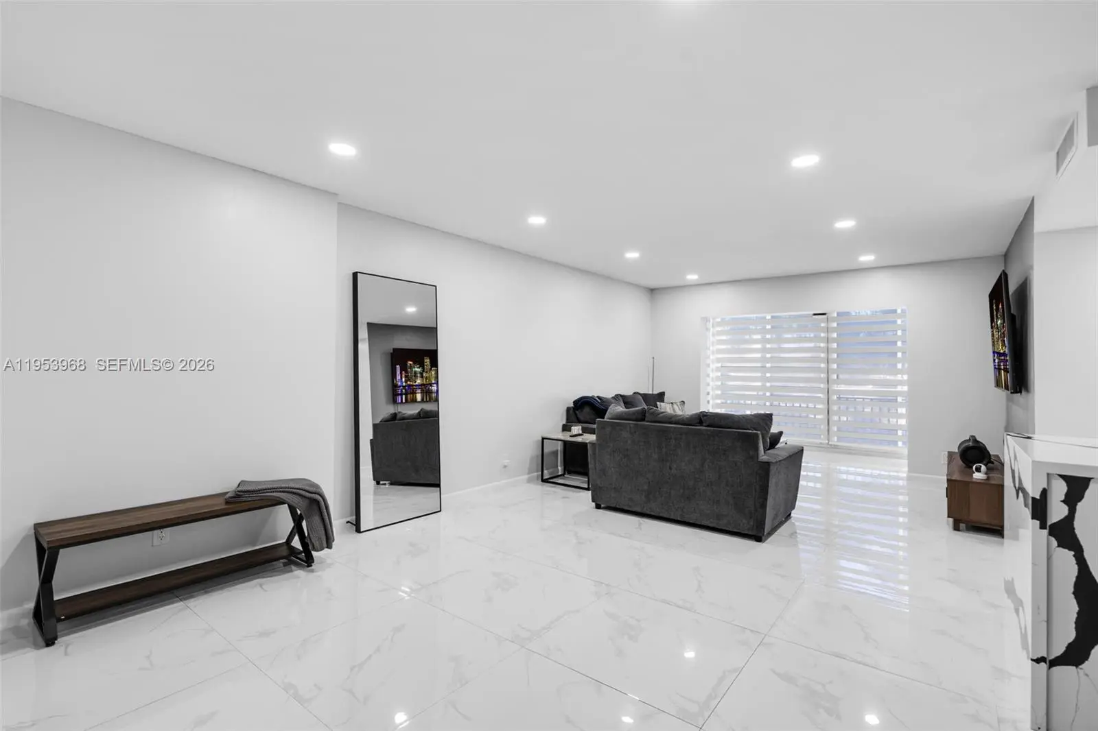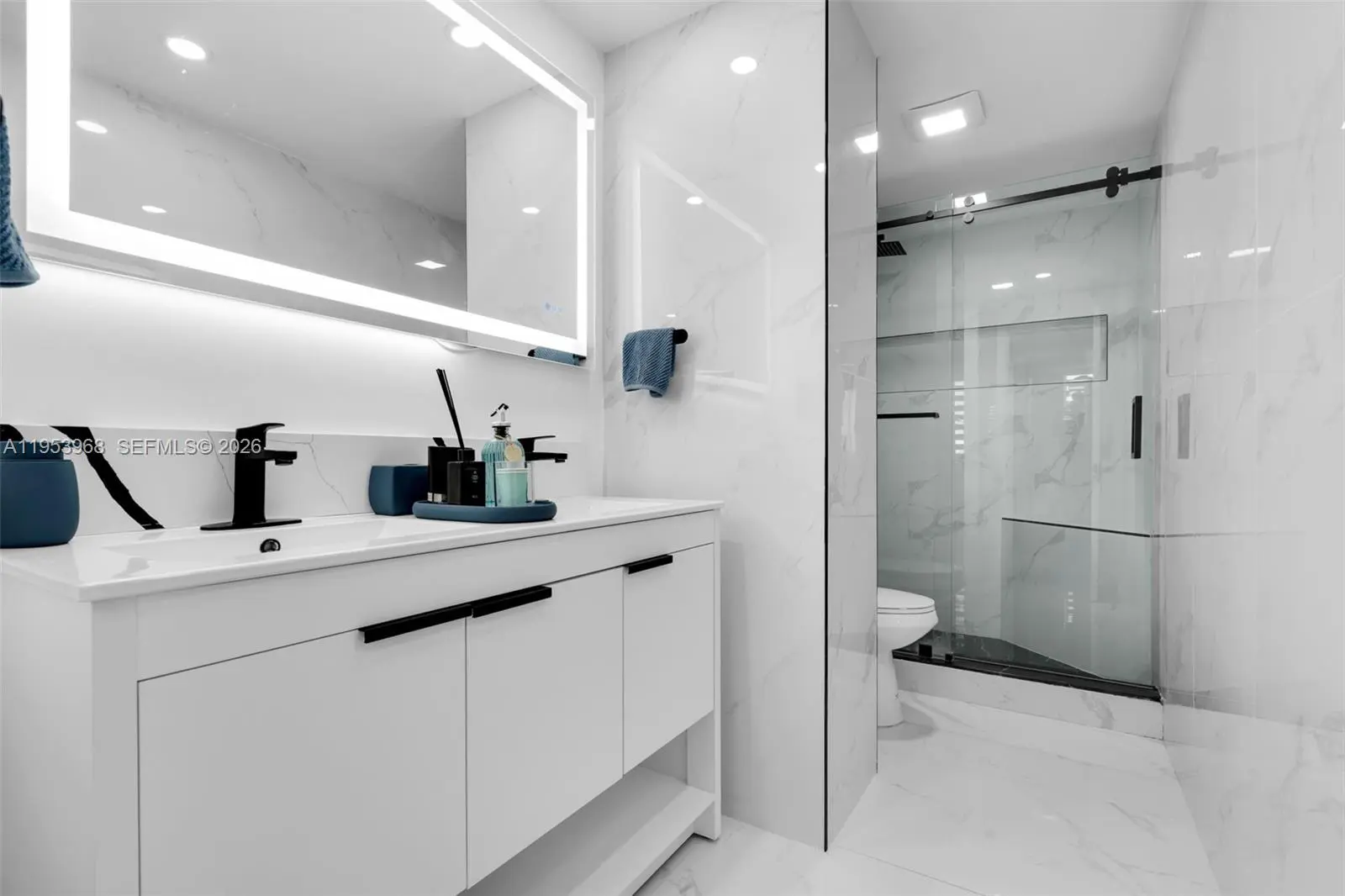 Step into a refined modern residence defined by clean lines, elevated finishes, and effortless sophistication. Expansive open living spaces are wrapped in sleek porcelain flooring, creating a bright, gallery like atmosphere ideal for both entertaining and everyday living. The custom chef’s kitchen anchors the space with striking waterfall countertops, contemporary cabinetry, premium appliances, and a dramatic island designed for both function and statement. The primary suite is a true retreat, featuring generous proportions and a custom walk-in closet designed like a private boutique-complete with built-in shelving, drawer systems, and dedicated space for curated wardrobes and accessories. A spa-inspired bath completes the experience with modern finishes and a glass-enclosed shower. Every detail has been thoughtfully curated to deliver a turn-key, luxury lifestyle with timeless appeal.