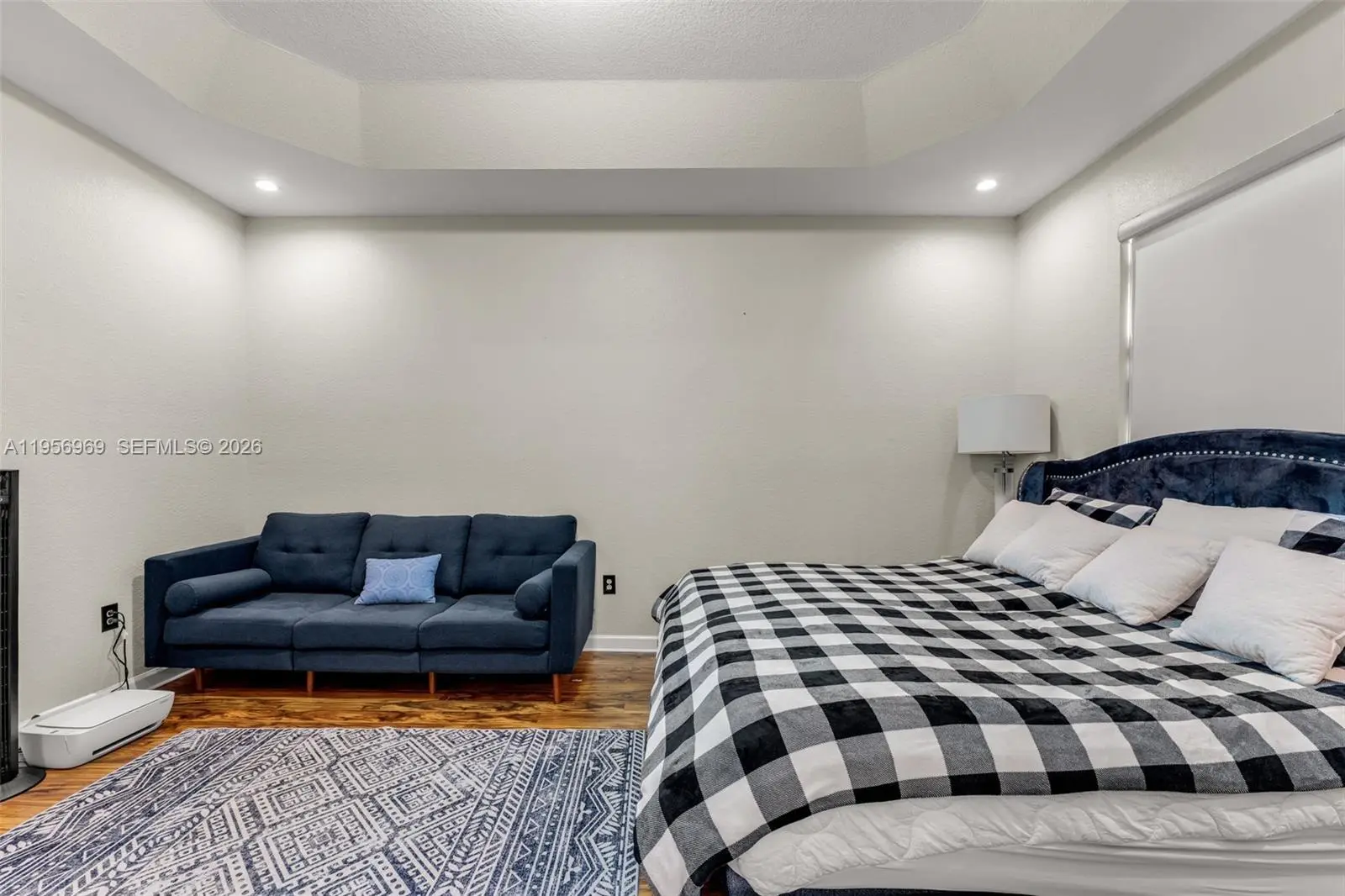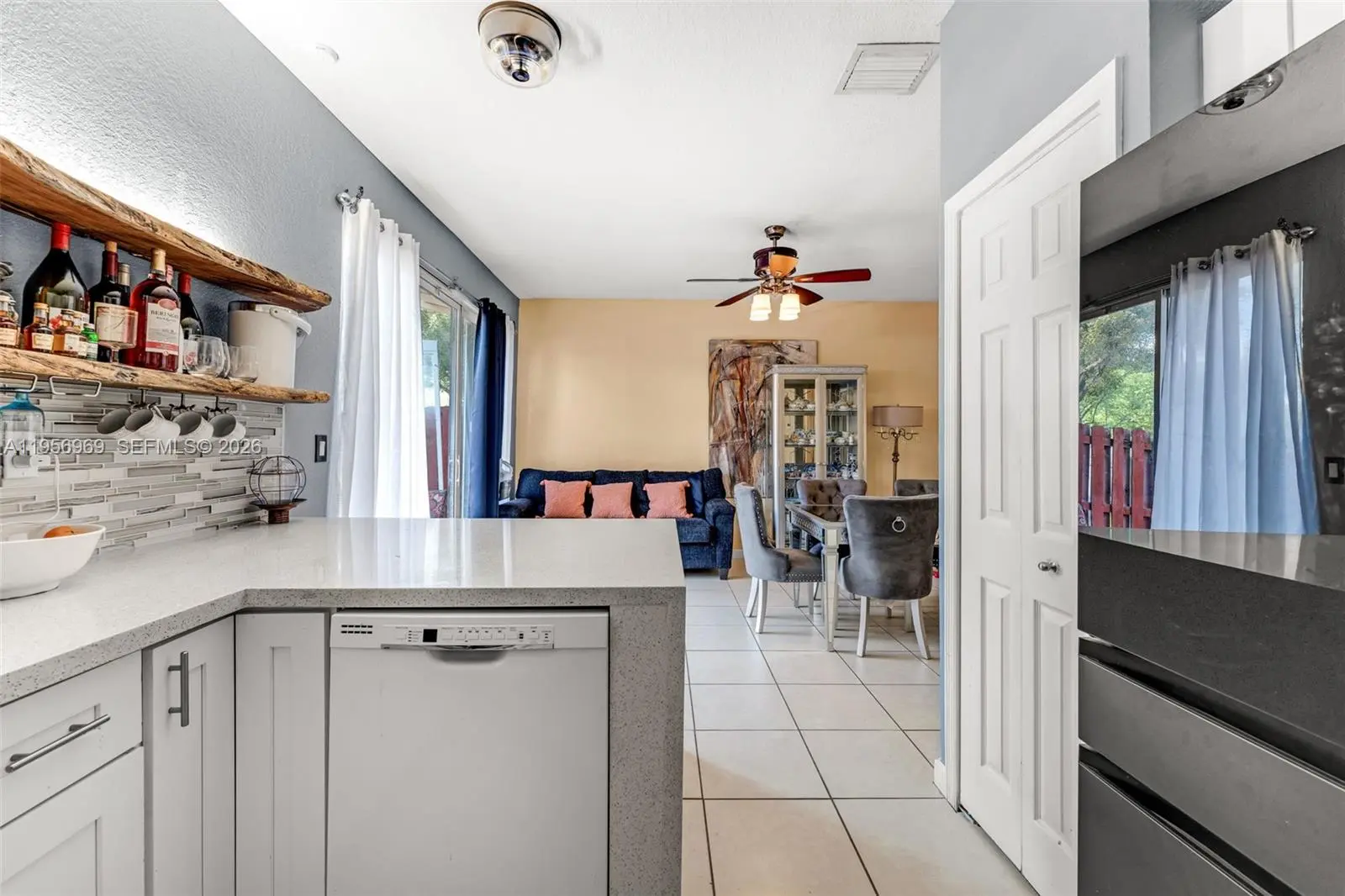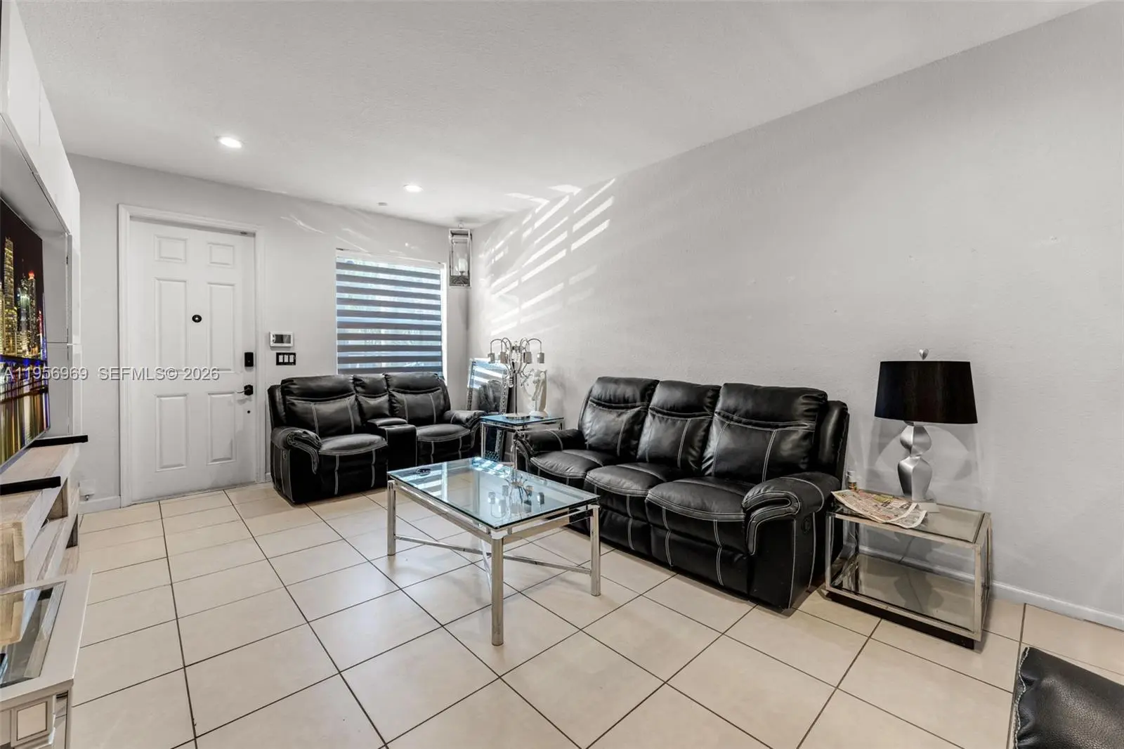 Elegant Mediterranean-style townhouse offering 3 bedrooms and 2.5 baths. This residence features a spacious living area with a refined dining space overlooking a private patio, ideal for both relaxing and entertaining. The modern kitchen showcases white cabinetry and waterfall quartz countertops. Tile flooring enhances the first level, while laminate wood flooring adds warmth to the second floor. Generously sized bedrooms include a large walk-in closet, and one bedroom opens to a private balcony through French doors. Laundry area located upstairs for convenience. One-car garage, accordion shutters, and a well-maintained roof. Electrical water heater and A/C are in proper working order. Property is subject to inspection. Refrigerator to be replaced at closing. Showings by appointment only.