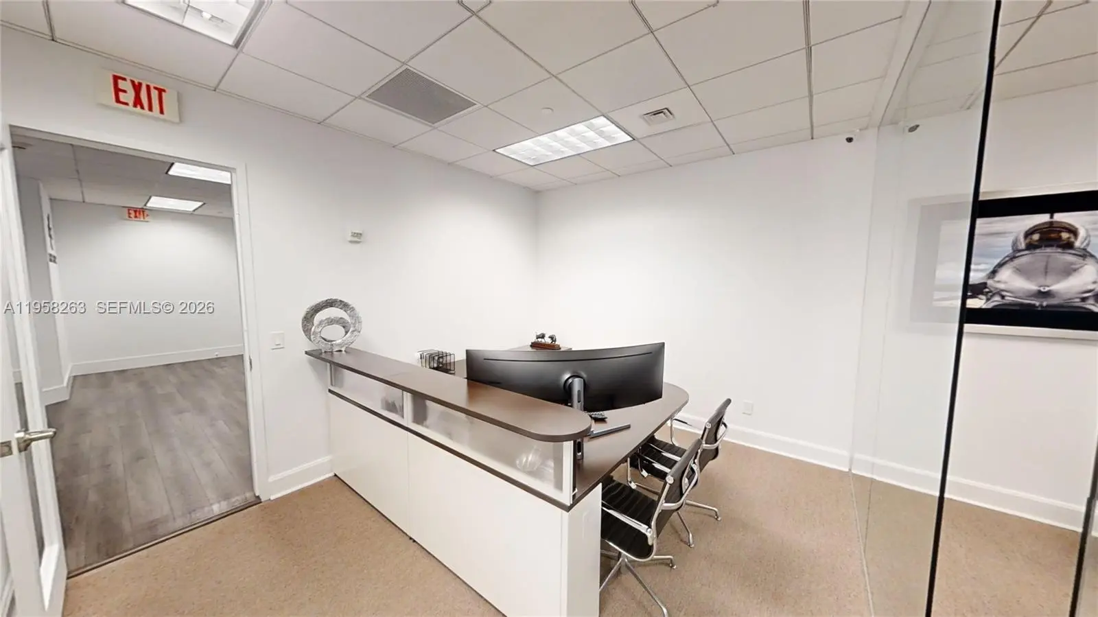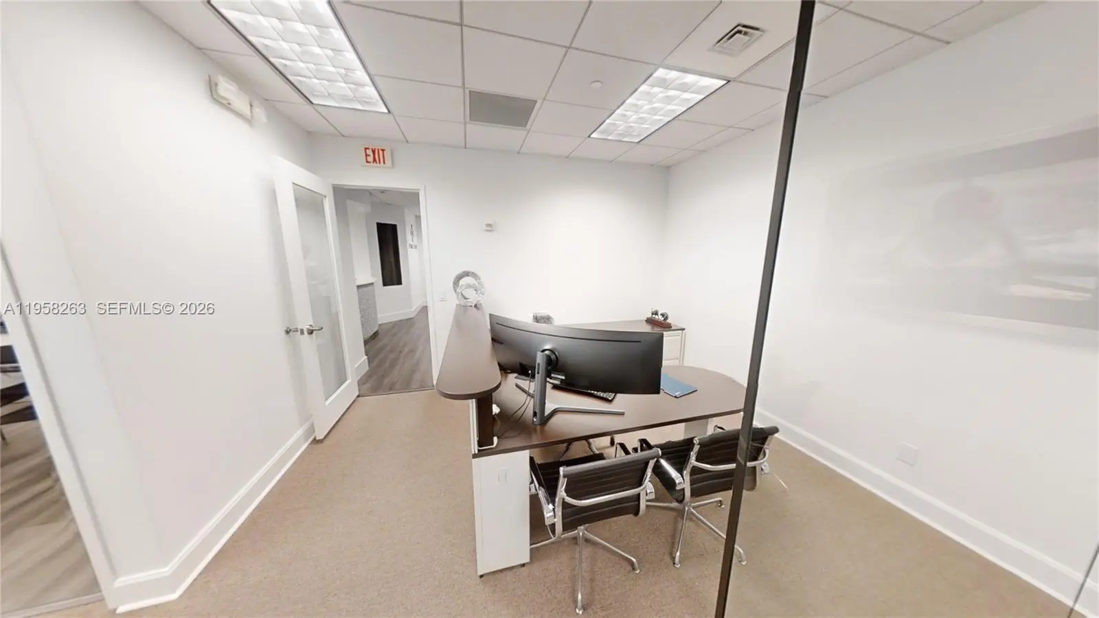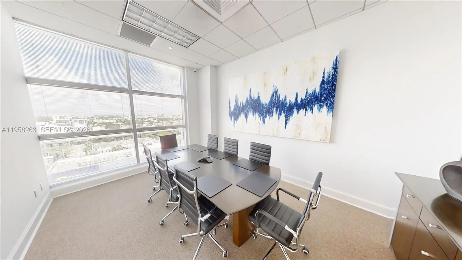 Shared Corner Office Fully Furnished 1472 sq ft available of the 2124sq ft total. Up to 3 separate work stations available plus large conference room and kitchen. One 25' x 12' office desk area, One 20' x 19' Five person workstation, One 8' x 10' reception desk workstation. Private entry waiting room, IT room and filing cabinets. 2 owner occupants in financial service industry. Latitude office building located on Miami Riverwalk path with on-site restaurants & valet.