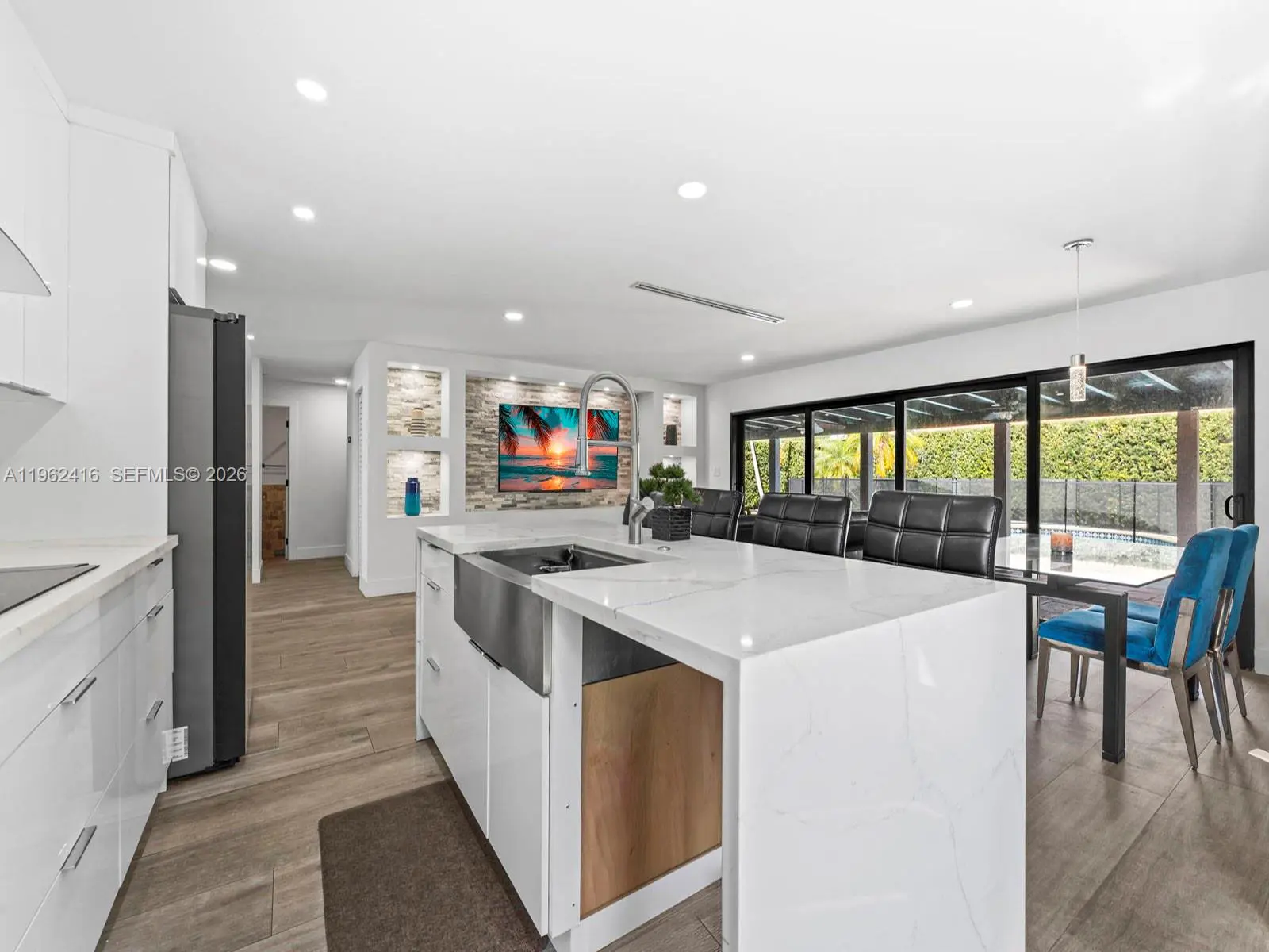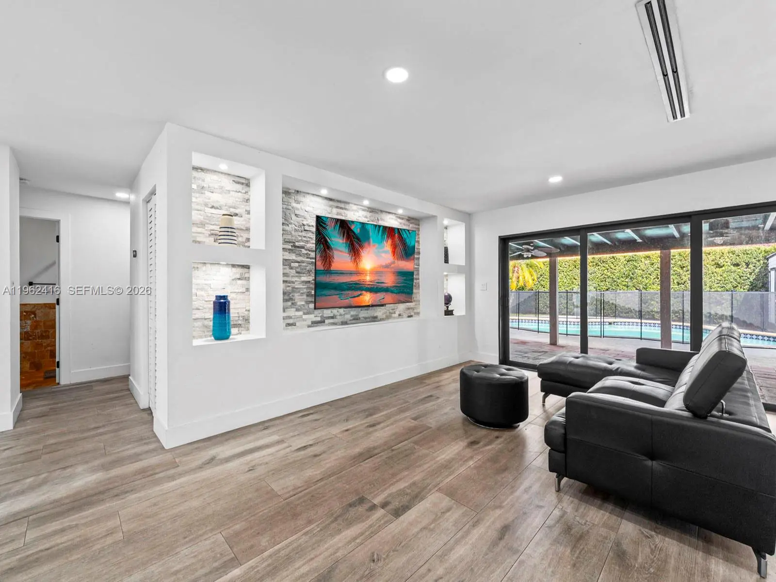 Welcome to your dream home! This exquisite 1,700 sqft residence is situated on a generous 9,800 sqft corner lot, offering a beautifully spacious layout. The property features a large two-car garage, providing ample room for parking and additional storage. As you enter, you'll be greeted by a stunningly remodeled kitchen, adorned with sleek cabinetry and modern finishes that will delight any cooking enthusiast. The elegant living spaces are complemented by luxurious lath porcelain tile floors, which offer both style and durability. Step outside to enjoy the exceptional outdoor living area, featuring a sizable terrace that overlooks a sparkling pool. This space is perfect for entertaining guests or simply unwinding with family and friends. Balancing comfort and functionality, this home serves as an ideal retreat for those in search of a harmonious blend of luxury and everyday living. Seize this remarkable opportunity to make this beautiful residence your own! Microwave/Oven and Dishwasher will be installed prior to closing.