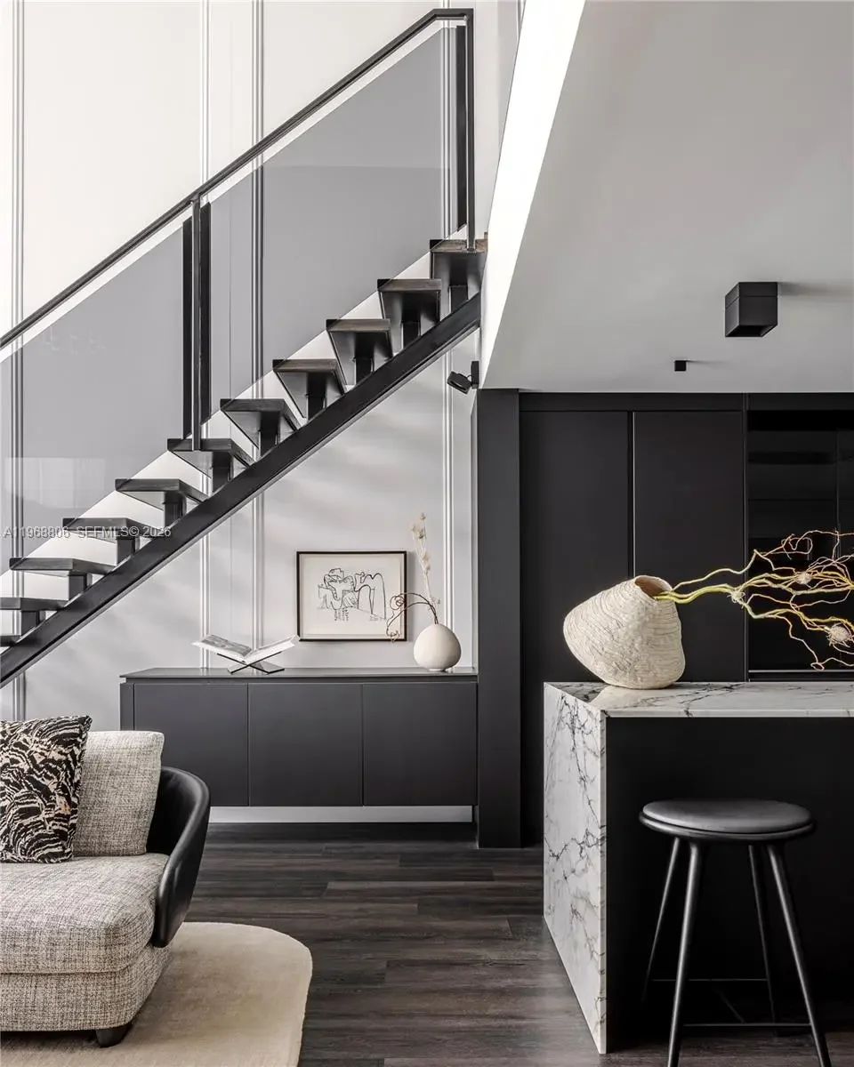 A masterful blend of architecture and refined design, this striking loft-style residence rises 22 floors above the city within the renowned Ten Museum Park, conceived by acclaimed architect Chad Oppenheim. Thoughtfully curated by the award-winning team at B&G Design, this 1,802 SF two-bedroom, 2.5-bath home is framed by dramatic 20-foot impact glass walls that bathe the interiors in natural light and capture sweeping panoramic views. Clean-lined cabinetry, a bold smoked-glass and steel staircase, and custom vertical millwork create sculptural focal points rarely found in comparable residences. The expansive east-facing exposure overlooks Museum Park, Biscayne Bay, and the glittering skylines of Miami and South Beach. The contemporary chef’s kitchen is appointed with premium stainless-steel appliances by Miele, Sub-Zero, and Bosch, anchored by a bespoke island designed for both function and statement. Richly textured flooring, imported marble finishes, and tailored built-ins further enhance the home’s modern aesthetic. Additional highlights include motorized solar shades, a full-size Miele washer and dryer, two designated parking spaces, and climate-controlled storage. Furniture available for sale. Residents enjoy access to Ten Museum Park’s exclusive Five-Star Wellness Amenities, internationally recognized for redefining luxury resort living, highlighted by the world-renowned Clinique La Prairie Spa of Montreux, Switzerland.