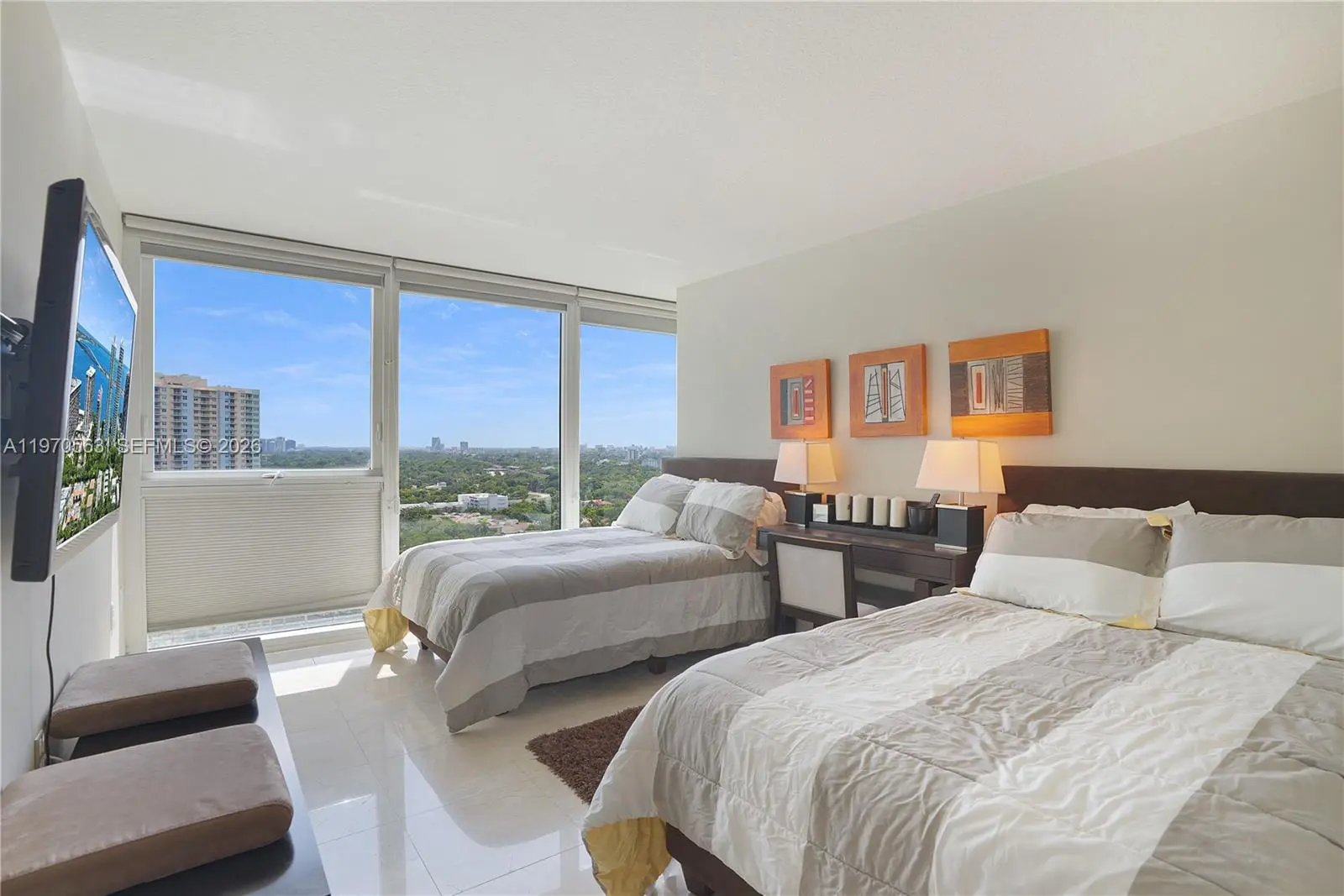 Exquisitely 2B 2Ba renovated corner turn-key unit! Beautiful furniture. Breathtaking skyline views of all of Miami and the bay directly from your bedroom. Marble floors throughout. Walk-in closets, blackouts in bedrooms, stainless steel appliances, granite countertops. Includes 2 parking spaces and a storage unit! Resort-style amenities: Marina, BBQ area, gym overlooking the bay