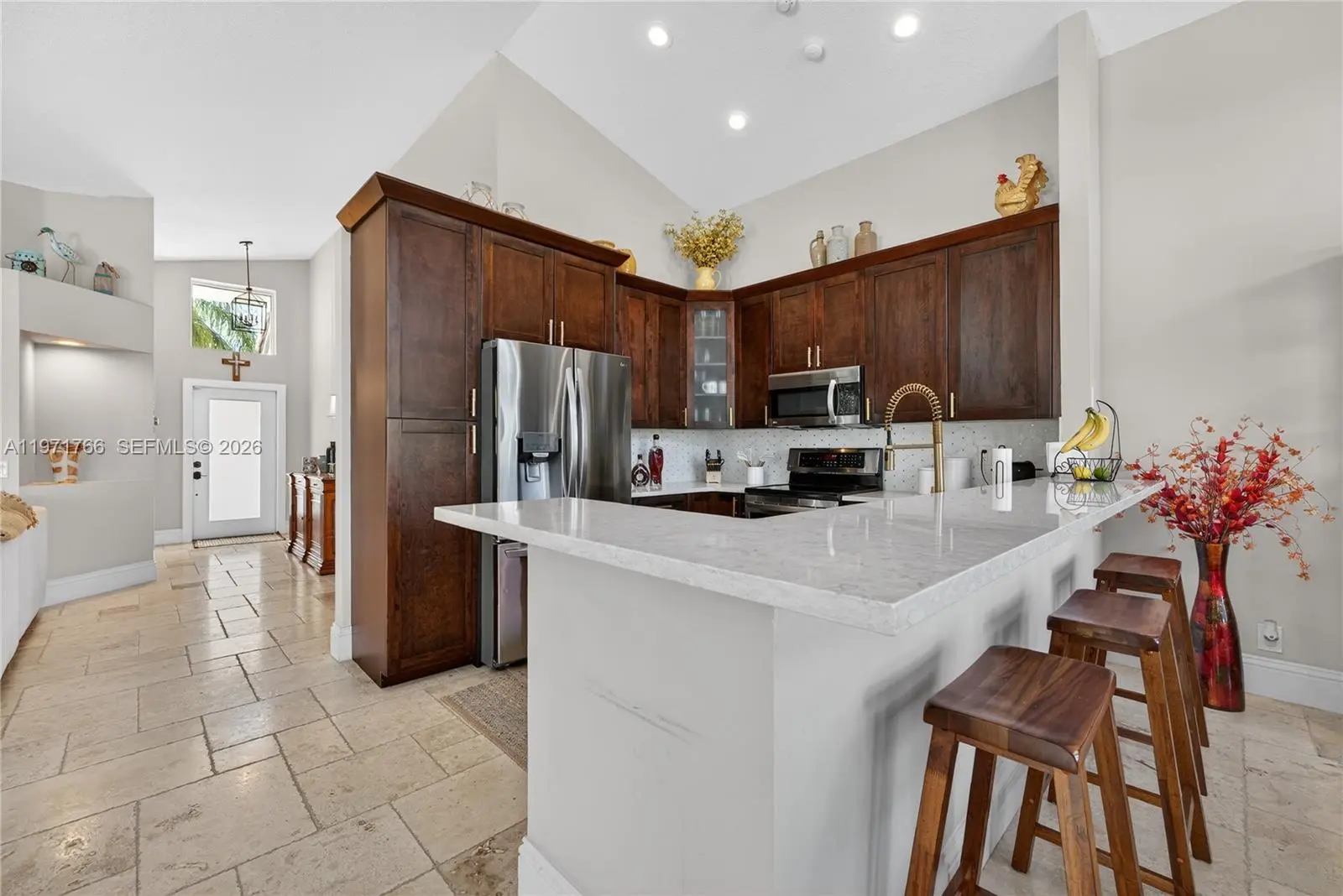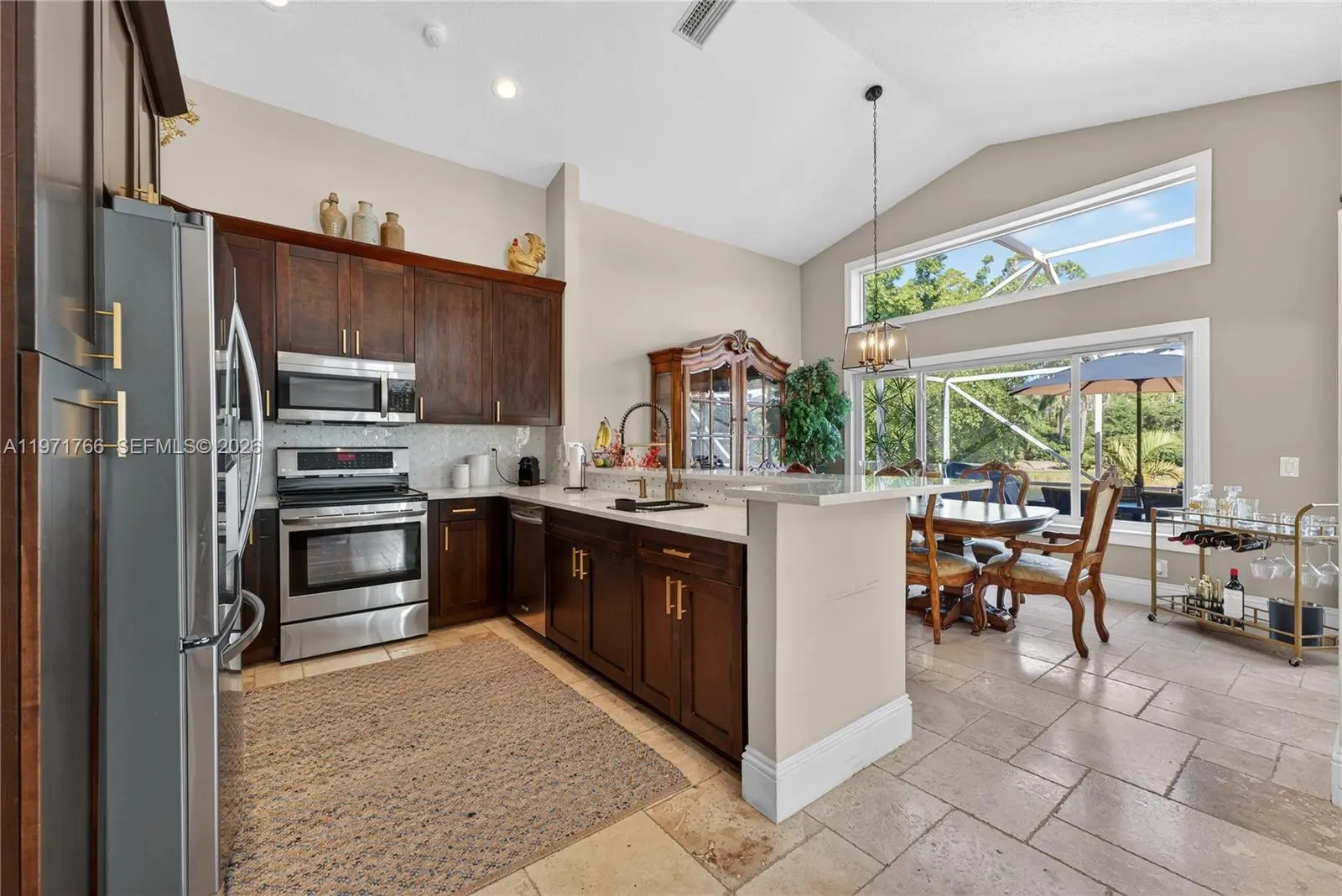This stunning 3-bedroom, 2-bath waterfront home is move-in ready and waiting for its new owner! Designed for both comfort and style, the property features impact windows and doors, a 2019 roof, and a beautifully updated open-concept kitchen complete with rich dark wood cabinetry, quartz countertops, and stainless steel appliances. A convenient front-loading washer and dryer are also included. Travertine tile flows seamlessly throughout the home, while the bathrooms showcase elegant wood vanities and tasteful tile accents. Unwind on the spacious screened patio and take in peaceful water views — the perfect setting for morning coffee or evening relaxation. Ideally located just steps from the community pool, playground, and basketball court. Close to top-rated “A” schools, shopping, and dining. Please note: No leasing permitted during the first two years of ownership and no corporate ownership allowed. Association approval is required. See Broker’s Remarks for additional details.