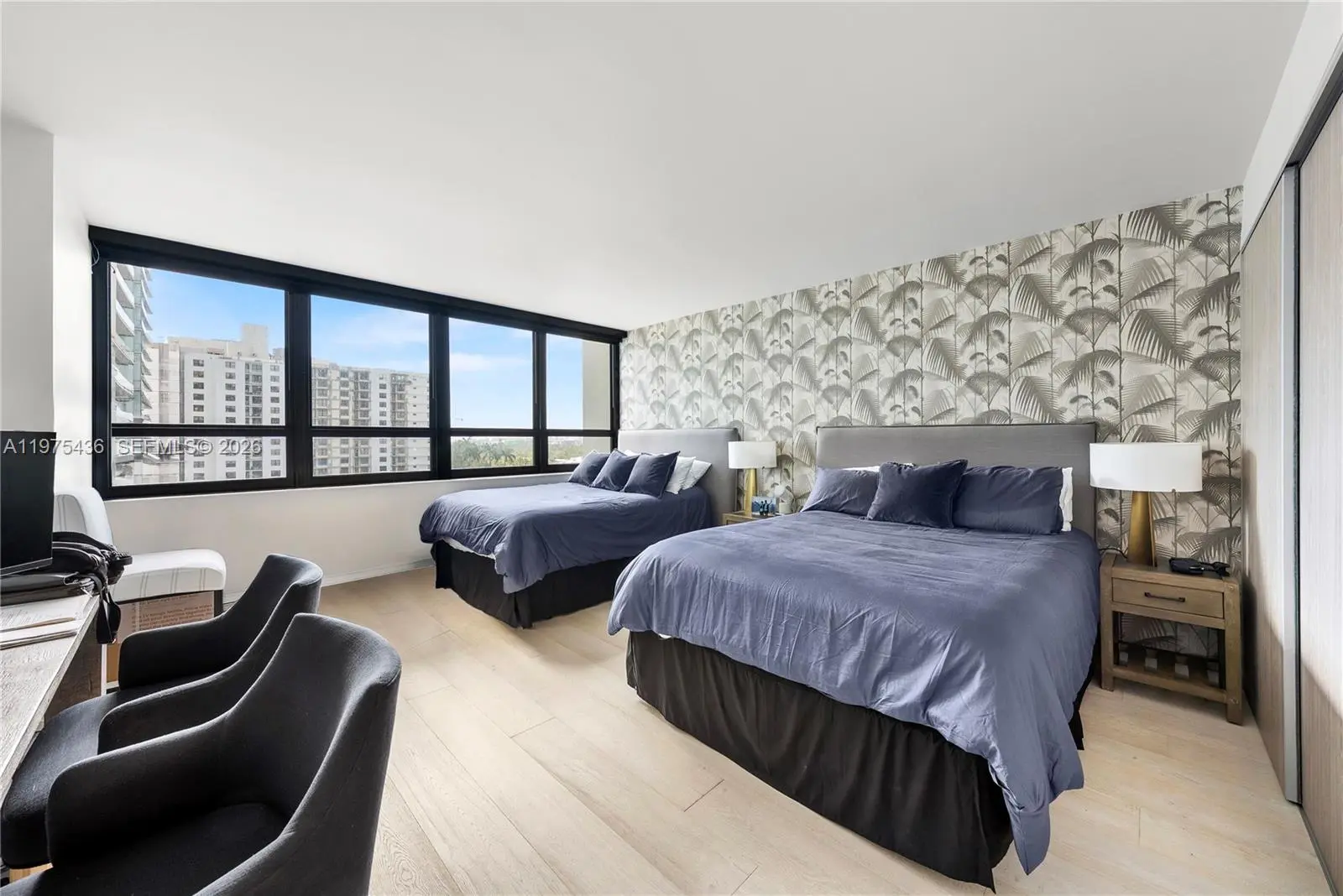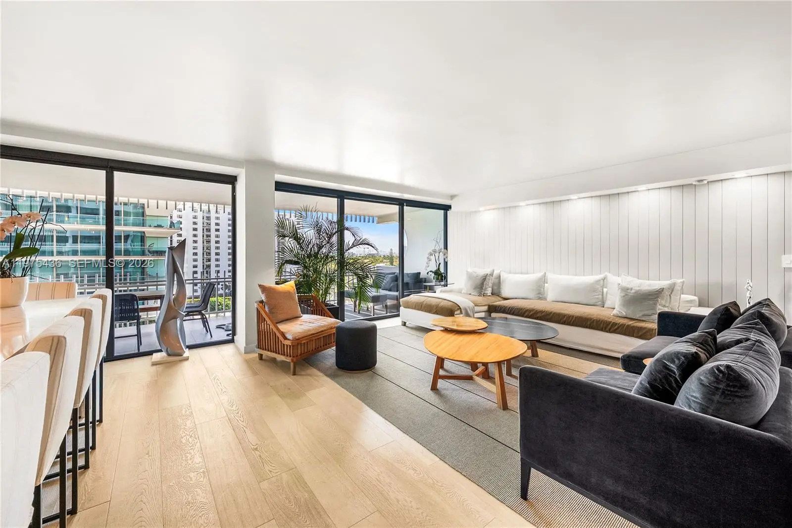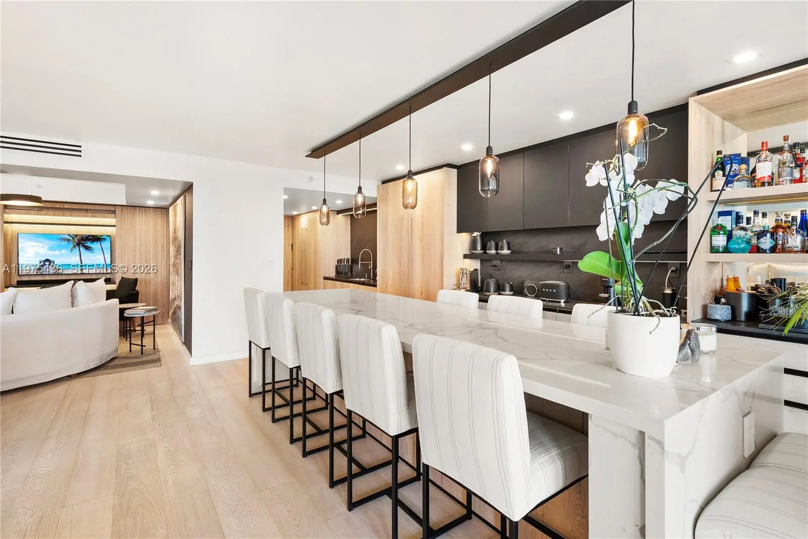 Located at Kenilworth Condominium, one of Bal Harbour’s most prestigious oceanfront residences, this fully renovated 2,060 SF apartment combines generous scale, architectural detailing, and carefully curated finishes. The expansive living area has been designed as three distinct seating environments, creating a flexible layout for entertaining, lounging, and formal living while maintaining strong visual continuity and natural light. Hurricane-impact windows frame open ocean views and bring brightness throughout the interiors. The kitchen has marble and stone counter & serves as an integrated dining bar, complemented by a separate butler’s kitchen that provides additional preparation and storage space. The appliance suite includes a Liebherr panel-ready integrated refrigerator, Wolf induction cooktop, Wolf professional hood, and Wolf M Series built-in oven, paired with a Franke chef-style pull-down faucet. The residence features two bedrooms, two bathrooms, and a powder room, the latter finished with distinctive Gucci wallpaper. Bathrooms are appointed with Axor Starck fixtures from the Philippe Starck collection. Custom millwork defines the interiors, including fully built-in illuminated closets designed for maximum efficiency, wood-clad wall panels, and architectural soffits integrated throughout the residence. A covered terrace measuring approximately 9' x 12' extends the living space outdoors. Unit is in stunning conditions. Very easy to show!