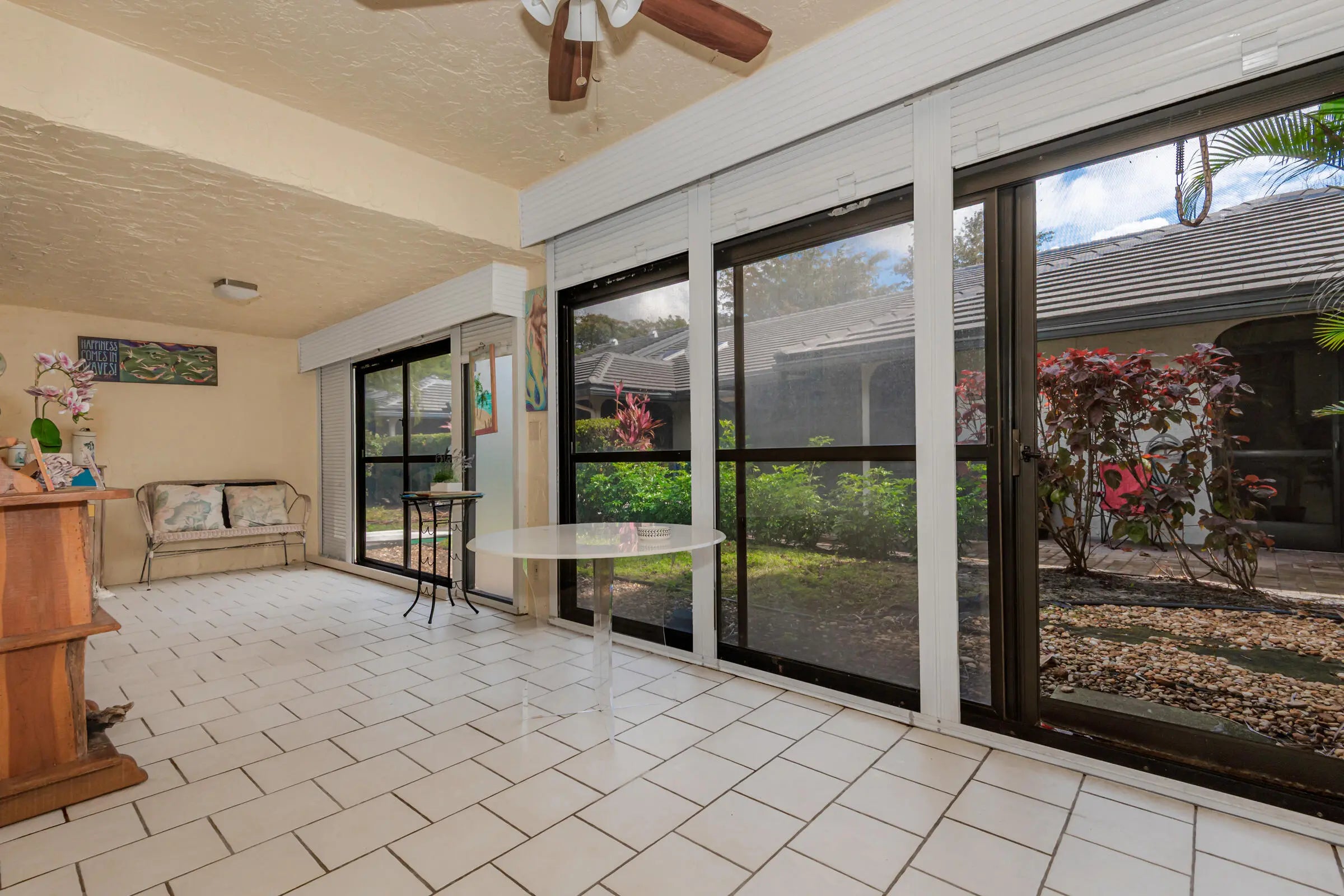 Spacious, villa with garden view on cul-de-sac in sought after community. laminate floors, large table size kitchen with granite counters, updated cabinets, and newer appliances. Enclosed and screened oversized lanai. Three sola tubes and one skylight brighten the house. Attached carport. Two spacious bedrooms with two updated baths. Master bedroom has large walk-in closet. Banyan springs is a very active 55+ gated community w/ a restaurant, 2 resort style heated pools & 2 spas, fitness center w/ free personal trainer, grand social hall for shows & parties, pickleball & tennis, many clubs & card games to join, current events seminars, etc.