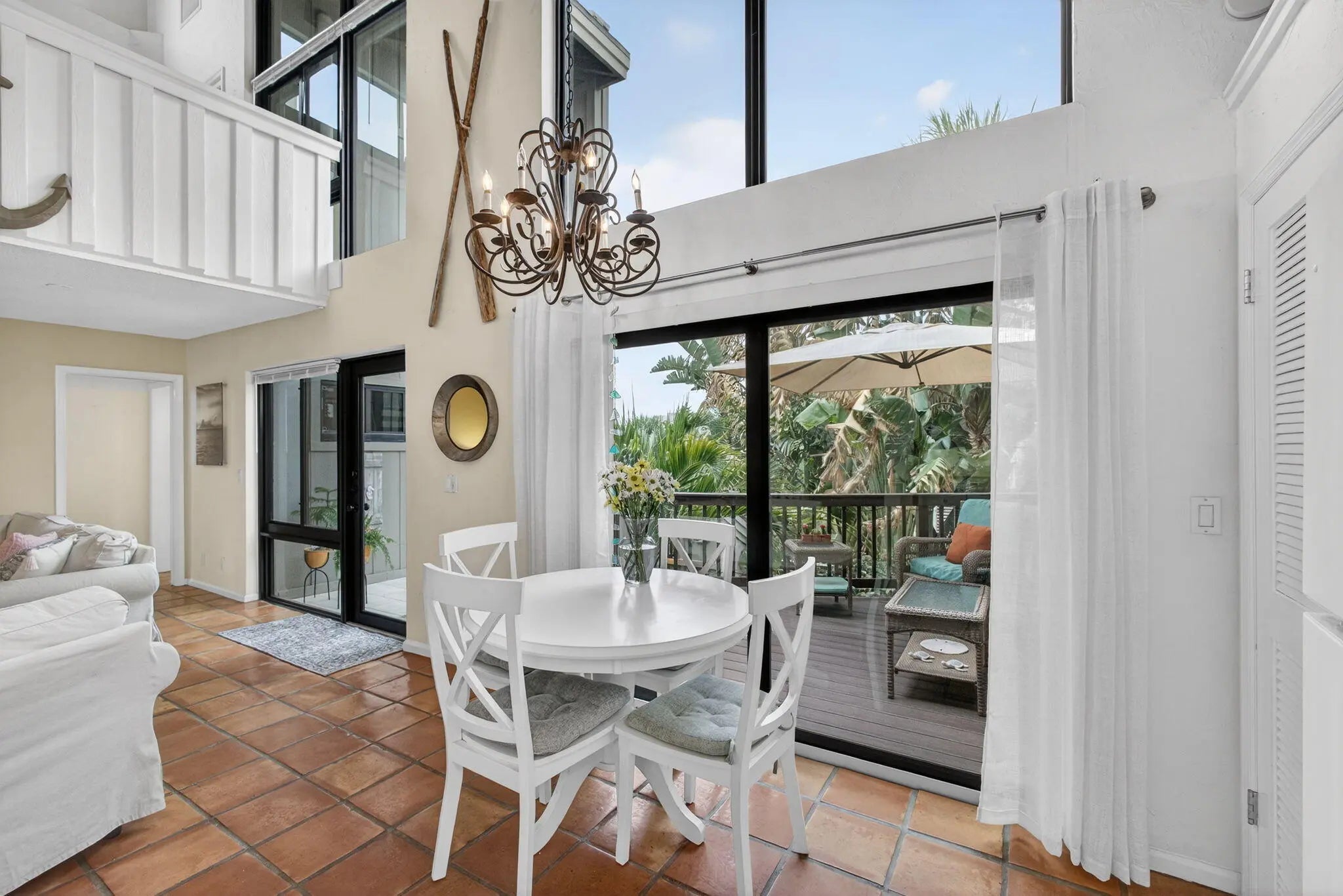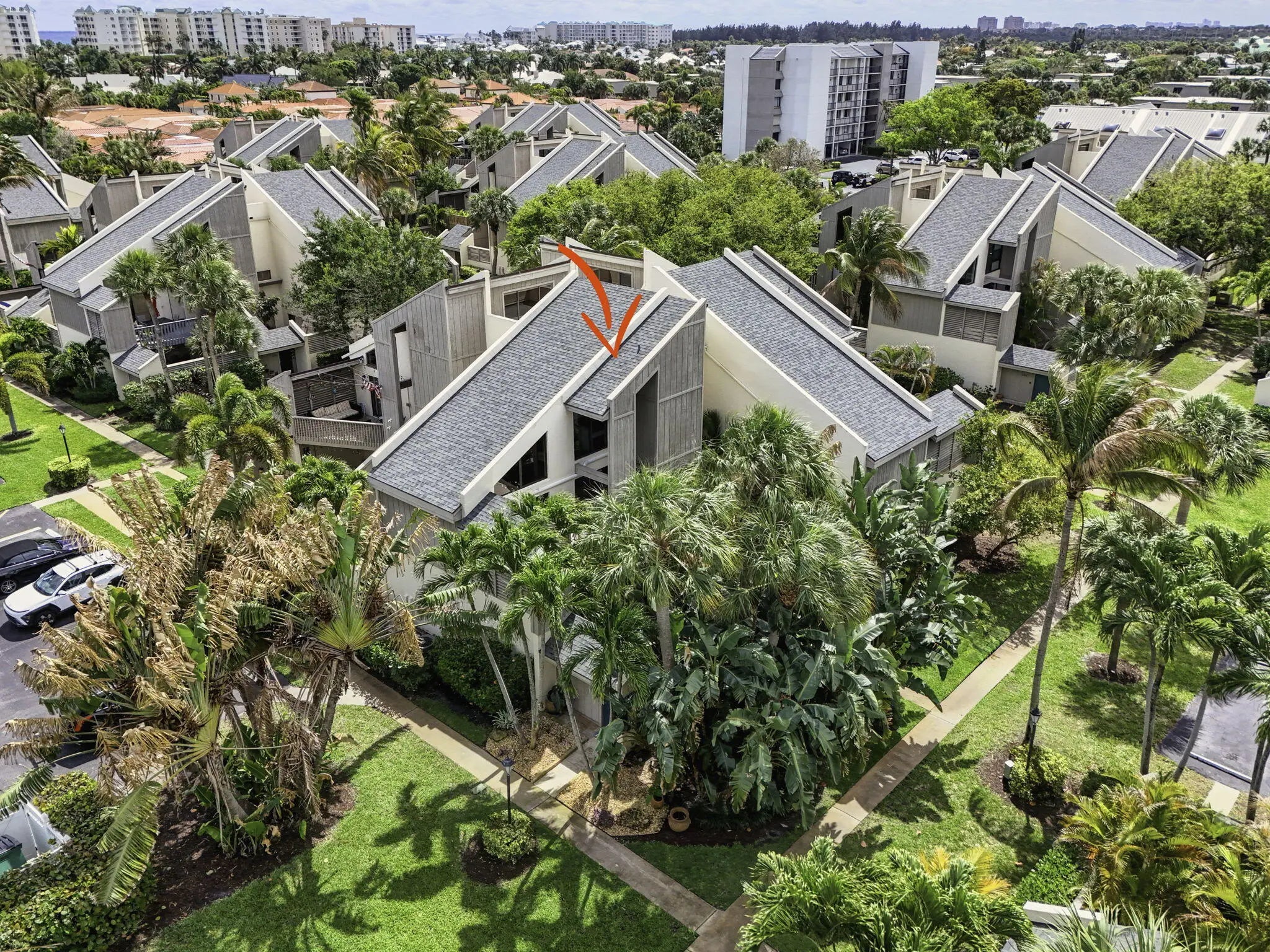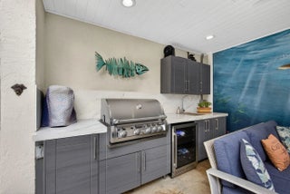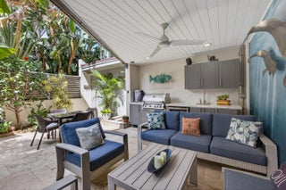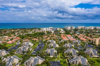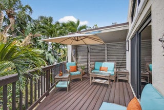 Rare opportunity to own a bright and private end-unit townhome in the highly desirable Sea Lofters community of Jupiter Ocean & Racquet Club—just a 3/10 of a mile walk to Jupiter's turquoise beaches, Carlin Park, Harbourside, dining, shopping, and the Maltz Jupiter Theatre. One of the few developments where monthly rentals are approved. You can enjoy your home part of peak season and earn rental income part of peak season! This light-filled residence features soaring ceilings and a dramatic wall of windows, creating an open, airy living space that captures the essence of coastal living. The thoughtfully designed outdoor kitchen and living area offers a seamless indoor-outdoor flow, The two-level private courtyard, beautifully updated. Travertine flooring on the first level and Trek decking on the upper level and stairs. The custom outdoor kitchen with grill, sink and refrigerator creates the perfect setting for al-fresco dining, while the outdoor shower adds convenience after a day at the beach. The lofted primary suite overlooks lush tropical landscaping, offering a peaceful and private retreat. As an end unit, the home enjoys added privacy and abundant natural light throughout. Located in Jupiter Ocean & Racquet Club, residents enjoy a true walk-to-beach lifestyle along with exceptional rental flexibility—30-day rentals permitted up to 12 times per year—making this property ideal for seasonal use, investment potential, or full-time coastal living. Recent Updates Include: Cat 5 impact windows, outdoor kitchen (2023), outdoor shower (2023), AC compressor (2023), kitchen range (2021), garbage disposal (2021), underground irrigation system with rain sensor (2023), and landscape up lighting with remote controls (2023). New Roof in 2016. Note: Wall art throughout the bi-level courtyard and home does not convey.