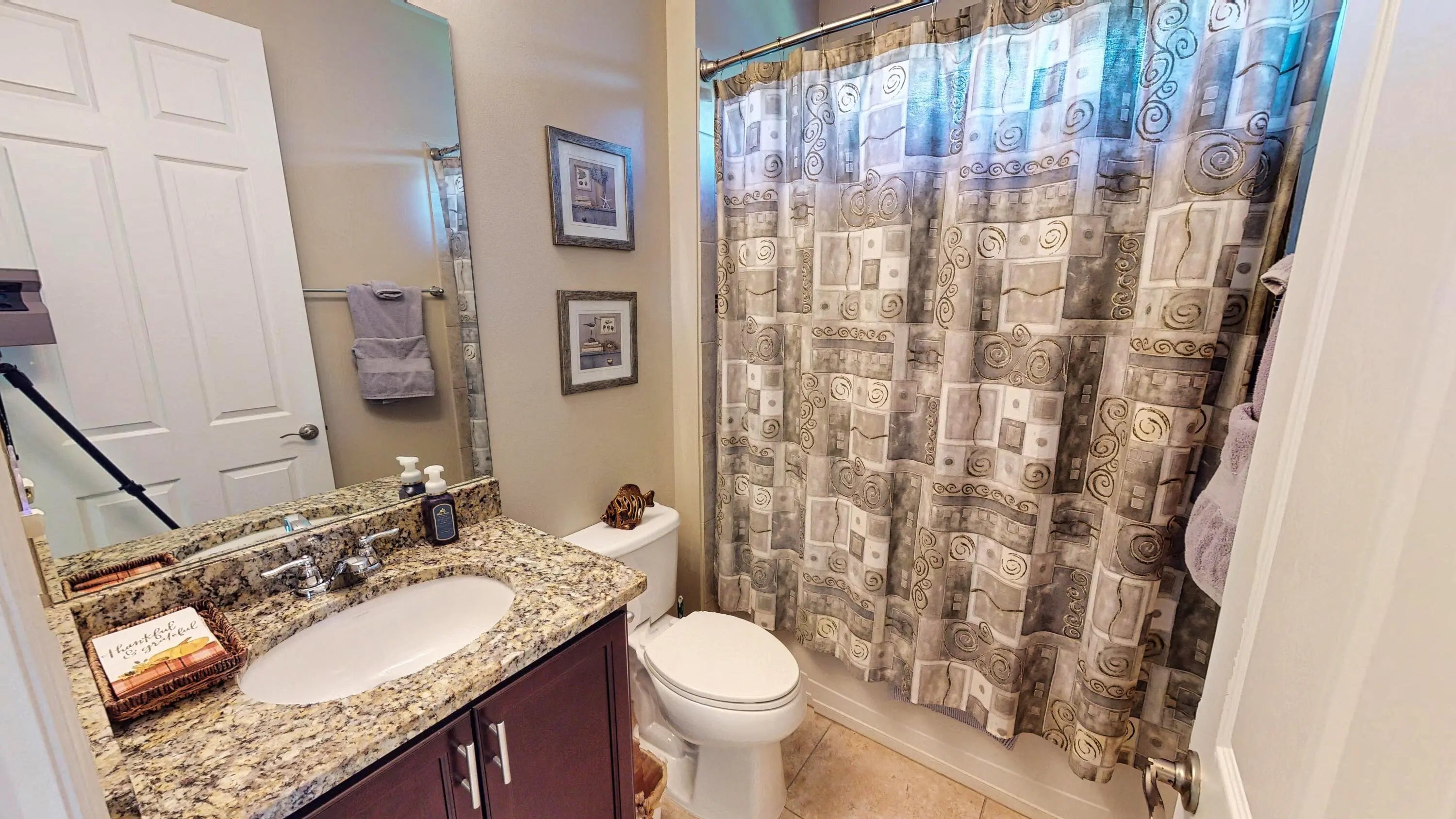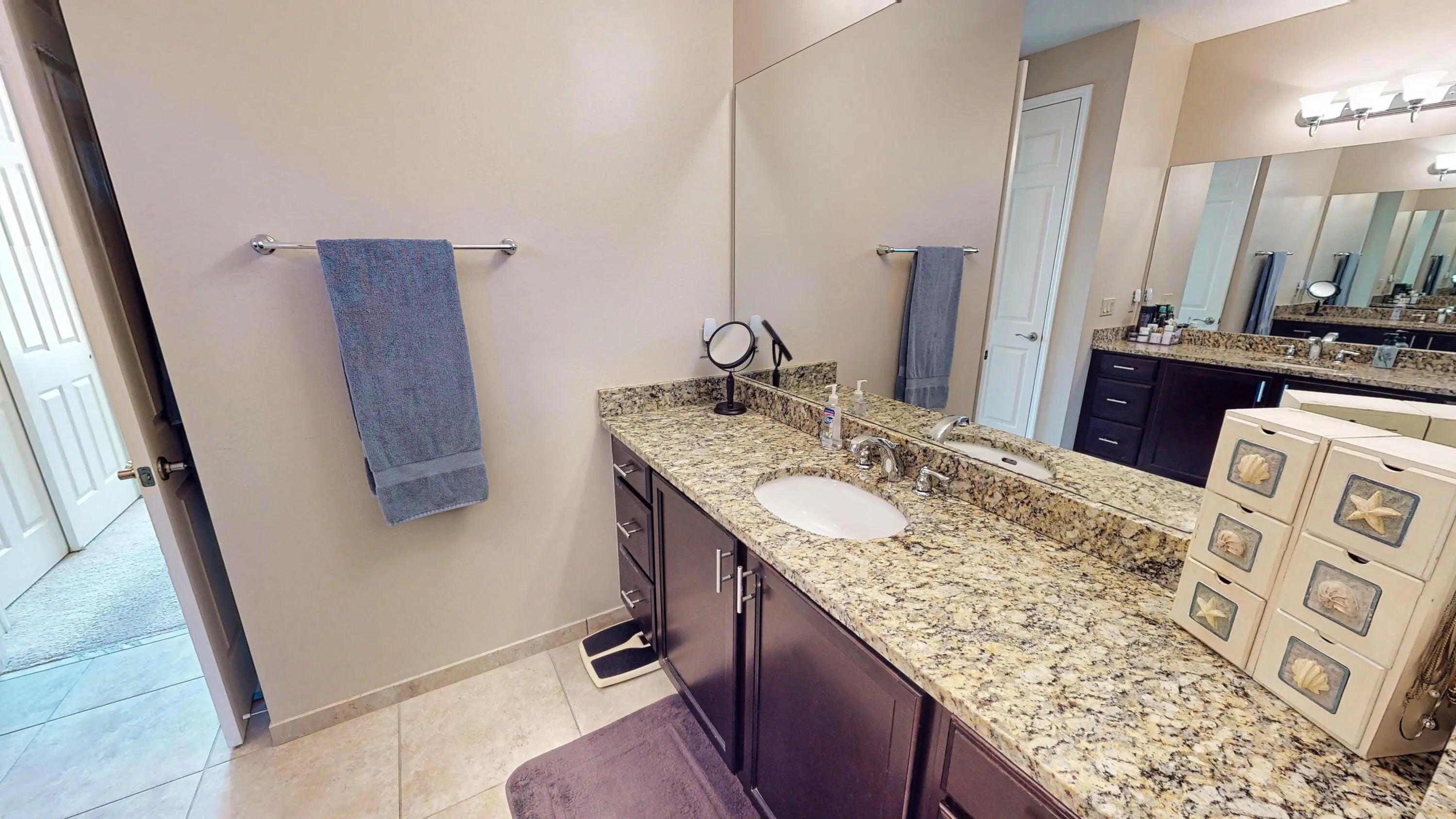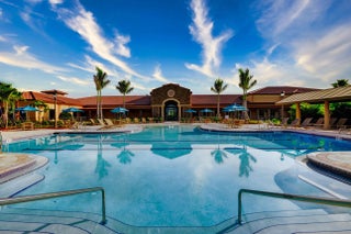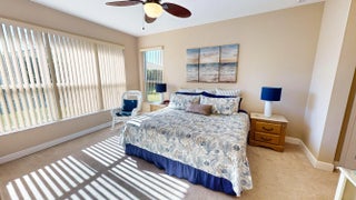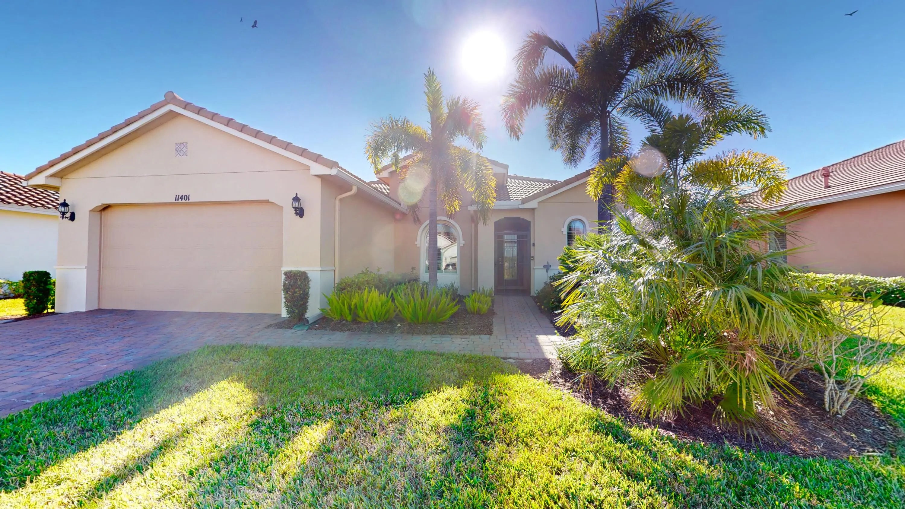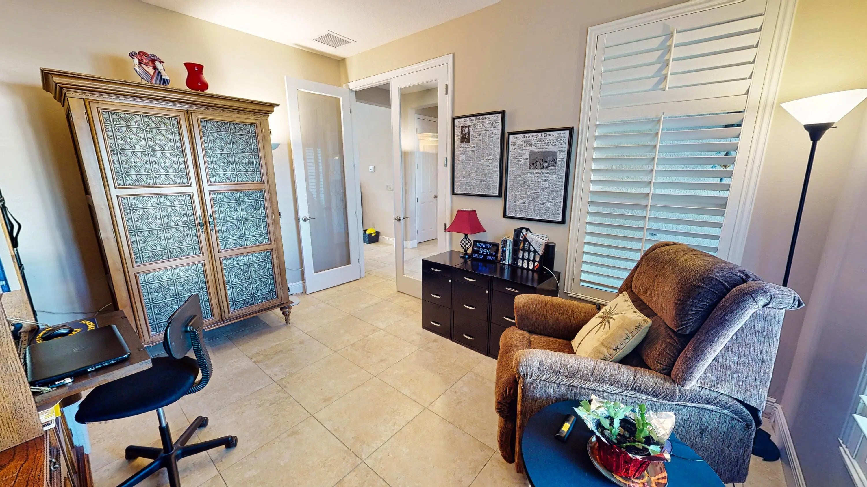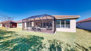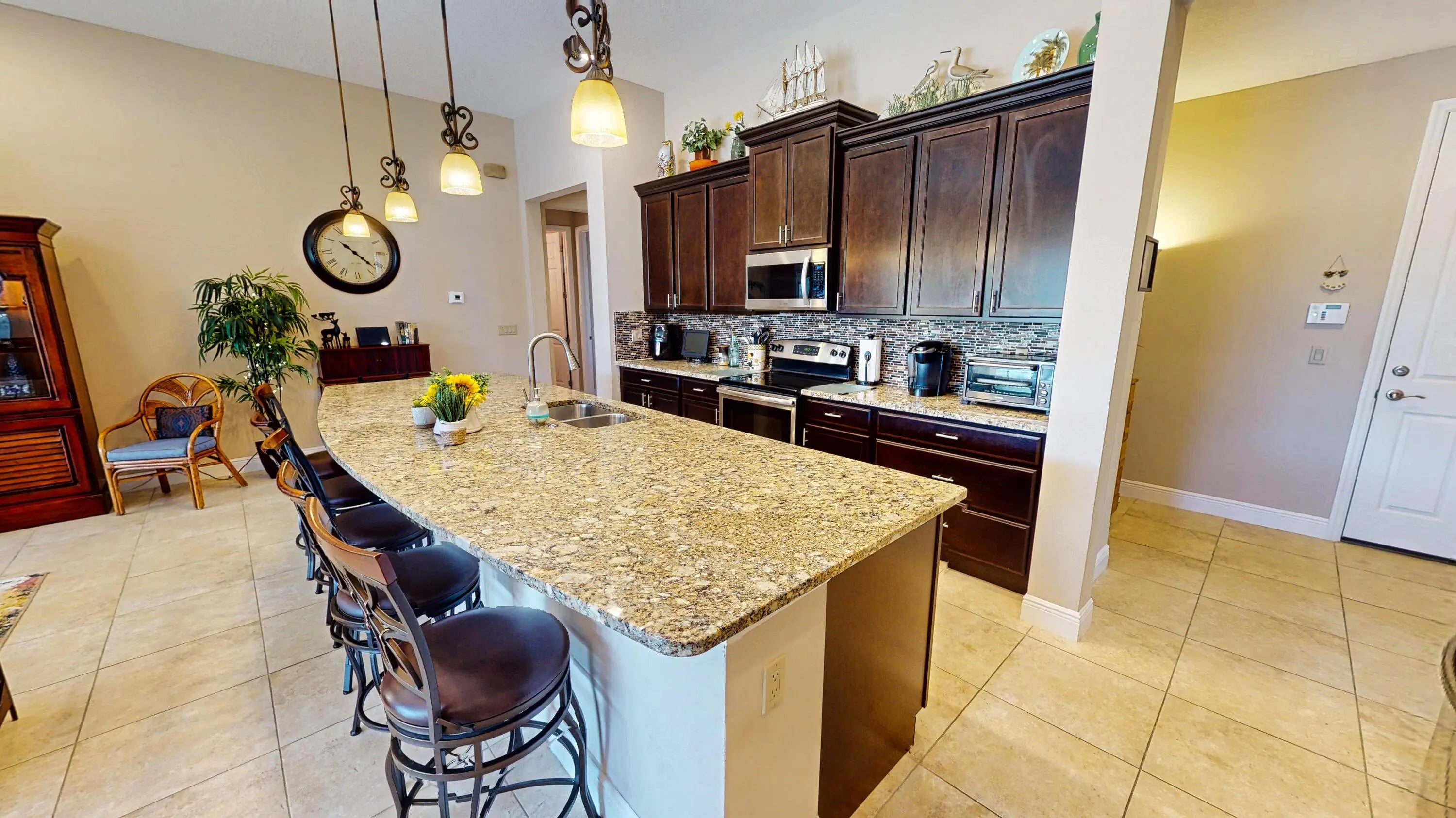 This stunning 3-bedroom, 3-bathroom home with nearly 2,300 square feet of living space offers a thoughtfully designed open floor plan perfect for modern living. The dual master suites each feature spacious walk-in closets, his-and-her sinks, and elegant stand-up showers, providing a luxurious retreat for homeowners or guests. The expansive chef's kitchen, complete with a giant center island, overlooks the dining and living areas, seamlessly connecting to the family room with soaring high ceilings--an entertainer's dream. The 16-foot sliding doors lead to a private, extended, and screened lanai, perfect for relaxing or hosting gatherings year-round. A separate guest room ensures privacy for visitors, while the versatile den adds flexibility for an office, library, or hobby space.