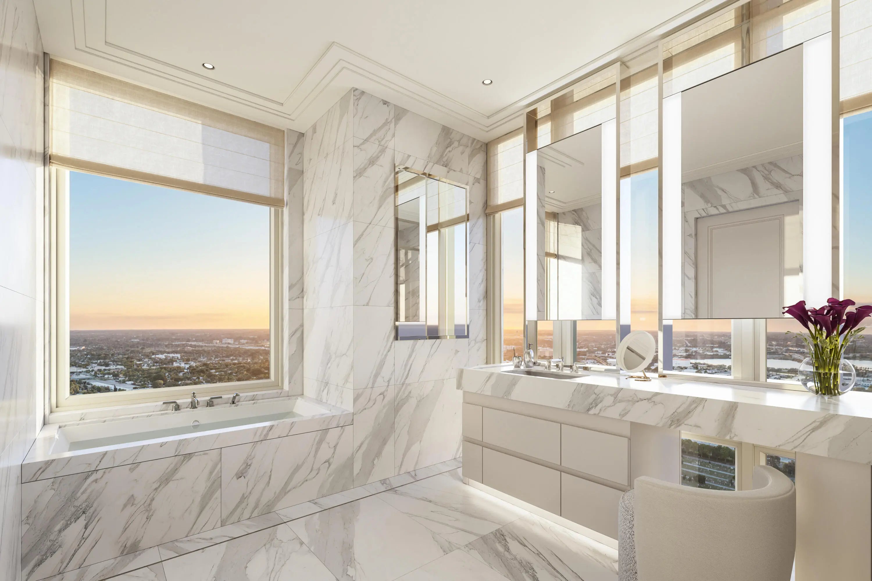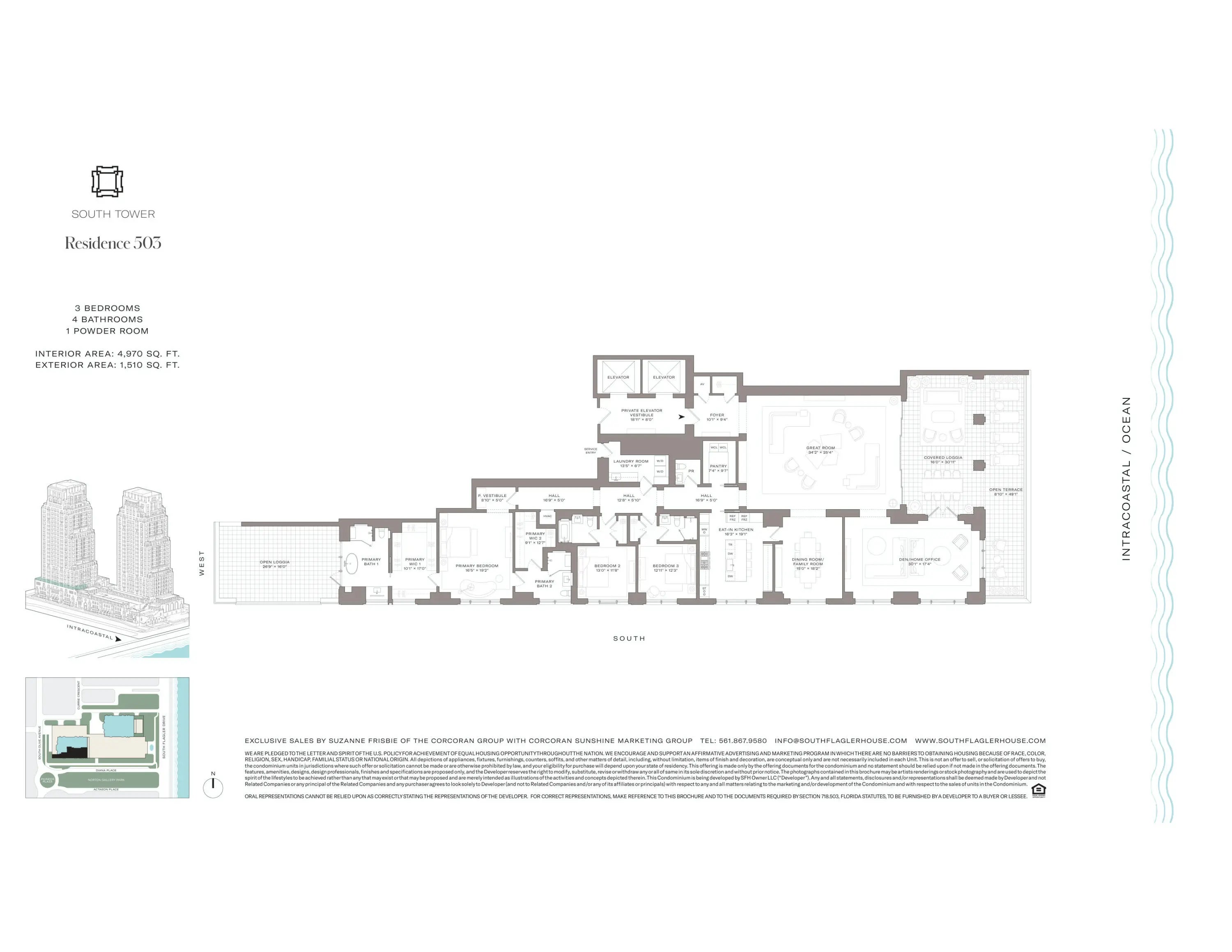 South Tower Residence 503 at South Flagler House captures the essence of waterfront living with 3 BR and 4.1 BA designed for elegance and ease. A private elevator opens to a sunlit great room with sweeping views of the Intracoastal, Palm Beach Island, and the Atlantic Ocean. The primary suite is a serene retreat with dual baths & dual walk-in closets. Thoughtfully designed for both comfort and entertaining, the residence features an eat-in kitchen and a library/office. Dual loggias, positioned on the east and west sides, offer expansive outdoor living that flows effortlessly from the interiors. South Flagler House, presented by Related Ross, combines the timeless style of Robert A.M. Stern Architects & the luxurious aesthetic of Pembrooke & Ives, resulting in soulful spaces designed for an enhanced lifestyle. Primely positioned on 3.4 acres along the Intracoastal Waterway at 1355 S Flagler Dr. South Flagler House features two 28-story structures with 105 beautifully appointed 2-to-5-bedroom homes. Representing the single largest amenity offering per residence in all of Palm Beach County. Residents will have access to lifestyle amenities of unprecedented range & quality, with on-site concierge services surpassing those of the most exclusive private members' clubs.
