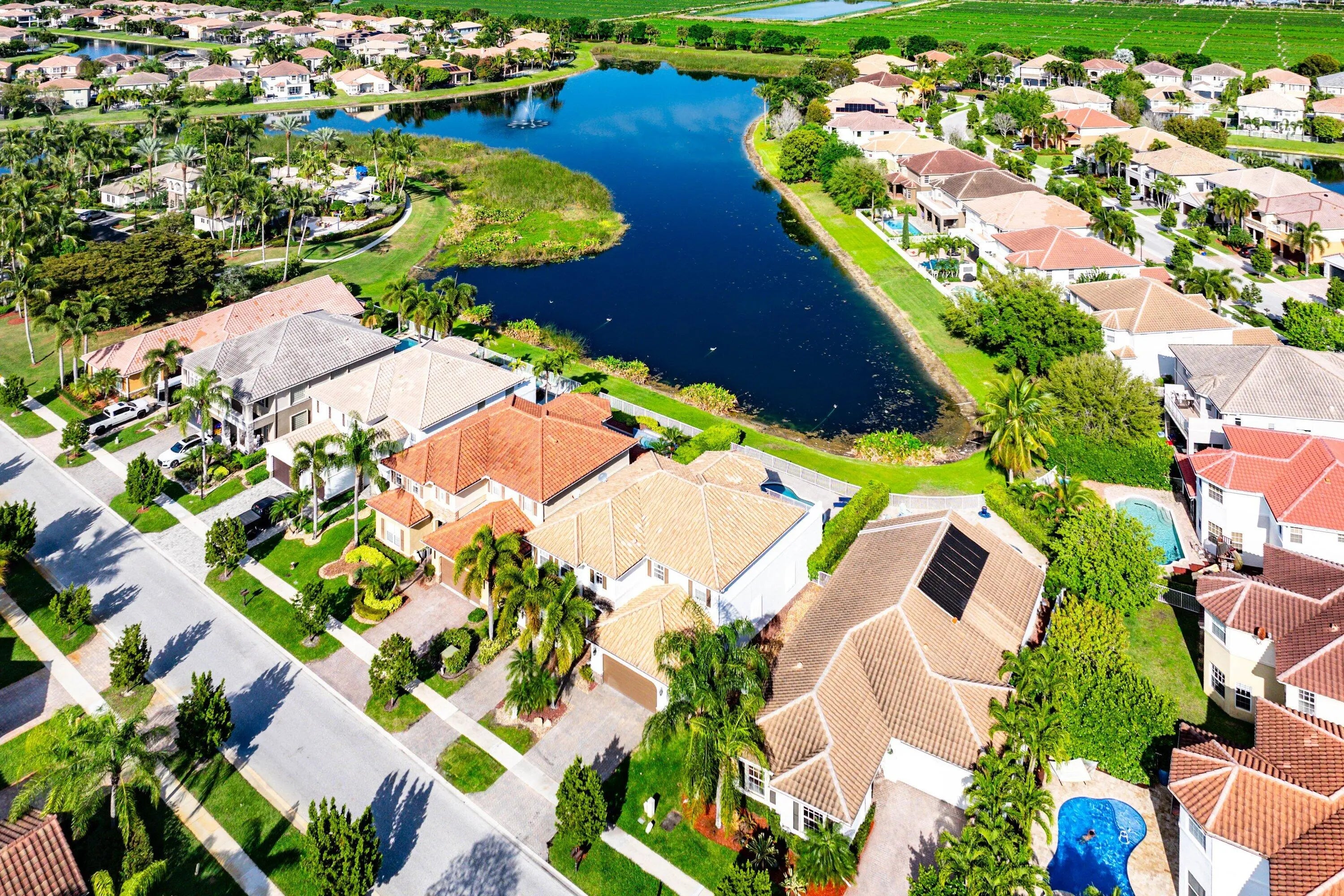 Former builder's model on a prime lakefront lot in sought-after Cobblestone Creek. This spacious 5-bedroom residence offers nearly 4,000 sq ft of living space, with a private pool, expansive living areas, and beautiful water views. Interior highlights include a gourmet kitchen with newer stainless appliances, marble flooring throughout the first floor, hardwood floors throughout the second floor, hurricane-impact glass throughout, and a private balcony off the primary bedroom. Additional features include a 2-car garage and a 3-car driveway with ample parking. Located in a gated community with resort-style amenities including a clubhouse, fitness center, pool, spa, billiards lounge, children's aqua park, and beautifully maintained grounds, all in a desirable Boynton Beach location. Cobblestone Creek is beautifully set across 100 lushly landscaped acres in Boynton Beach, offering a scenic and welcoming atmosphere from the moment you arrive. A grand entrance with cascading waterfalls, colorful flowers, tropical greenery, and mature trees creates a striking first impression and sets the tone for this exceptional gated community. Adding to its appeal, the neighborhood features nearly 20 acres of lakes and natural wetland preserves, giving Cobblestone Creek a tranquil, picturesque setting that feels both private and beautifully connected to nature. With just 250 single-family homes, many of which back to shimmering lakes or lushly landscaped berms, the community offers an intimate and peaceful residential environment. Residents enjoy a resort-style lifestyle with an impressive clubhouse complex that includes a fully equipped fitness center, billiards lounge, and club room. Outside, large covered verandas surround the recently remodeled saltwater pool and heated spa, while rushing water features, a children's aqua park, shade cabanas, and a scenic lake with fountain and preserve views create a true retreat-like atmosphere. Ideally located just off Boynton Beach Boulevard and Lyons Road, Cobblestone Creek offers convenience along with beauty. Residents benefit from a 24-hour manned gatehouse, A-rated schools, and close proximity to shopping, dining, Canyon Town Center, Cobblestone Commons, Bethesda West Hospital, Florida's Turnpike, and US-441. HOA dues are also reasonable and include expanded cable and high-speed internet, making Cobblestone Creek an exceptional place to call home.