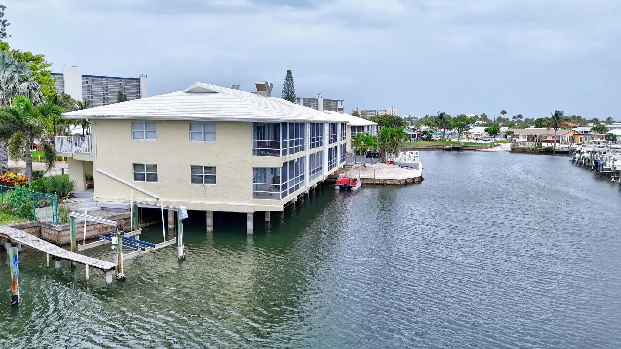 Price improvement!Beautiful St. Lucie Riverfront condo on Hutchinson Island in Jensen Beach. RARE - COMES WITH DEEDED DOCK. Double wide dock w/NEW pilings, electric & lift. 20,000lb capacity. Fits 10.9W x 31L boat. Must see top floor newly renovated condo! Sunset views from balcony, living room, main bedroom,Kitchen. Sunrise views from kitchen, 2nd bedroom. King size bed. All electric, plumbing, bathrooms, ceilings, walls, Impact doors & windows, flooring, kitchen have been renovated and are brand new. Luxury leather granite counter tops, Quartz kitchen sink, Italian stove, soft close cabinetry, Washer/Dryer & more. Come spend time playing in the Ocean at your deeded beach & tiki hut. Close to restaurants, shops & beaches. Pet allowed. Rented. Rental income to new owner. Furnished.
