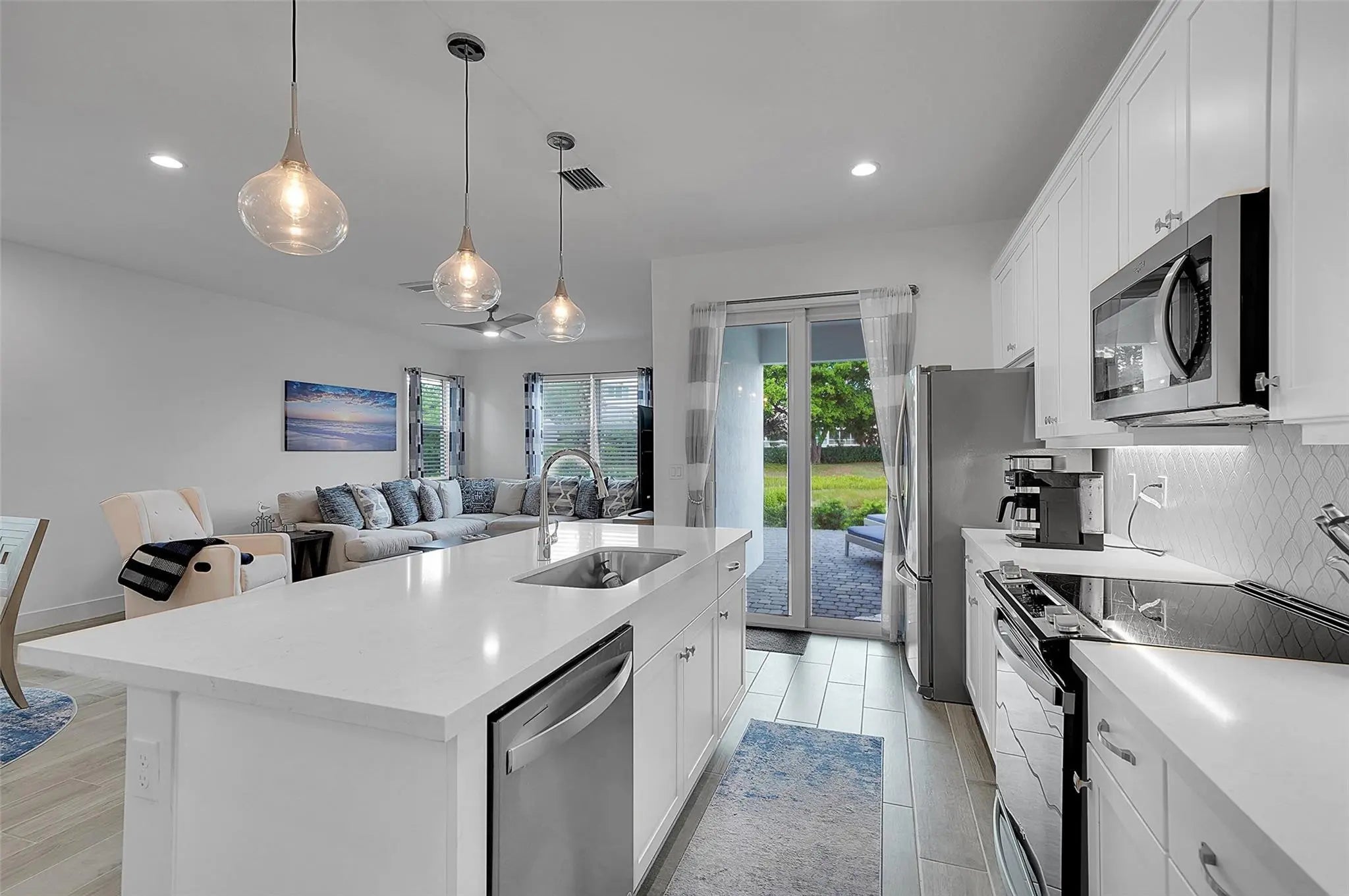 Welcome to this beautifully designed townhome featuring three spacious bedrooms plus a versatile bonus room, perfect for a home office, media room, or guest room. Offered fully furnished. Nestled in the heart of Deerfield Beach, you're just minutes from pristine Florida beaches, upscale shopping, fine dining, and convenient transportation. Built in 2023, this home boasts premium finishes throughout including a gourmet island kitchen with quartz countertops, upscale lighting fixtures, wood-look tile flooring in all living areas, and impact windows and doors for security, protection and energy efficiency. Step outside to your private paver patio overlooking a tranquil lake. Whether you are seeking luxury, location, or lifestyle--this townhome delivers it all.