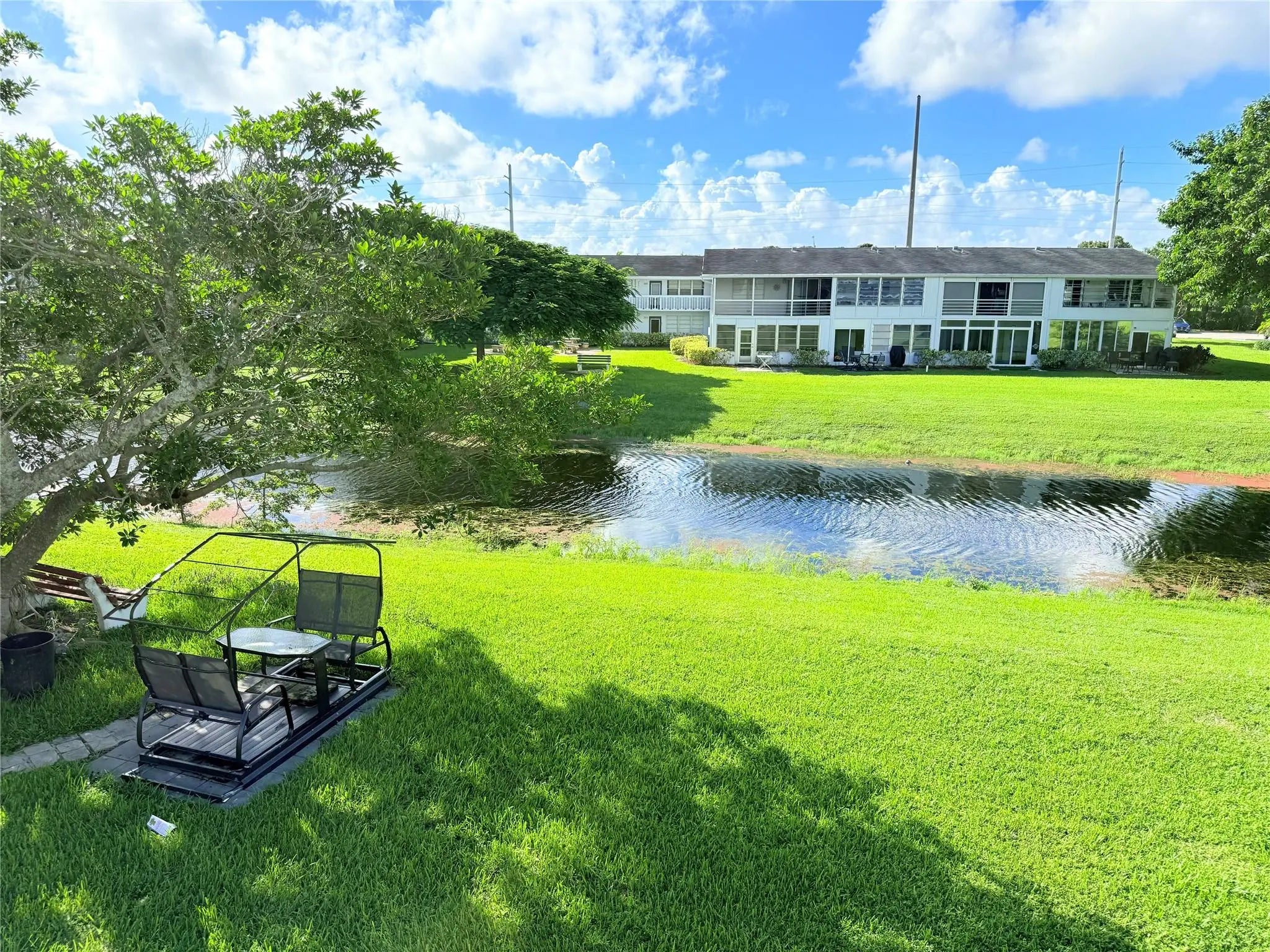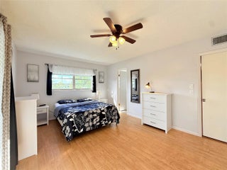 BRIGHT & VERY WELL MAINTAINED 1 bed, 1.5 bath CORNER unit on the 2nd floor with garden views from the living room. Sold TURNKEY FURNISHED, featuring wood-look laminate floors, updated kitchen, and water heater (2022). Very large bedroom with a wall of closets and a Florida room with ROLL-DOWN SHUTTERS. Located in a well-kept building on a PEACEFUL CUL-DE-SAC with serene WATER VIEWS FROM BBQ & PICNIC AREA. This vibrant 55+ community offers heated pools, tennis, pickleball, billiards, ping pong, mini golf, clubhouse, live shows, art classes, fitness center, and more. Minutes to shops, restaurants, highways, and beautiful beaches—ideal for year-round living or a relaxing getaway.
