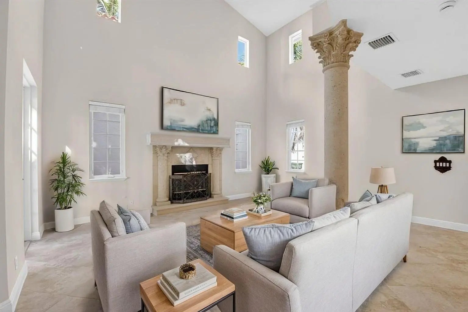 LOCATION! LOCATION! LOCATION! LOOK NO FURTHER. One mile away from the beach and 1 1/2 mile from the buzzing nightlife and gourmet restaurants of downtown Atlantic Avenue. The open living home has high Cathedral ceilings with 1/2 bath plus den/office/library and partially covered outdoor patio with a 3 car garage. A beautiful 6 foot chandelier lights up a circular stairway to 3 large bedrooms upstairs with roomy closets and each with a private bath. House is well maintained and newly painted. Windows and doors are all hurricane impact with plush landscaping maintained by the HOA. Don't miss out on this beautiful gated community of Old Palm Grove in East Delray with low maintenance fees.