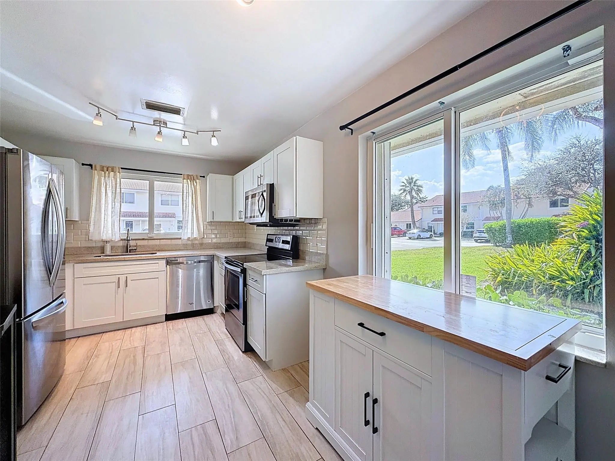 Beautiful lake views welcome you home to this updated one-story, 2-bedroom, 2-bath corner townhouse/villa. Recent modern renovations include smooth ceilings (popcorn removed), porcelain wood-grain flooring throughout, and full impact glass windows and sliders installed October 2021. Both bathrooms have been renovated, and the remodeled kitchen features white cabinetry, granite/quartz countertops, and stainless steel appliances. Ideally located in Boca Raton with easy highway access and top-rated Boca schools. Enjoy a community heated pool and jacuzzi in this well-maintained neighborhood.