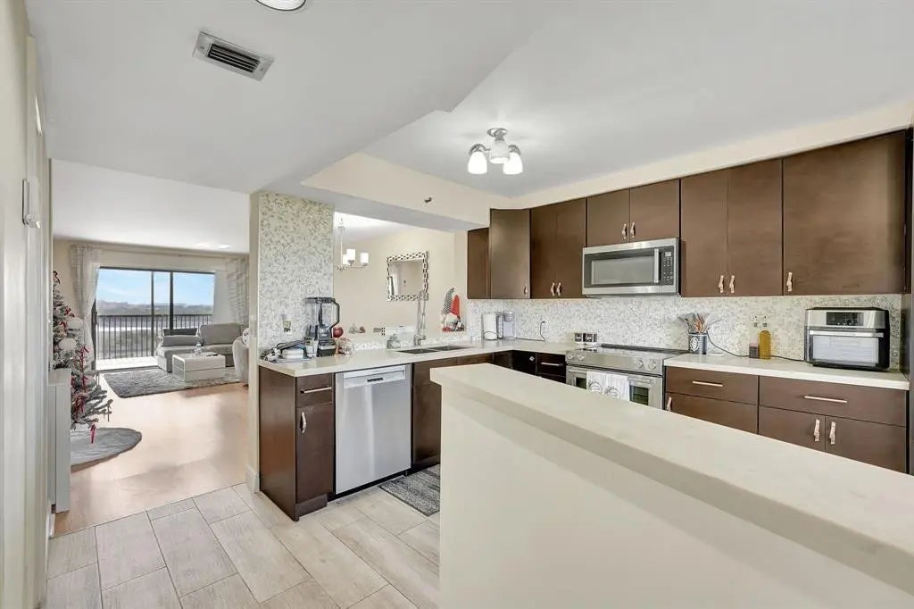 Welcome to your dream penthouse! This beautifully updated condo offers serene water views of the canal. The modern eat-in kitchen is equipped with sleek stainless steel appliances, perfect for culinary enthusiasts. Enjoy gatherings on the screened-in balcony. The primary bedroom boasts two spacious walk-in closets and an owner's bath with a luxurious oval soaking tub. A large guest bath features a walk-in shower. This pet-friendly community is a nature lover's paradise with a preserve, jog trails, gym, two clubhouses, sauna, spa, two heated pools, BBQ areas, and plenty of parking. Conveniently located near shops, dining, golf, and a short drive to the beach and casino. Includes in-suite laundry and a storage unit. Ideal for all ages—your perfect home awaits!