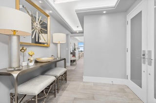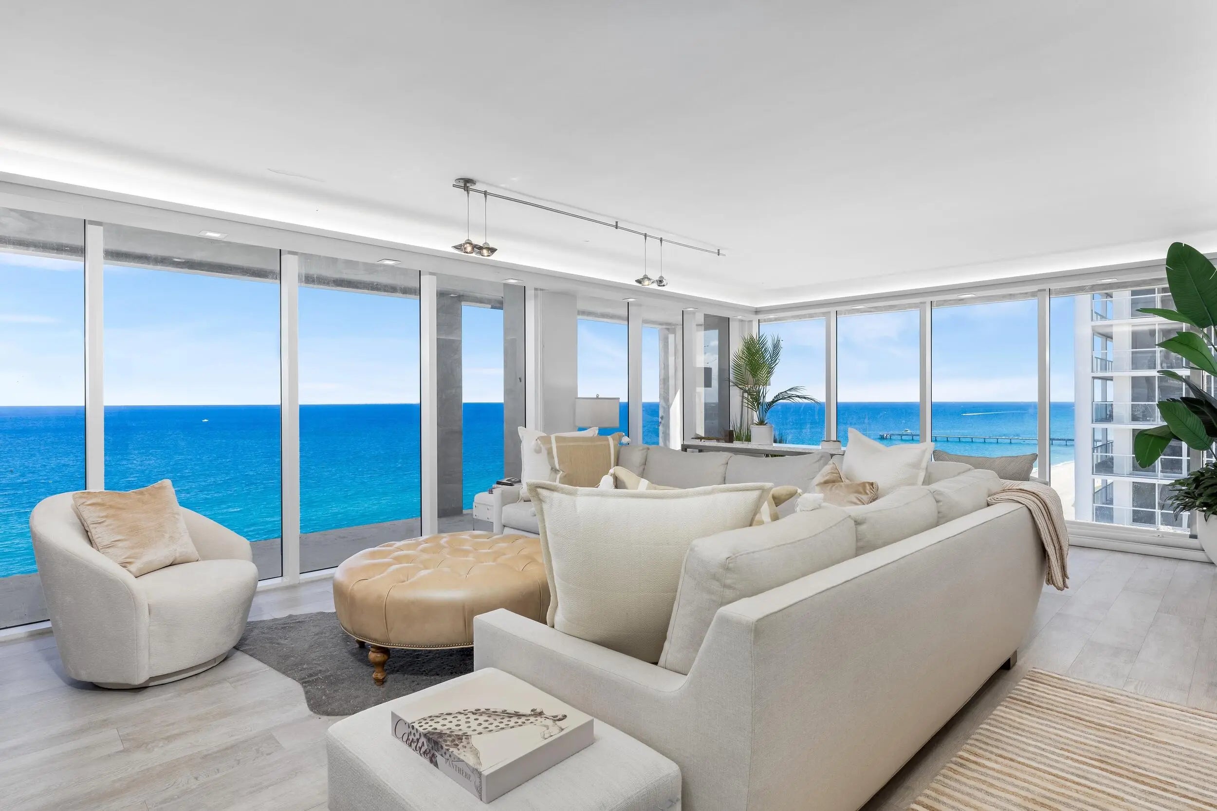 Experience the pinnacle of coastal elegance at 2800 South Ocean Boulevard, Residence 18F. This distinguished southeast corner residence, perched high above, offers sweeping panoramic ocean views. Encompassing approximately 2,150 square feet, this meticulously renovated home features an expansive oceanfront wrap-around balcony, complemented by an additional covered balcony off the west-facing primary bedroom—perfect for savoring both sunrise and sunset in sublime comfort. Crafted with contemporary refinement and practical sophistication, the open-concept kitchen and living areas harmoniously blend, creating an ideal setting for both intimate gatherings and grand entertaining. The seamless integration of clean lines and elegant finishes is accentuated by floor-to-ceiling glass panes that frame breathtaking ocean vistas. Impact-resistant windows throughout ensure tranquility, while motorized shades provide effortless control over ambiance. The home showcases elegant porcelain tile that beautifully mimics the warmth of wood throughout its expansive layout. Culinary enthusiasts will appreciate the state-of-the-art Miele kitchen appliances, complemented by motorized kitchen cabinets that combine functionality with contemporary design. Custom closets offer ample storage with a refined touch, while thoughtfully curated lighting enhances the overall aesthetic. The primary suite serves as a serene retreat, featuring a spacious sitting area that can function as a cozy lounge or be transformed into a third bedroom to suit your needs. Two newly renovated and exquisitely appointed full bathrooms, along with a beautifully designed powder room, ensure unparalleled comfort and luxury. The Ocean Towers condominium offers exclusive amenities, including direct private beach access, two resort-style swimming pools, and a cutting-edge fitness center with stunning ocean views. The community is safeguarded by a full-time security staff, doorman, and on-site building manager. Residence 18F is also accompanied by two dedicated garage spaces and additional storage for ease and practicality. This remarkable residence exemplifies beachfront luxury, combining sophisticated living with every modern convenience.