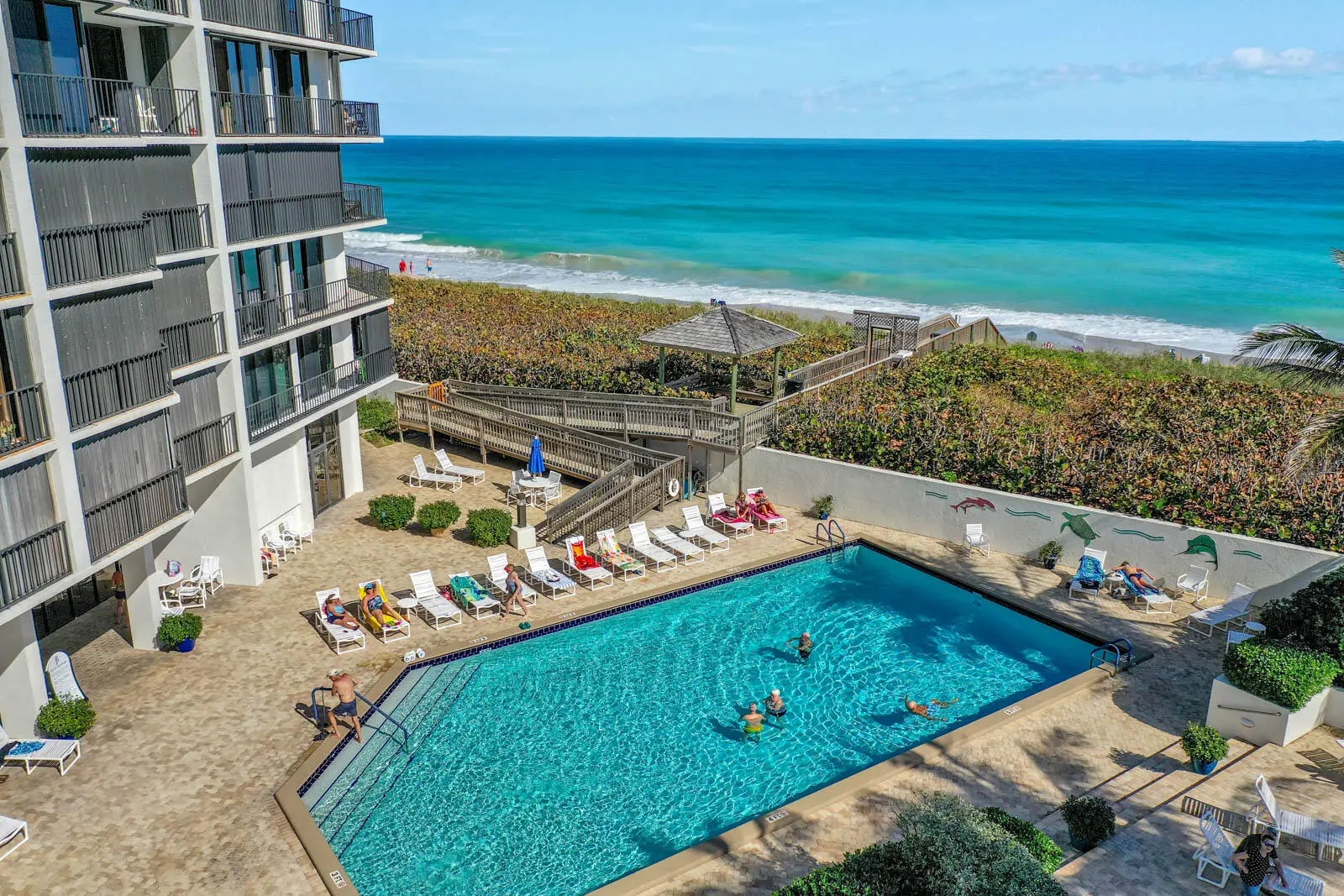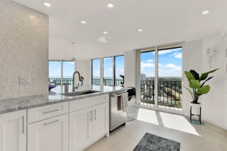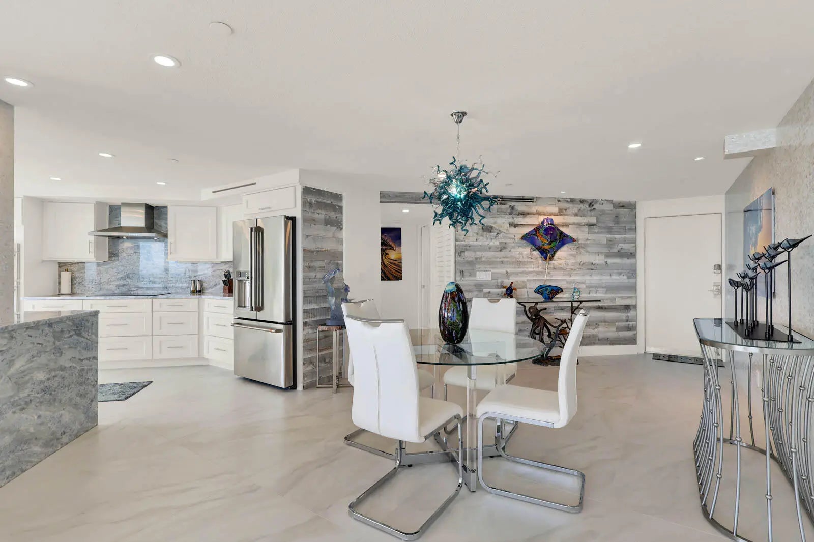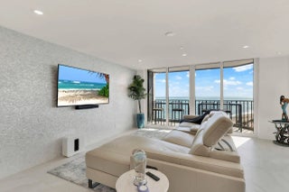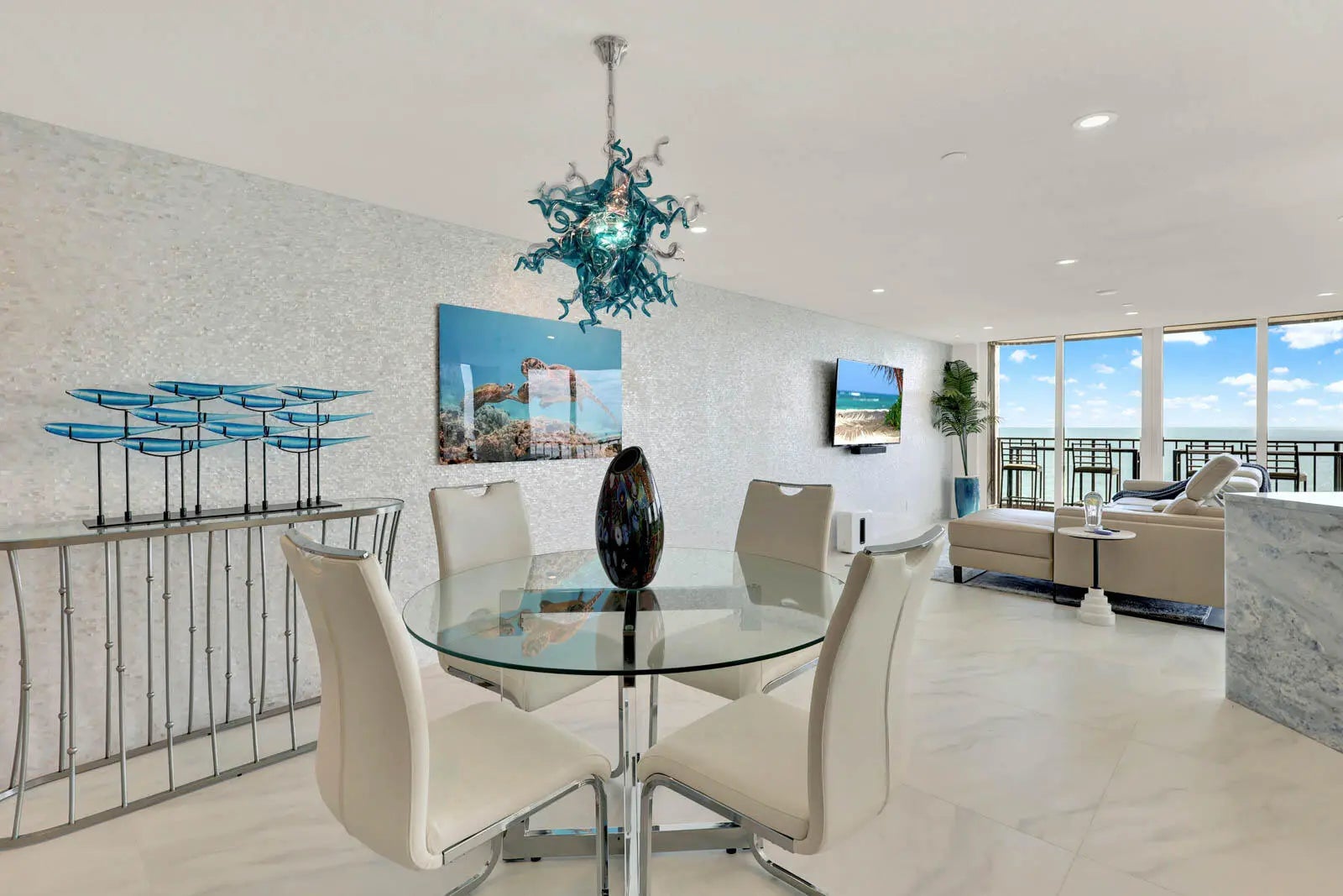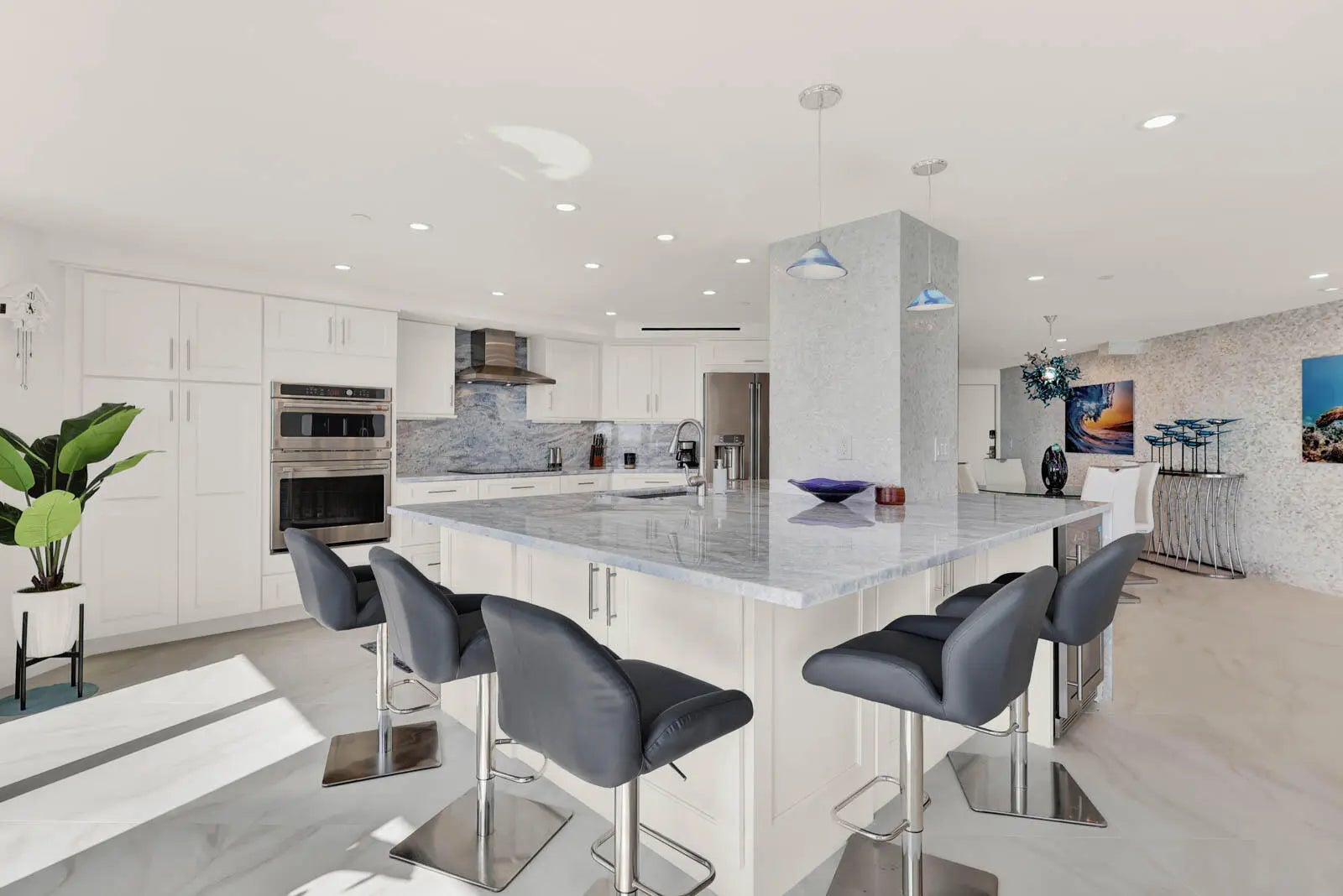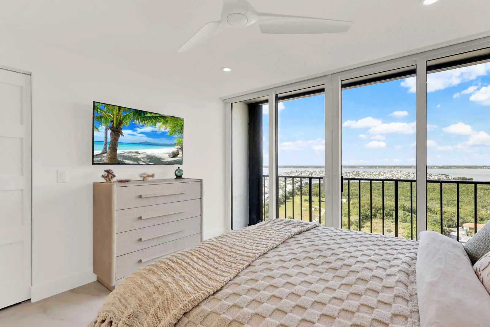PRINCESS ON HUTCHINSON ISLAND - 2BR/2BA renovated SE end unit. Watch sunrises and sunsets with Ocean and Intracoastal/River views. Features include: renovated in 2024, impact sliders, 36'' ceramic tile, Hunter Douglas electric black out shades, textured ceiling, 6'9'x 8'5' marble center island in kitchen, marble counters in kitchen & bathrooms, shaker-style doors, shaker-style cabinets throughout, 2x4 ceramic tile on walls in bathrooms, Nickel Gap walls, Mother of Pearl tile wall, re-claimed wood planking wall, 3 separate balconies, walk-in closets with custom shelving, full size washer/dryer and so much more! A 3-D Floor plan is in photos. Community amenities include gated, social room with kitchen, billiards, fitness rooms, sauna, pool, tennis, putting green, bocce ball, boat trailer/ RV parking and dune walk to beach. MIRS and SIRS have both been completed. All sizes, taxes, descriptions and HOA are approximate; there may be inaccuracies, independent verification is suggested.