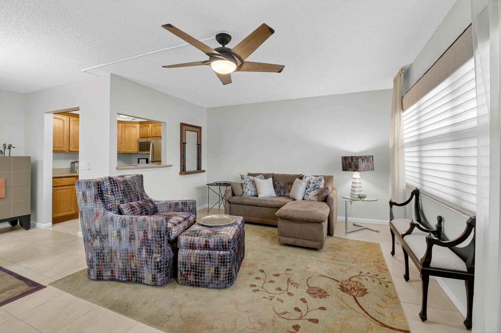 Century Village East condo in desirable Berkshire B Section near the clubhouse. This FIRST FLOOR condo, 1 bedroom 1.5 bath has custom window treatments and central ac- updated in 2023. The fully enclosed patio/ Florida room boasts a lush garden view & a peak of the Berkshire pool. There is tile flooring on the patio and a full set of accordion hurricane shutters. Short walk to houses of worship. Security gated complex, 55+ active adult, Century Village community. Perfect for relaxing or entertaining, resort-style amenities & a vibrant social scene. Theatre. Indoor & Outdoor pools; gym, group training, pickle ball, tennis, shuffle board, hobby rooms & classes. Free bus transportation inside & out, parking in front of this building. This is a non rental building.