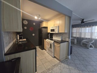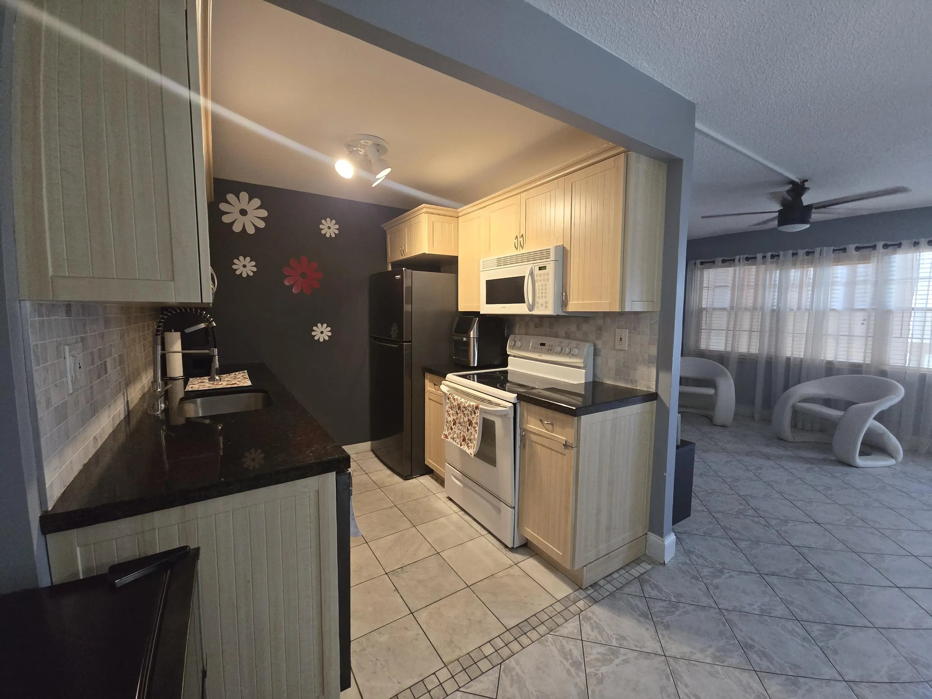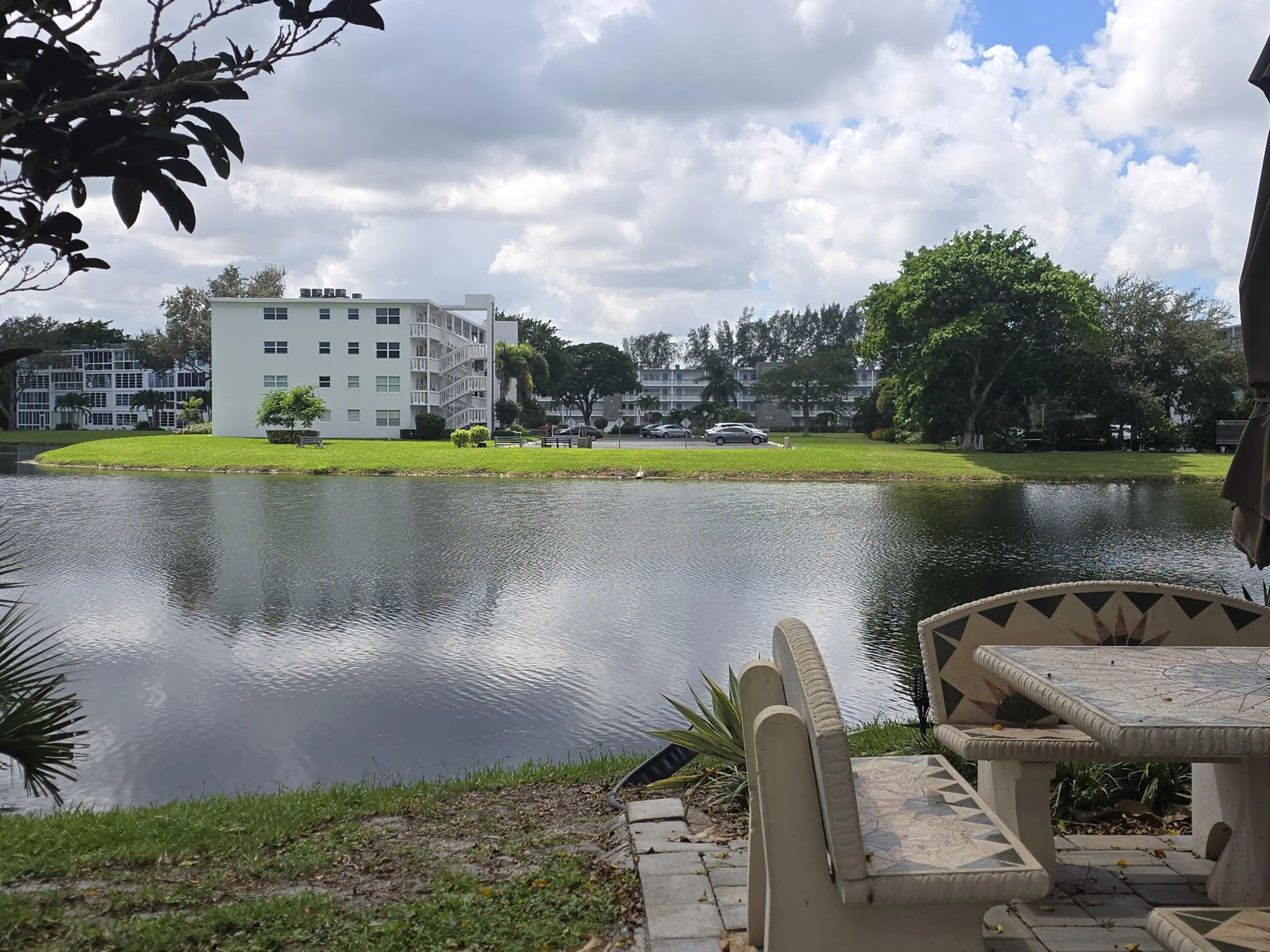 Don't miss this charming 1 bed/ 1.5 bath condo. The condo offers all tile and an oversized bedroom. The updated kitchen features, rich wood cabinets and granite countertops. A Murphy bed adds flexible space for guests. Recent upgrades include an updated electric panel, 2017 AC, tankless water heater 2022, plus a new refrigerator and dishwasher in 2022. Relax and enjoy the water view from your enclosed patio with laminate flooring. The building also provides a patio by the lake, ideal for peaceful Florida evenings. This condo is conveniently located near the main entrance, close to elevator and great assigned parking spot. Century Village offers resort-style living w endless activities, clubs, transportation services, and much more. Located near places of worship, shops, highways and beach.